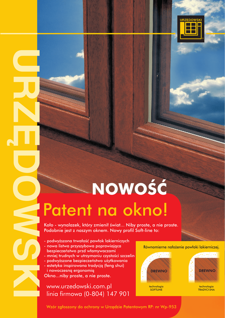 NOWOŚĆ Patent na okno! Koło - wynalazek, który zmienił świat... Niby proste, a nie proste. Podobnie jest z naszym oknem. Nowy profil Soft-line to: - podwyższona trwałość powłok lakierniczych - nowa listwa przyszybowa poprawiająca bezpieczeństwo przd włamywaczami - mniej trudnych w utrzymaniu czystości szczelin - podwyższone bezpieczeństwo użytkowania - estetyka inspirowana tradycją (feng shui) i nowoczesną ergonomią Okno...niby proste, a nie proste. www.urzedowski.com.pl linia firmowa (0-804) 147 901 Równomierne nałożenie powłoki lakierniczej. DREWNO technologia SOFTLINE Wzór zgłoszony do ochrony w Urzędzie Patentowym RP: nr Wp-953 DREWNO technologia TRADYCYJNA