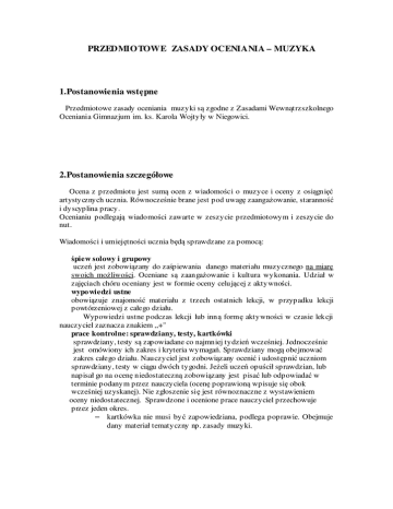 PRZEDMIOTOWE ZASADY OCENIANIA – MUZYKA 1.Postanowienia wstępne Przedmiotowe zasady oceniania muzyki są zgodne z Zasadami Wewnątrzszkolnego Oceniania Gimnazjum im. ks. Karola Wojtyły w Niegowici. 2.Postanowienia szczegółowe Ocena z przedmiotu jest sumą ocen z wiadomości o muzyce i oceny z osiągnięć artystycznych ucznia. Równocześnie brane jest pod uwagę zaangażowanie, staranność i dyscyplina pracy. Ocenianiu podlegają wiadomości zawarte w zeszycie przedmiotowym i zeszycie do nut. Wiadomości i umiejętności ucznia będą sprawdzane za pomocą: śpiew solowy i grupowy uczeń jest zobowiązany do zaśpiewania danego materiału muzycznego na miarę swoich możliwości. Oceniane są zaangażowanie i kultura wykonania. Udział w zajęciach chóru oceniany jest w formie oceny celującej z aktywności. wypowiedzi ustne obowiązuje znajomość materiału z trzech ostatnich lekcji, w przypadku lekcji powtórzeniowej z całego działu. Wypowiedzi ustne podczas lekcji lub inną formę aktywności w czasie lekcji nauczyciel zaznacza znakiem ,,+'' prace kontrolne: sprawdziany, testy, kartkówki sprawdziany, testy są zapowiadane co najmniej tydzień wcześniej. Jednocześnie jest omówiony ich zakres i kryteria wymagań. Sprawdziany mogą obejmować zakres całego działu. Nauczyciel jest zobowiązany ocenić i udostępnić uczniom sprawdziany, testy w ciągu dwóch tygodni. Jeżeli uczeń opuścił sprawdzian, lub napisał go na ocenę niedostateczną zobowiązany jest pisać lub odpowiadać w terminie podanym przez nauczyciela (ocenę poprawioną wpisuje się obok wcześniej uzyskanej). Nie zgłoszenie się jest równoznaczne z wystawieniem oceny niedostatecznej. Sprawdzone i ocenione prace nauczyciel przechowuje przez jeden okres. – kartkówka nie musi być zapowiedziana, podlega poprawie. Obejmuje dany materiał tematyczny np. zasady muzyki. Skale stosowane w sprawdzaniu i ocenianiu. W przypadku sprawdzianów pisemnych, testów, kartkówek przyjmuje się następującą skalę: 90-100% wykonanych poleceń Bardo dobry 70-89% 60-69% 40-59% 39% i niżej dobry dostateczny dopuszczający niedostateczny Ocenę celującą może otrzymać uczeń, który wykazał się wiedzą wyrastającą ponad obowiązujący materiał.!!! 3. Kryteria wiedzy i umiejętności na poszczególne oceny szkolne. Postępy ucznia w przedmiocie artystycznym są szczególnie trudne do oceny. Celujący Uczeń: - ma opanowaną wiedzę z zakresu historii muzyki niejednokrotnie wykraczającą ponad ramy proponowanego materiału, - orientuje się w wybranych dziełach muzycznych, - zna podstawy pisma nutowego, - potrafi zapisać, zagrać i wyklaskać materiał z zasad muzyki, - zna repertuar muzyczny (piosenki, hymny, pieśni patriotyczne) – śpiewa na miarę swoich możliwości, - zna tradycje polskiej sztuki ludowej, - orientuje się w tradycjach kulturowych naszych sąsiadów, - uczęszcza na zajęcia chóru, lub w inny sposób jest aktywny w życiu artystycznym szkoły. Bardzo dobry Uczeń: - opanował wiedzę z zakresu historii muzyki, - orientuje się w wybranych dziełach muzycznych, - zna podstawy pisma nutowego - potrafi zapisać, zagrać i wyklaskać materiał z zasad muzyki, - zna repertuar muzyczny (piosenki, hymny, pieśni patriotyczne)- spiewa na miarę swoich możliwości, - zna tradycje polskiej sztuki ludowej, - orientuje się w tradycjach kulturowych naszych sąsiadów. Dobry Uczeń: - w 80% opanował wiedzę z zakresu historii muzyki, - zna podstawy pisma nutowego, - umie zapisać materiał z zasad muzyki, lecz ma już trudności z zagraniem i wyklaskaniem, - śpiewa: hymny, pieśni patriotyczne, piosenki, - orientuje się w tradycjach sztuki ludowej polskiej i odróżnia ją od innych krajów. Dostateczny Uczeń: - w 60% opanował wiedzę z zakresu historii muzyki, - ma problemy z poprawnym zapisem nutowym, - nie rozróżnia wartości nut, - zaśpiewał tylko hymn szkoły i hymn państwowy – jako zaliczenie, - słabo orientuje się w folklorze swojego kraju. Dopuszczający Uczeń: - w 30% opanował materiał z zakresu historii muzyki, - zapisuje poprawnie gamę C-dur w 30%, - zaliczył tylko ze śpiewu: hymn państwowy i hymn szkoły, - nie potrafi wymienić różnic i cech charakterystycznych dla folkloru ziemi polskiej. Niedostateczny Ocena stawiana jest w sytuacji jawnego przedmiotu. lekceważenia Uwagi dodatkowe: UCZEŃ JEST ZOBOWIĄZANY DO POSIADANIA ZESZYTU PRZEDMIOTOWEGO, W KTÓRYM POWINNY ZNAJDOWAĆ SIĘ WSZYSTKIE LEKCJE, NOTATKI I ZAPISKI. ZESZYT MA BYĆ PROWADZONY SYSTEMATYCZNIE. Ocena z zeszytu wliczana jest do oceny okresowej i końcoworocznej. BRAK ZESZYTU LUB LUKI W NOTATKACH SĄ JEDNOZNACZNE Z BRAKIEM ZALICZENIA OKRESU. Nie obowiązuje tzw. brak zeszytu przedmiotowego. Brak zeszytu to ocena niedostateczna. Z UWAGI NA ILOŚĆ GODZIN DYDAKTYCZNYCH- NIE MA MOŻLIWOŚCI ZGŁASZANIA NIEPRZYGOTOWANIA PRZEZ UCZNIA. Opracowała: mgr M aria Żyła