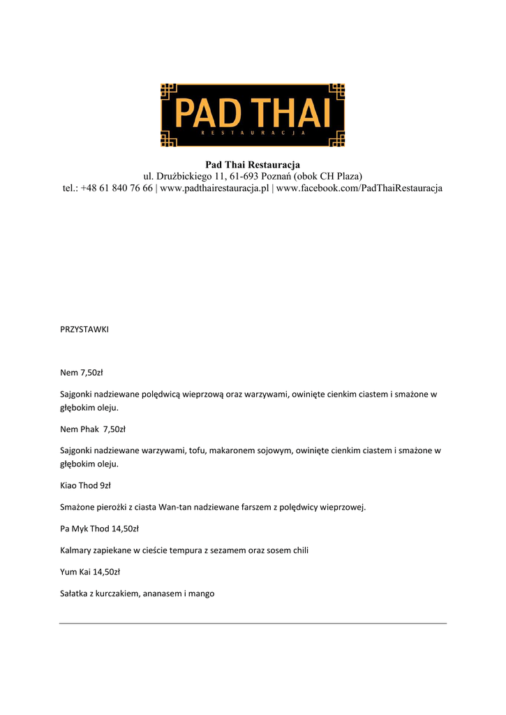 Pad Thai Restauracja ul. Drużbickiego 11, 61-693 Poznań (obok CH Plaza) tel.: +48 61 840 76 66 | www.padthairestauracja.pl | www.facebook.com/PadThaiRestauracja PRZYSTAWKI Nem 7,50zł Sajgonki nadziewane polędwicą wieprzową oraz warzywami, owinięte cienkim ciastem i smażone w głębokim oleju. Nem Phak 7,50zł Sajgonki nadziewane warzywami, tofu, makaronem sojowym, owinięte cienkim ciastem i smażone w głębokim oleju. Kiao Thod 9zł Smażone pierożki z ciasta Wan-tan nadziewane farszem z polędwicy wieprzowej. Pa Myk Thod 14,50zł Kalmary zapiekane w cieście tempura z sezamem oraz sosem chili Yum Kai 14,50zł Sałatka z kurczakiem, ananasem i mango ZUPY Tom Kha Kai 10,50zł Tajska zupa na bazie mleczka kokosowego, limonki i trawy cytrynowej z dodatkiem kurczaka Tom Yum Kung 11zł Pikantna tajska zupa z krewetkami i kolendrą oraz grzybami shitake Keng Kai Wan 9,5zł Słodko – kwaśna zupa z dodatkiem ananasa , papryki i kurczaka DANIA GŁÓWNE Pad thai Kai 19,50zł Makaron ryżowy smażony z jajkiem z dodatkiem kurczaka, warzyw i kiełków mung Phaneng Kai 18zł Pikantne danie na bazie pasty curry oraz mleczka kokosowego, z dodatkiem liści limonowych, trawy cytrynowej i piersi kurczaka. Kai a`la Chef 21,50zł Smażone kawałki piersi z kurczaka z dodatkiem warzyw oraz orzechów nerkowca. Kai priao Wan 18zł Smażone kawałki piersi z kurczaka z warzywami oraz ananasem w słodko-kwaśnym sosie. Mu Thod Kathiem 20,50zł Smażona polędwica wieprzowa z czosnkiem, warzywami oraz swieżo mielonym pieprzem SUSHI Karai Set (18szt) 27zł Futomaki z grillowanym łososiem na ostro 6 szt., Ebiten na ostro 6 szt., Hosomaki z tuńczykiem i porem na ostro 6 szt. Amai Set (23szt) 32zł Datemaki z grillowanym łososiem na słodko 6 szt., Ebiten 6 szt., California z grillowaną rybą maślaną na słodko 5 szt., Hosomaki z ogórkiem 6 szt. DESERY Woon Ma Plow Mamuang 10zł Galaretka z mleka kokosowego, pulpy mango z kawałkami mango Lody w tempurze 11zł Waniliowe lody w puszystym cieście, obtoczone w tempurze i smażone w głębokim oleju