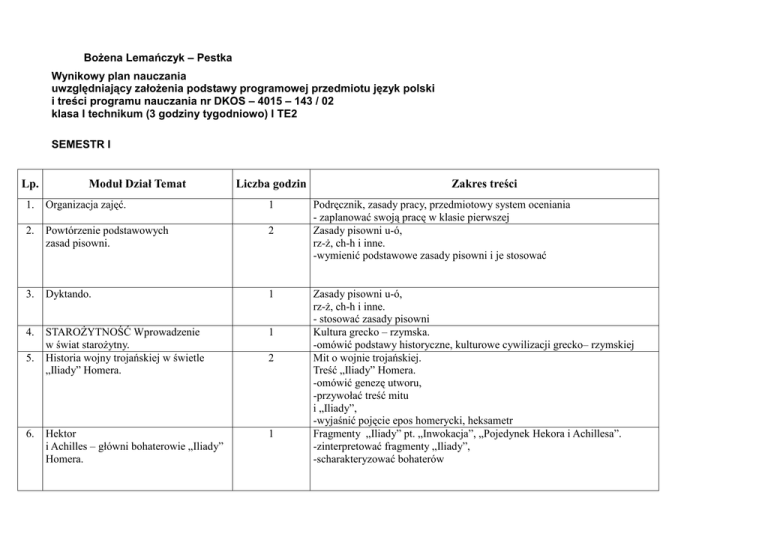 Bożena Lemańczyk – Pestka Wynikowy plan nauczania uwzględniający założenia podstawy programowej przedmiotu język polski i treści programu nauczania nr DKOS – 4015 – 143 / 02 klasa I technikum (3 godziny tygodniowo) I TE2 SEMESTR I Lp. Moduł Dział Temat Liczba godzin 1. Organizacja zajęć. 1 2. Powtórzenie podstawowych zasad pisowni. 2 3. Dyktando. 1 4. STAROŻYTNOŚĆ Wprowadzenie w świat starożytny. Historia wojny trojańskiej w świetle „Iliady” Homera. 1 Hektor i Achilles – główni bohaterowie „Iliady” Homera. 1 5. 6. 2 Zakres treści Podręcznik, zasady pracy, przedmiotowy system oceniania - zaplanować swoją pracę w klasie pierwszej Zasady pisowni u-ó, rz-ż, ch-h i inne. -wymienić podstawowe zasady pisowni i je stosować Zasady pisowni u-ó, rz-ż, ch-h i inne. - stosować zasady pisowni Kultura grecko – rzymska. -omówić podstawy historyczne, kulturowe cywilizacji grecko– rzymskiej Mit o wojnie trojańskiej. Treść „Iliady” Homera. -omówić genezę utworu, -przywołać treść mitu i „Iliady”, -wyjaśnić pojęcie epos homerycki, heksametr Fragmenty „Iliady” pt. „Inwokacja”, „Pojedynek Hekora i Achillesa”. -zinterpretować fragmenty „Iliady”, -scharakteryzować bohaterów 7. Umiejętność pięknego mówienia i pisania. 1 8. Wizja stworzenia świata wg „Mitologii” J. Parandowskiego. 1 9. Symboliczne treści wybranych mitów. 1 10. Teatr w starożytnej Grecji. 1 11. Tragedia i tragizm w dramacie antycznym. 3 12. Nauczyciele mądrości – filozofowie starożytnej Grecji. 2 13. Liryka starożytna. 1 Kultura języka. -wyjaśnić pojęcie kultury języka, -wypowiadać się w mowie i w piśmie zgodnie z podstawowymi wymogami estetyki języka Pojęcie mitologii i mitu.Rodzaje mitów. Mit o narodzinach świata -wyjaśnić pojęcie mitologii i mitu, -wymienić rodzaje mitów, -zinterpretować mit o narodzinach świata Mit o Tezeuszu, Edypie, Narcyzie. -opowiedzieć mity, -odczytać symboliczne znaczenie mitów Początki teatru greckiego. Geneza tragedii i komedii. Twórcy. -omówić genezę teatru i dramatu antycznego, -wskazać reguły kompozycyjne dramatu antycznego, -wymienić twórców tragedii i komedii Wybrany dramat starożytny np. „Król Edyp” Sofoklesa. Kompozycja dramatu. -dokonać analizy i interpretacji dramatu, -scharakteryzować bohaterów, -określić motywy ich postępowania, -omówić układ tragedii Główne działy filozofii. Najważniejsze szkoły filozoficzne. Sylwetki greckich filozofów. Teksty filozoficzne. -redagować noty biograficzne omawianych filozofów greckich, -charakteryzować najważniejsze założenia ich filozofii Sylwetki poetów starożytnych. Miejsce liryki starożytnej w tradycji kultury. -rozpoznawać gatunki literackie antyku, 14. Horacjańska refleksja o szczęściu i przemijaniu. 1 15. Antyk w wierszach współczesnych poetów. 1 16. Sprawdzian wiadomości. 1 17. BIBLIA „Biblia” - księga nad księgami. 1 18. Biblijne opowieści o początku świata. 2 19. Biblijna opowieść o końcu świata. 1 20. Wielka próba Abrahama. 1 21. Biblia w naszej kulturze. 1 22. Piękno psalmów biblijnych. 1 23. Poszukiwanie 1 odpowiedzi na pytanie -wyjaśnić genezę liryki Horacy „Pieśni”. -przedstawić filozoficzną problematykę wierszy, -wyjaśnić znaczenie słynnych horacjańskich sentencji Z. Herbert „Apollo i Marsjasz”, S. Grochowiak “Do Licy”. -dokonać analizy i interpretacji wierszy Sprawdzian wiadomości z antyku. -wypowiadać się pisemnie na temat literatury i kultury antycznej „Biblia”- nazwa i czas powstania. „Biblia” jako księga święta. Systematyka ksiąg biblijnych. -omówić historię powstania „Biblii”, -wyjaśnić pojęcie biblia, -wymienić języki „Biblii”, w których została napisana Księga Rodzaju – „Stworzenie świata i człowieka”, „Grzech pierworodny i wygnanie z raju”. -streścić opowieści biblijne, -określić wagę Słowa „Apokalipsa św. Jana”. -wyjaśnić pojęcie apokalipsa, -wskazać cechy stylu Apokalipsy Księga Rodzaju - „Próba Abrahama”. -zinterpretować historię Abrahama w kontekście Biblii, -dostrzec uniwersalne przesłanie tej historii Wybrane fragmenty Biblii. Toposy biblijne w kulturze. -zinterpretować wybrane opowieści biblijne, -wyjaśnić ich uniwersalny charakter Księga Psalmów – wybrane psalmy. -scharakteryzować język psalmów, -odnaleźć stałe motywy, zwroty i porównania Księga Hioba (fragmenty). o sens cierpienia. 24. Czym jest miłość w świetle Biblii ? 1 25. Uniwersalny sens przypowieści ewangelicznych. 2 26. „Biblia” w sztuce i wierszach współczesnych poetów 1 27. Treść i zakres znaczeniowy wyrazu. Mowa niezależna i pozornie zależna. 1 28. Praca klasowa nr 1 z poprawą. 29. ŚREDNIOWIECZE Średniowiecze w czasie i przestrzeni. 3 1 30. Idee hierarchii i posrednictwa w „Bogurodzicy”. 1 31. Architektura średniowiecza. 1 32. Średniowieczne systemy filozoficzne. 1 33. W kręgu liryki religijnej. 1 -zinterpretować sens opowieści o cierpieniu Hioba, -wskazywać na uniwersalny sens wątków biblijnych „Pieśń nad pieśniami”,„Hymn do miłości”. -scharakteryzować koncepcję miłości zawartą Biblii i skonfrontować ją z własnymi przemyśleniami Wybrane przypowieści biblijne. -streścić wybrane przypowieści ewangeliczne i określić ich uniwersalny charakter „Biblia” w malarstwie, muzyce, filmie ,rzeźbie. „Biblia” w wierszach współczesnych poetów. -odszukać i zinterpretować motywy biblijne w malarstwie, muzyce, filmie, rzeźbie i literaturze Nazwy pospolite i własne. Treść i zakres znaczeniowy wyrazu. Mowa niezależna, zależna i pozornie zależna. -wyjaśnić pojęcia: treść i zakres znaczeniowy wyrazu, -wskazać mowę niezależną, zależną i pozornie zależną „Biblia”. -wypowiadać się pisemnie na wybrany temat Tło historyczne, czas trwania. Stosunki społeczne, polityczne. Ośrodki władzy, kultury. -okre