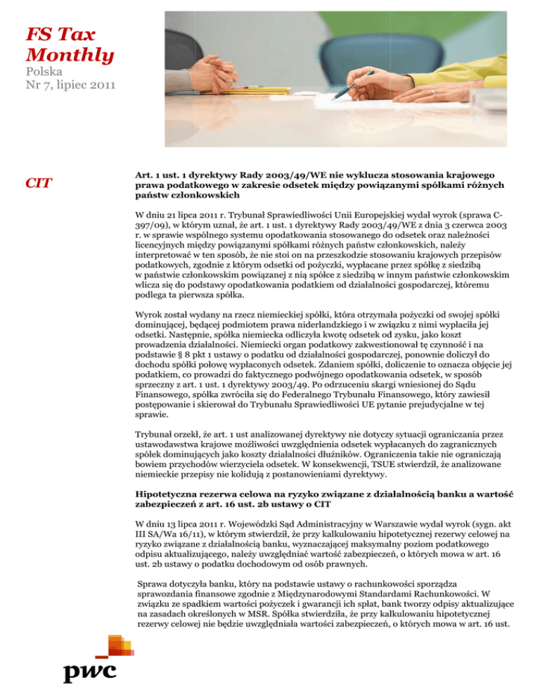 FS Tax Monthly Polska Nr 7, lipiec 2011 CIT Art. 1 ust. 1 dyrektywy Rady 2003/49/WE nie wyklucza stosowania krajowego prawa podatkowego w zakresie odsetek między powiązanymi spółkami różnych państw członkowskich W dniu 21 lipca 2011 r. Trybunał Sprawiedliwości Unii Europejskiej wydał wyrok (sprawa C C397/09), w którym uznał, że art. 1 ust. 1 dyrektywy Rady 2003/49/WE z dnia 3 czerwca 2003 r. w sprawie wspólnego systemu opodatkowania stosowanego do odsetek oraz nale należności licencyjnych między powiązanymi spółkami różnych państw członkowskich, należy interpretować w ten sposób, że nie stoi on na przeszkodzie stosowaniu krajowych przepisów podatkowych, zgodnie zg z którym odsetki od pożyczki, wypłacane przez spółkę z siedz siedzibą w państwie członkowskim powiązanej z nią spółce z siedzibą w innym państwie członkowskim wlicza się do podstawy opodatkowania podatkiem od działalności gospodarczej, któremu podlega ta pierwsza spółka. Wyrok został wydany na rzecz niemieckiej spółki, która otrzymała pożyczki od swojej spółki dominującej, będącej podmiotem prawa niderlandzkiego i w związku z nimi wypłaciła jej odsetki. Następnie, spółka niemiecka odliczyła kwotę odsetek od zysku, jako koszt prowadzenia działalności. Niemiecki organ org podatkowy atkowy zakwestionował tę czynność i na podstawie § 8 pkt 1 ustawy o podatku od działalności gospodarczej, ponownie doliczył do dochodu spółki połowę wypłaconych odsetek. Zdaniem spółki, doliczenie to oznacza objęcie jej podatkiem, co prowadzi do faktycznego faktycznego podwójnego opodatkowania odsetek, w sposób sprzeczny z art. 1 ust. 1 dyrektywy 2003/49. Po odrzuceniu skargi wniesionej do Sądu Finansowego, spółka zwróciła się do Federalnego Trybunału Finansowego, który zawiesił postępowanie i skierował do Trybunału Sprawiedliwości Sprawiedliwości UE pytanie prejudycjalne w tej sprawie. Trybunał orzekł, że art. 1 ust analizowanej dyrektywy nie dotyczy sytuacji ograniczania przez ustawodawstwa krajowe możliwości uwzględnienia odsetek wypłacanych do zagranicznych spółek dominujących jako jak koszty działalności dłużników. Ograniczenia takie nie ograniczają bowiem przychodów wierzyciela odsetek. W konsekwencji, TSUE stwierdził, że analizowane niemieckie przepisy nie kolidują z postanowieniami dyrektywy. Hipotetyczna rezerwa celowa na ryzyko związane z działalnością banku a wartość zabezpieczeń z art. 16 ust. 2b ustawy o CIT W dniu 13 lipca 2011 r. Wojewódzki Sąd Administracyjny w Warszawie wydał wyrok (sygn. akt III SA/Wa 16/11), w którym stwierdził, że przy kalkulowaniu hipotetycznej rezerwy celowej na ryzyko związane z działalnością banku, wyznaczającej maksymalny poziom podatkowego odpisu aktualizującego, należy uwzględniać wartość zabezpieczeń, o których mowa w art. 16 ust. 2b ustawy o podatku dochodowym od osób prawnych. Sprawa dotyczyła banku, który na podstawie ustawy o rachunkowości sporządza sprawozdania finansowe zgodnie z Międzynarodowymi Standardami Rachunkowości. W związku ze spadkiem wartości pożyczek i gwarancji ich spłat, bank tworzy odpisy aktualizujące na zasadach określonych w MSR. Spółka stwierdziła, że przy kalkulowaniu hipotetycznej rezerwy celowej nie będzie uwzględniała uwzględniał wartości zabezpieczeń, o których mowa w art. 16 ust. FS Tax Monthly Polska PwC Nr 7, lipiec 2011 Strona 2 2b ustawy o CIT. Zgodnie bowiem z art. 38b ust. 1 i 2 przedmiotowej ustawy, obowiązek ten dotyczy sytuacji, w której bank tworzy rezerwy na ryzyko związane z prowadzoną działalnością i pomniejsza je o wartość zabezpieczeń, co nie miało miejsca w omawianym przypadku. Dodatkowo, bank uznał, że przy kalkulacji wysokości rezerw celowych, przepisy podatkowe odwołują się wprost do przepisów o rachunkowości, które pozostawiają swobodę przy uwzględnianiu wartości zabezpieczeń w ramach rezerwy celowej. Dyrektor Izby Skarbowej nie podzielił stanowiska spółki. Jego zdaniem, odpisy aktualizujące zawsze zawierają w sobie kwoty zabezpieczeń. W konsekwencji, bank ustalając limit odpowiadający wysokości rezerwy celowej, powinien uwzględnić zabezpieczenia, o których mowa w art. 16 ust. 2b ustawy o CIT. Organ podniósł również, że nie można różnicować sytuacji podatkowej banków w zależności od tego, czy stosują MSR, do czego doprowadziłoby zastosowanie podejścia sugerowanego przez bank. WSA oddalił skargę banku i przychylił się do wniosków Dyrektora Izby Skarbowej. Zdaniem Sądu, na gruncie art. 38b ustawy o CIT, rezerwa odpowiadająca odpisom aktualizacyjnym zawsze powinna uwzględniać wartość zabezpieczeń, o których mowa w art. 16 ust. 2b ustawy o CIT. W przeciwnym razie doszłoby do uprzywilejowania banków stosujących MSR, ponieważ mogłyby one wliczać do kosztów kwoty wyższe niż banki prowadzące księgowość wyłącznie na podstawie polskiej ustawy o rachunkowości. Zastosowanie polsko-niemieckiej umowy o unikaniu podwójnego do lokat typu overnight W dniu 12 lipca 2011 r. Wojewódzki Sąd Administracyjny w Warszawie wydał wyrok (sygn. akt III SA/Wa 2843/10), w którym uznał, że w przypadku, gdy dochody z lokat typu overnight nie wchodzą w skład dochodów z podstawowej działalności prowadzonej przez spółkę, to nie ma do nich zastosowania zwolnienie z polsko – niemieckiej umowy o unikaniu podwójnego opodatkowania, dotyczące zysków ze świadczenia usług transportu międzynarodowego posiadających faktyczne miejsce zarządu za granicą. Wyrok został wydany w sprawie spółki, która prowadzi działalność w zakresie świadczenia usług transportu lotniczego, a jej zarząd znajduje się w Republice Federalnej Niemiec. Wolne środki na rachunku bieżącym spółki, na koniec każdego dnia są umieszczane na lokacie typu overnight. Organy podatkowe pierwszej i drugiej instancji stwierdziły, że działalność 