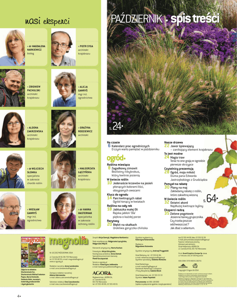 PAŹDZIERNIK . spis treści nasi eksperci dr MAGDALENA NARKIEWICZ biolog PIOTR SYGA architekt krajobrazu ZBIGNIEW PACHULSKI architekt krajobrazu ALICJA GAWRYŚ mgr inż. ogrodnictwa ALDONA ZAKRZEWSKA architekt krajobrazu GRAŻYNA RODZIEWICZ architekt 24. s. Na czasie 6 Kalendarz prac ogrodniczych O czym warto pamiętać w październiku ogród. MAŁGORZATA ŁĄCZYŃSKA architekt krajobrazu dr WOJCIECH SŁOMKA specjalista w zakresie chorób roślin WIESŁAW GAWRYŚ mgr inż. ogrodnictwa dr HANNA MASTERNAK specjalistka w zakresie ochrony roślin Roślina miesiąca 8 Zagadkowy zimowit Bezlistny nibykrokus, który kwitnie jesienią W świecie roślin 10 Jedenaście krzewów na jesień płonących kolorami liści, obsypanych owocami Klucz do ogrodu 14 Pani kwitnących rabat Ogród tonący w kwiatach Roślina na cały rok 18 Jabłuszka małej Oli Rajska jabłoń ‘Ola’ piękna o każdej porze Rarytasy 20 Błękit na skałkach Urokliwa goryczka chińska Zespół: Alicja Gawryś, Magdalena Narkiewicz Stale współpracują: Małgorzata Łączyńska, Małgorzata Wójcik Kierownik artystyczny: Mar ta Kochan Nr 10 (30) PAŹDZIERNIK 2014 ul. Czerska 8/10, 00-732 Warszawa tel. 22 555 68 50, e-mail: [email protected] www.e-ogrody.pl Zdjęcia na okładce: Shutterstock/Inc. Shutterstock/Mikhail hoboton Popov, Bernd Schmidt, Stefanie Mohr, muratart, materiały producentów i dystrybutorów 4 . Redaktor naczelna: Anna Landowska e-mail: [email protected] Zastępca redaktor naczelnej: Aldona Zakrzewska e-mail: [email protected] Sekretarz redakcji: Ewa Czaczkowska e-mail: [email protected] Fotoedytor: Alicja Górzyńska Koordynacja produkcji: Anna Ziemak Specjalista przestrzeni barwnej: Paweł Szczepaniak Serwis e-ogrody.pl Redaktor: Katarzyna Jodłowska e-mail: [email protected] Wydawnictwo: AGORA SA, ul. Czerska 8/10, 00-732 Warszawa tel. 22 555 40 00, 22 555 40 01 Nasze drzewa 22 Jawor śpiewający – zanikający element krajobrazu To jest modne 24 Magia traw Teraz to one grają w ogrodzie pierwsze skrzypce Czytelnicy prezentują 28 Ogród, moja miłość Duma pana Edwarda Jastrzębskiego z Grudziądza Pomysł na rabatę 30 Plany na maj Zakładamy rabatę z roślin, które zakwitną wiosną W świecie roślin 32 Ostatni akord Najdłużej kwitnące byliny Eksperci radzą 35 Zielone pogotowie Jesienne barwy grujecznika. Czy trzeba jeszcze odchwaszczać? Jak dbać o adiantum. Dyrektor wydawniczy: Katarzyna Kolanowska Wydawca: Bogusława Kotowska s. 64. lub 22 555 44 00, faks: 22 555 55 59 e-mail: [email protected] Pytania i reklamacje prosimy kierować pod adresem: Dział Kolportażu AGORA SA ul. Czerska 8/10, 00-732 Warszawa Dyrektor artystyczny: Andrzej Przygodzki Dział Reklamy: tel. 22 555 61 84, e-mail: [email protected] Dyrektor sprzedaży: Elżbieta Nowacka Dział Marketingu: e-mail: [email protected] Kierownik Marketingu Czasopism i Prasy Bezpłatnej: Izabela Bziuk Dział Kolportażu: tel. 22 555 53 33 Dyrektor: Adam Popielski Prenumerata: tel. 801 130 000 (opłata za połączenie zgodnie z taryfą operatora) Druk: Quad/Graphics Europe Sp. z o.o. ul. Pułtuska 120, 07-200 Wyszków ISSN 2084-7270 INDEKS 282715 Copyright © Agora SA 2014 Redakcja nie odpowiada za treść zamieszczanych reklam. Redakcja nie zwraca materiałów niezamówionych i zastrzega sobie prawo do redagowania tekstów. Wydawca magazynu „Magnolia” ostrzega P.T. Sprzedawców, że sprzedaż aktualnych i archiwalnych numerów czasopisma po cenie innej niż wydrukowana na okładce jest działaniem na szkodę wydawcy i skutkuje odpowiedzialnością sądową. Reklamy nieoznaczone na stronach: 2, 53, 75, 76 Fot. F. Strauss/Mak Media, Fotolia.pl, Shutterstock/Yu Lan, HHelene, Vahan Abrahamyan, GuoZhongHua, archiwa prywatne s. 32. Poparzony fiołek. Jak rozsadzić borówki. Czy porosty nie szkodzą drzewu? Rozmnażamy szkarłatkę Klinika roślin 38 Gdy cebulowe chorują Jak walczyć ze szkodnikami i chorobami roślin cebulowych Czas na zmiany 40 Domek w szczerym polu Dwa pomysły na ukwieconą działkę Ze smakiem 42 Ogrodowe grzybobranie Jakie grzyby można uprawiać we własnym ogródku 44 Słodki ziemniak Bataty szturmem zdobywają naszą kuchnię – przepisy warte polecenia 45 Pożywne kasztany Tajniki uprawy Serwis ogrodowy 46 Sadźmy róże! Jak sadzić te krzewy z tzw. gołym korzeniem Inspiracje 48 Włącz światło Lampy, które rozjaśnią mrok i stworzą nastrój w ogrodzie 50 Wygodna rabata Pozwala lepiej wyeksponować rośliny i ułatwia ich pielęgnację Męska robota 54 Woda pod ciśnieniem Uniwersalne ogrodowe myjki Grunt to pomysł 56 Dziesięć pomysłów na nietypowe płoty Niebanalne ogrodzenia, mury, płoty i płotki Obserwatorium 60 Jesienne odloty Fascynujące wędrówki ptaków balkon itaras. Na medal 62 Gdzie szumią drzewa Balkon na 5. piętrze pełen zieleni s. 46. s. 66. dom. Zrób to sam 64 Lampiony i baloniki Dekoracje z miechunki Parapetówka 66 Bonsai – żywe rzeźby Jak je pielegnować, by nie straciły formy Rozrywka 59 Krzyżówka ogrodnicza z nagrodami Wasze sukcesy 70 Pochwalcie się swoim ogrodem, balkonem, rośliną! Wasz temat: Ukochane azalie Co w trawie piszczy 72 Warto zobaczyć Marimurtra, śródziemnomorski raj. Plus: ciekawostki, nowości, kalendarium imprez 74 Za miesiąc w „Magnolii” s. 20. 5 .