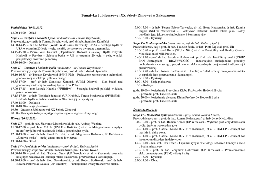 Tematyka Jubileuszowej XX Szkoły Zimowej w Zakopanem Poniedziałek (19.03.2012) 13.00-14.00 – Obiad Sesja I – Genetyka i hodowla bydła (moderator – dr Tomasz Krychowski) Przewodniczący sesji: dr Tomasz Krychowski, prof. dr hab. Stanisław Kamiński 14.00-14.45 – dr Ole Meland (World Wide Sires University, USA) – Selekcja bydła w USA w ostatnim 20-leciu – cele, wyniki, perspektywy związane z genomiką. 14.45-15.30 – Pierre-Louis Gastinel (Departament Hodowli i Selekcji Bydła Instytutu Hodowli w Paryżu) – Selekcja bydła w UE w ostatnim 20-leciu – cele, wyniki, perspektywy związane genomiką. 15.30-16.00 – Dyskusja Sesja II – Genetyka i hodowla bydła (moderator – dr Tomasz Krychowski) Przewodniczący sesji: dr Tomasz Krychowski, prof. dr hab. Edward Dymnicki 16.10-16.35 – dr Tomasz Krychowski (PFHBiPM) – Praktyczne zastosowanie technologii genomicznej w selekcji bydła mlecznego. 16.35-17.00 – prof. dr hab. Stanisław Kamiński (UWM Olsztyn) – Stan badań nad genomową wartością hodowlaną bydła HF w Polsce. 17.00-17.15 – mgr Leszek Hądzlik (PFHBiPM) – Strategia hodowli polskiej widziana przez hodowców. 17.15-17.40 – dr hab. Wojciech Jagusiak (UR Kraków), Teresa Piechowska (PFHBiPM) – Hodowla bydła w Polsce w ostatnim 20-leciu i jej perspektywy. 17.40-18.00 – Dyskusja 18.00-18.30 – Sesja plakatowa 19.30 – Otwarcie Jubileuszowej XX Szkoły Zimowej 20.00 – Uroczysta kolacja, występ zespołu regionalnego ze Skrzypnego Wtorek (20.03.2012) Sesja III – prof. dr hab. Sławomir Mroczkowski, dr hab. Andrzej Węglarz 11.30-12.00 – prof. Ivan Mikula (UVLF v Košiciach) et al. – Metagenomika - wpływ mikroflory jelitowej na zdrowie i efekty produkcyjne bydła. 12.00-13.00 – prof. dr hab. Paweł Brzuski, dr inż. Magdalena Hędrzak (UR Kraków) – „Zimowa troska” – mniej znana strona łowiectwa. 13.00-14.00 – Obiad Sesja IV – Produkcja mleka (moderator – prof. dr hab. Tadeusz Szulc) Przewodniczący sesji: prof. dr hab. Tadeusz Szulc, prof. Gabriel Kováč 14.00-14.30 – prof. dr hab. Tadeusz Szulc (UP Wrocław) et al. – Znaczenie poznania kolejnych właściwości i funkcji mleka dla rozwoju przetwórstwa i konsumpcji. 14.30-15.00 – prof. dr hab. Piotr Nowakowski, dr inż. Robert Bodkowski, prof. dr hab. Bożena Patkowska-Sokoła (UP Wrocław) – Funkcjonalne kwasy tłuszczowe mleka. 15.00-15.30 – dr hab. Teresa Nałęcz-Tarwacka, dr inż. Beata Kuczyńska, dr inż. Kamila Puppel (SGGW Warszawa) – Bioaktywne składniki białek mleka jako istotny wyróżnik jego jakości technologicznej i konsumpcyjnej. 15.30-16.00 – Dyskusja Sesja V – Produkcja mleka (moderator – prof. dr hab. Tadeusz Szulc) Przewodniczący sesji: prof. dr hab. Tadeusz Szulc, dr hab. Piotr Zapletal, prof. UR 16.10-16.40 – prof. Jozef Bulla (SPU v Nitre) et al. – Possibility and Reality Genetic Modification of Milk Proteins. 16.40-17.10 – prof. dr hab. Jarosław Horbańczuk, prof. dr hab. Józef Krzyżewski (IGiHZ PAN Jastrzębiec) – BIOŻYWNOŚĆ – innowacyjne, funkcjonalne produkty pochodzenia zwierzęcego; pozyskiwanie mleka o podwyższonej wartości odżywczej i prozdrowotnej. 17.10-17.40 – dr hab. Joanna Barłowska (UP Lublin) – Skład i cechy funkcjonalne mleka w aspekcie jego przetwarzania i konsumpcji. 17.40-18.00 – Dyskusja 18.00-18.30 – Sesja plakatowa 18.30 – Kolacja godz. 19.00 – Posiedzenie Prezydium Klubu Profesorów Hodowli Bydła – prowadzi prof. Tadeusz Szulc godz. 20.00 – Posiedzenie plenarne Klubu Profesorów Hodowli Bydła – prowadzi prof. Tadeusz Szulc Środa (21.03.2012) Sesja VI – Dobrostan bydła (moderator – prof. dr hab. Roman Kołacz) Przewodniczący sesji: prof. dr hab. Roman Kołacz, prof. dr hab. Jerzy Niedziółka 10.00-10.40 – prof. dr hab. Roman Kołacz (UP Wrocław) – Wybrane problemy dobrostanu bydła. (referat wprowadzający) 10.40-11.10 – prof. Gabriel Kováč (UVLF v Košiciach) et al – HACCP - concept for mastitis in dairy cows. 11.10-11.40 – prof. Gabriel Kováč (UVLF v Košiciach) et al – HACCP - concept for locomotion disorders in dairy cows. 11.40-12.10 – lek. wet. Ewa Tracz – Czynniki ryzyka w etiologii schorzeń kończyn i racic u bydła mlecznego. 12.10-12.30 – prof. dr hab. Zbigniew Dobrzański (UP Wrocław) – Promieniowanie elektromagnetyczne (PEM) – fakty i mity. 12.30-13.00 – Dyskusja 13.00-14.00 – Obiad Sesja VII – Dobrostan bydła – ciąg dalszy (moderator – prof. dr hab. Roman Kołacz) Przewodniczący sesji: prof. dr hab. Roman Kołacz, dr inż. Krzysztof Adamczyk 14.00-14.25 – dr hab. Lech Nawrocki (Politechnika Opolska) – Obory XXI wieku pod lupą dobrostanu. 14.25-14.50 – tech. wet. Jan P. Weihs (PW Jan P. Weihs) – Skutki braku lub nieprawidłowa profilaktyka w schorzeniach racic krów. 14.50-15.10 – dr inż. Zbigniew Lach (OHZ Osięciny) – Okres okołoporodowy – więcej pytań niż odpowiedzi. 15.10-15.30 – Dyskusja 15.30-16.00 – Sesja plakatowa Sesja VIII – Ekonomia produkcji mleka i wołowiny (moderator – prof. dr hab. Henryk Runowski) Przewodniczący sesji: prof. dr hab. Henryk Runowski, dr hab. Joanna Makulska, prof. UR 16.10-16.40 – dr hab. Renata Grochowska (Instytut Ekonomiki Rolnictwa i Gospodarki Żywnościowej PIB) – Wpływ zmian Wspólnej Polityki Rolnej na funkcjonowanie gospodarstw rolnych. 16.40-17.10 – dr inż. Andrzej Parzonko (SGGW Warszawa) – Sytuacja na światowym i europejskim rynku mleka i żywca wołowego. 17.10-17.40 – prof. dr hab. Wojciech Ziętara (SGGW Warszawa) – Efektywność produkcji mleka i żywca wołowego w Polsce i w wybranych krajach. 17.40-18.00 – Dyskusja 18.00-18.30 – Sesja plakatowa 18.30 – Kolacja Czwartek (22.03.2012) 9.00-13.00 – Wycieczka pt. „Zakopane nieodkryte”. A ponadto w godzinach wolnych od zajęć – nauka jazdy na nartach na Nosalu oraz kultura wysoka (Teatr Witkacego – piątek i sobota) 13.00-14.00 – Obiad Sesja IX