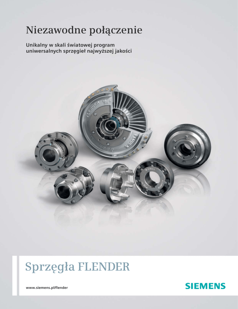 Niezawodne połączenie Unikalny w skali światowej program uniwersalnych sprzęgieł najwyższej jakości Sprzęgła FLENDER www.siemens.pl/flender Wysoka standaryzacja przy bogatej palecie produktów Skrętnie sztywne, sprzęgła zębate Strony 4–5 Skrętnie sztywne, sprzęgła stalowe Strony 6–7 Sprzęgła elastyczne Strony 8–9 Sprzęgła odgrywają ważną rolę w układzie przeniesienia napędu. Ich konstrukcja musi być wyjątkowo wytrzymała, aby w ekstremalnych warunkach pracowały niezawodnie. Dostępne na całym świecie najwyższej jakości sprzęgła to nasz wkład w niezawodność procesu produkcyjnego. 2 Sprzęgła wysokoelastyczne Strony 10–11 Sprzęgła FLENDER® Firma Siemens posiada bardzo duże doświadczenie w obszarze techniki napędowej różnych gałęzi przemysłu. Dzięki temu jest idealnym partnerem we wszelkich zagadnieniach związanych z techniką napędową. Dla wszystkich gałęzi przemysłu oferujemy szeroki zakres sprzęgieł standardowych, jak również specjalnych, dostosowanych do rozwiązań branżowych. Siemens, jeden ze znaczących producentów sprzęgieł mechanicznych, oferuje bardzo szeroki, ustandaryzowany asortyment sprzęgieł o zróżnicowanych wielkościach i wykonaniach. Oferta obejmuje sprzęgła w zakresie momentu obrotowego od 10 do 10 000 000 Nm. Sprzęgła hydrokinetyczne Strony 12–13 Bezpieczeństwo i jakość Podczas projektowania sprzęgieł przywiązujemy bardzo dużą wagę do bezpieczeństwa i niezawodności. Jakość i własności sprzęgieł są regularnie badane na naszych stanowiskach testowych. Poprzez ścisłe procedury kontroli jakości gwarantujemy niezmienną wysoką jakość i powtarzalność produktów. Procesy, procedury produkcyjne oraz kontrola jakości są zgodne z najnowszymi obowiązującymi normami. Eksploatacja Niektóre serie sprzęgieł FLENDER są bezobsługowe, inne natomiast wymagają jedynie obsługi w wydłużonych okresach czasu. Zużywające się części można z łatwością wymienić i są one dostępne na całym świecie. Dzięki temu okresy przestoju urządzeń można ograniczyć do minimum. Środowisko naturalne Odpowiedzialne obchodzenie się z zasobami środowiska naturalnego odgrywa dla nas ważną rolę. Produkcja sprzęgieł odbywa się w Niemczech, głównie w naszych własnych zakładach. Komponenty pochodzą od europejskich poddostawców, którzy przywiązują dużą wagę do jakości, dostępności oraz ochrony środowiska. Cena, terminy dostaw oraz dostępność Sprzęgła FLENDER oferowane są po atrakcyjnych cenach z najkrótszym możliwym czasem dostawy. Zachowanie powtarzalności oraz wysokiej jakości produktu, a także dotrzymywanie terminów dostaw jest naszym najwyższym priorytetem. Doskonała logistyka obsługi posprzedażnej oznacza, że części zużywające się i zapasowe można dostarczyć w różne części świata w krótkim terminie. 3 Wytrzymałe i niezawodne Sprzęgła zębate skrętnie sztywne – serii ZAPEX Wytrzymałe sprzęgła wykonane z wysokiej jakości stali ulepszanej cieplnie, przenoszące wysoki moment w stosunku do własnej masy, są idealne do pracy w najtrudniejszych warunkach. 4 Sprzęgła zębate ZAPEX® Sprzęgła zębate składają się z dwóch piast z uzębieniem zewnętrznym, przewidzianych do zabudowy na wałach urządzeń. Moment obrotowy jest przenoszony za pomocą zębów sprzęgła. Zęby są odpowiednio zaokrąglone, tak aby przemieszczenie kątowe było możliwe w każdym położeniu zębów. Przemieszczenie promieniowe jest kompensowane dzięki dwuprzegubowej budowie sprzęgła. Uzębienie wewnętrzne tulei kołnierzowych jest znacznie szersze niż zęby piast, co pozwala na stosunkowo duże przesunięcie wzdłużne. Wytrzymałe, kompaktowe sprzęgła ZAPEX wykonane są z wysokiej jakości stali ulepszanej cieplnie i wytwarzane zgodnie z systemem modułowym. Piasty standardowe mogą być zastąpione uniwersalnymi, które są znacznie dłuższe i pozwalają na modyfikację zgodnie z życzeniem klienta. Seria ZW obejmuje 31 wielkości, z których 14 zostało ustandaryzowanych i są w ciągłej sprzedaży w zakresie momentu obrotowego do 250 000 Nm oraz maksymalnych średnicach owierceń piast do 275 mm. Poza standardowym asortymentem, na życzenie klienta możemy wykonać sprzęgła do 10 000 000 Nm. Seria ZI jest dostępna w ciągłej sprzedaży w dwunastu wielkościach dla momentów obrotowych do 125 000 Nm i maksymalnych średnicach otworów piast do 276 mm. Cechy: • dwuprzegubowe sprzęgło zębate kompensujące kątowe, promieniowe i wzdłużne przesunięcie wałów • mała siła odwodząca • duża trwałości środka smarnego • małe wymiary przy jednoczesnym dużym dopuszczalnym obciążeniu udarowym z zachowaniem wysokiego współczynnika bezpieczeństwa • możliwość zastosowania dla obydwu kierunków obrotu, jak również dla pracy nawrotnej Obszary zastosowań: • walcarki • maszyny papiernicze • młyny cementu • mieszadła • napędy kolei linowych • pompy • dmuchawy • przenośniki • turbiny Zalety: • Duże momenty przy małych gabarytach • Bardzo wytrzymała konstrukcja • Szeroki asortyment typów • Rozwiązania branżowe zaprojektowane na potrzeby klienta • Łatwość dostosowania wymiarów dzięki piastom uniwersalnym • Niska siła odwodząca przy dużych dopuszczalnych przesunięciach wałów 5 Wszechstronne i kompaktowe Skrętnie sztywne sprzęgła stalowe – serii ARPEX Kompaktowe sprzęgła ARPEX® wykonane Sprzęgła stalowe ARPEX w całości ze stali o zwartej konstrukcji, W tych sprzęgłach moment obrotowy przenoszony jest poprzez skrętnie sztywne, elastyczne pakiety blach stalowych. Blachy połączone są ze sobą za pomocą tulejek i pierścieni tworząc zwarty pakiet, co zapewnia prosty i niezawodny montaż. przenoszące wysoki moment w stosunku do własnej masy. Dzięki uniwersalnej i modułowej budowie mogą być stosowane w niemal każdej aplikacji. Dwa pakiety 
