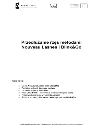 Przedłużanie rzęs metodami Nouveau Lashes i Blink&Go Spis treści • • • • • • Marka Nouveau Lashes oraz Blink&Go Technika aplikacji Nouveau Lashes Technika aplikacji Blink&Go Kleje Ultra Bond – stosowanie oraz wyróżniające cechy Przeciwwskazania do wykonania aplikacji Różnice pomiędzy Nouveau Lashes produktów Blink&Go Projekt współfinansowany przez Unię Europejską ze środków Europejskiego Funduszu Społecznego Nouveau Lashes to brytyjska marka obecna na polskim rynku kosmetycznym od 2007 roku (Blink&Go od 2007)dzięki głównemu dystrybutorowi, firmie Biar Beauty Group. Od początku klasyfikowana jako marka selektywna stała się najbardziej rozpoznawalną medialnie i cieszącą się ogromnym zainteresowaniem metodą przedłużania rzęs w Polsce. Nouveau Lashes to: • • • • • • • wachlarz szkoleń metodą 1:1, metodą 2:1 możliwość aplikacji rzęs dolnych pierwsza marka w Polsce, która wprowadziła innowacyjną, autorską, ekspresową metodę aplikacji Blink&Go solidny i sprawdzony partner kompleksowe szkolenia największe wsparcie marketingowe laureat nagród, nominacji i wyróżnień i rekomendacji jako jedyna firma w Polsce zajmująca się tą tematyką przedłużania i zagęszczania rzęs Metoda Nouveau Lashes 1:1 To rewelacyjna technika przedłużania i zagęszczania rzęs, która utrzymuje się zgodnie z cyklem życia rzęsy. Rzęsy Nouveau Lashes to materiał wyprodukowany z miękkich, naturalnie podkręconych, poliestrowo-jedwabnych włókien. Zaprojektowanych w ten sposób, by po doklejeniu do naturalnych rzęs uzyskać całkowicie naturalny efekt. Takie włókno jest bardziej wytrzymałe, niż włókna naturalne, ale pozostaje miękkie i elastyczne w przeciwieństwie do typowych włókien syntetycznych. Rzęsy występują w długościach od 6 do 15 mm oraz w czterech różnych grubościach, dwóch skrętach J - B oraz C. Nouveau Lashes to pojedyncze włoski, które utrzymują się do 8 tygodni w zależności od cyklu życia rzęsy danej osoby (przeciętny cykl to 90 dni). Długotrwałość efektu zależy też od ilości zaaplikowanych rzęs. Klientka może utrzymywać efekt dzięki uzupełnieniom, co około 3 tygodnie. Nouveau Lashes nie niszczą naturalnych rzęs pod warunkiem, że klientka o nie dba. Dlatego bardzo ważne jest, aby udzielić szczegółowych informacji odnośnie pielęgnacji (ulotka). Naturalne rzęsy mogą zostać uszkodzone, jeżeli celowo zostaną wyrwane z Nouveau Lashes. W prawidłowo wykonanym zabiegu każda rzęsa zaaplikowana jest perfekcyjnie osobno oraz ma właściwie dobraną długość i grubość(przedłużenie 30-50% w stosunku do rzęsy naturalnej. Zasady aplikacji Noveau Lashes • Przed przystąpieniem do aplikacji załóż klientce czepek chroniący włosy. Podczas zabiegu stosuj maskę. Projekt współfinansowany przez Unię Europejską ze środków Europejskiego Funduszu Społecznego • Poproś klientkę o to, by podczas zabiegu miała przez cały czas zamknięte oczy oraz o spokojne leżenie. Uprzedź, że otwiera oczy tylko na wyraźne polecenie. • Przy pomocy proteinowych płatków odtłuść rzęsy. • Zabezpiecz dolne rzęsy przy pomocy płatków żelowych. • Przeczesz rzęsy szczoteczką. • Wyciśnij małą ilość kleju do jednorazowego plastikowego pojemniczka. • Dopasuj długość Nouveau Lashes do naturalnych rzęs (można je przedłużyć o 30-50%) • Jeżeli jesteś osobą praworęczną, lewą ręką chwyć za pęsetę i wybierz jedną naturalną rzęsę o średniej długości (cykl życia rzęsy),do której będziesz przyklejać Nouveau Lashes. • Trzymaj pęsetę pod kątem 45 stopni. • Chwyć cieńszy koniec rzęsy i zamocz ją w kleju na długości 2/3 w celu zebrania od 3 do 4 kropli kleju. • • Upewnij się, że przyklejasz włókno do jednej rzęsy! Nouveau Lashes może być przyklejana z góry, od spodu, z boku. • W celu równomiernego rozmieszczenia kleju na naturalnej rzęsie przeciągnij 3 razy po całej długości naturalnej rzęsy Nouveau. • Przy trzecim pociągnięciu pozostaw Nouveau Lashes na naturalnej rzęsie w odległości 0,5 – 1 mm od skóry. Pamiętaj, że tylko starannie umiejscowiona rzęsa będzie gwarancją trwałego efektu! Nie przyklejaj Nouveau rzęsy do skóry lub do samego początku naturalnej rzęsy (może to spowodować podrażnienie, dyskomfort lub odklejenie się Nouveau Lashes). Upewnij się, że przyklejona rzęsa pnie się ku górze. Usuń nadmiar kleju. • Sprawdź czy Nouveau Lashes została perfekcyjnie przyklejona do naturalnej rzęsy na całej długości! • Jeżeli wymaga korekty niezwłocznie popraw rzęsę. • Upewnij się, że podczas zabiegu nie uległa sklejeniu większa ilość rzęs, w przeciwnym razie w celu korekty stosuj tylko i wyłącznie produkt do usuwania rzęs (lash remover). W żadnym wypadku nie stosuj nożyczek bądź innych tego typu przyrządów. • Przeczesuj rzęsy podczas aplikacji i upewniaj się, że nie sklejają się ze sobą! Projekt współfinansowany przez Unię Europejską ze środków Europejskiego Funduszu Społecznego • Po zakończonym zabiegu istnieje konieczność stosowania utrwalacza profesjonalnego (sealer). Po aplikacji utrwalacza – po upływie minuty można poprosić klientkę o otwarcie oczu. • Usuń żelowe płatki lub taśmę. Stosowanie produktów • pojemniczki na klej, czepki, maski – stosuj jednorazowo. • płatki proteinowe – stosuj zawsze przed aplikacją i uzupełnianiem (pominięcie rzutuje na trwałość). • sealer prof. – stosuj obowiązkowo zawsze po aplikacji i uzupełnianiu (sealer współgra z klejem). • remover – stosuj ostrożnie podczas aplikacji, dokładne wymycie wodą, ponowna aplikacja na suchą rzęsę. • sealer dla klienta – należy stosować obowiązkowo przy długotrwałym noszeniu rzęs. • klej – należy nauczyć się nim pracować. Klej zastyga w czasie 5-8 s. O szybkości jego wiązania decyduje ilość aplikacji