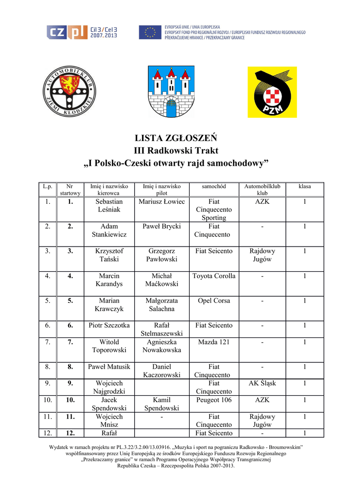 LISTA ZGŁOSZEŃ III Radkowski Trakt „I Polsko-Czeski otwarty rajd samochodowy” L.p. Nr startowy Imię i nazwisko kierowca Imię i nazwisko pilot samochód Automobilklub klub klasa 1. 1. Sebastian Leśniak Mariusz Łowiec AZK 1 2. 2. Adam Stankiewicz Paweł Brycki Fiat Cinquecento Sporting Fiat Cinquecento - 1 3. 3. Krzysztof Tański Grzegorz Pawłowski Fiat Seicento Rajdowy Jugów 1 4. 4. Marcin Karandys Michał Maćkowski Toyota Corolla - 1 5. 5. Marian Krawczyk Małgorzata Salachna Opel Corsa - 1 6. 6. Piotr Szczotka Fiat Seicento - 1 7. 7. Witold Toporowski Rafał Stelmaszewski Agnieszka Nowakowska Mazda 121 - 1 8. 8. Paweł Matusik Daniel Kaczorowski - 1 9. 9. AK Śląsk 1 10. 10. AZK 1 11. 11. 12. Fiat Cinquecento Fiat Seicento Rajdowy Jugów - 1 12. Wojciech Najgrodzki Jacek Spendowski Wojciech Mnisz Rafał Fiat Cinquecento Fiat Cinquecento Peugeot 106 Kamil Spendowski - Wydatek w ramach projektu nr PL.3.22/3.2.00/13.03916. „Muzyka i sport na pograniczu Radkowsko - Broumowskim” współfinansowany przez Unię Europejską ze środków Europejskiego Funduszu Rozwoju Regionalnego „Przekraczamy granice” w ramach Programu Operacyjnego Współpracy Transgranicznej Republika Czeska – Rzeczpospolita Polska 2007-2013. 1 13. 14. Szymczak Damian Lis 14. 15. Kamil Bober 15. 16. 16. 17. Krzysztof Horoszkiewicz Paweł Orliński 17. 18. Tomasz Staszków 18. 19. 19. 20. 20. 21. 21. 22. Bogusław Kłonowski Mirosław Hebda Juliusz Kozaczka Dawid Feliksik 22. 23. Marek Luty 23. 24. 24. 25. 25. 26. Sławomir Pasternak Leszek Keplinger Jacek Adamski 26. 27. 27. Fiat Seicento Bartłomiej Szewczuk Marta Preś Adam Dziurgot Agnieszka Bieruta Staszków Paweł Piątek Piotr Frankowski Michał Strycharski Damian Feliksik 1 Fiat Seicento kit car Volkswagen Polo Skoda Favorit Rajdowy Jugów AK Opolski 1 - 1 Fiat Seicento - 1 Peugeot 205 SR Fiat Cinquecento Peugeot 106 - 1 - 1 Rajdowy Jugów Rajdowy Jugów - 1 - 1 Rajdowy Jugów - 1 - 2 Fiat Seicento Fiat Seicento 1 1 1 Fiat Cinquecento Fiat 126 p Krzysztof Gabrysiak Przemysław Ciunowicz Jarosław Keplinger Zuzanna Adamska Krzysztof Gabrysiak Jr. 28. Paweł Osicki Patrycja Osicka Peugeot 206 - 2 28. 29. Damian Fodrowski Bartosz Betlejewski Fiat Seicento AZT 2 29. 30. Mateusz Pitoń Citroën C2 - 2 30. 31. Peugeot 106 GTI Peugeot 206 2 32. Grzegorz Matecki Tomasz Juranek - 31. Maciej Ciechanowicz Tomasz Matecki Patryk Zuterek - 2 32. 33. Honda Civic - 2 33. 34. Konrad Kucharzewski Łukasz Cieślak - 2 34. 35. Mitsubishi Colt Citroën Saxo - 2 Adrian Bachanek Przemysław Zajda Andrzej Grzegorz Mitsubishi Colt Mitsubishi Colt Wydatek w ramach projektu nr PL.3.22/3.2.00/13.03916. „Muzyka i sport na pograniczu Radkowsko - Broumowskim” współfinansowany przez Unię Europejską ze środków Europejskiego Funduszu Rozwoju Regionalnego „Przekraczamy granice” w ramach Programu Operacyjnego Współpracy Transgranicznej Republika Czeska – Rzeczpospolita Polska 2007-2013. 1 Janeczko Szumliński 35. 36. Rafał Kosicki Aneta Kosicka Honda CRX - 2 36. 37. Łukasz Haręźlak 2 38. AZT 2 38. 39. Mateusz Bukis Krzysztof Bojarun Andrzej Świerc Peugeot 106 XSI Fiat Cinquecento Peugeot 106 - 37. Krzysztof Pszczółka Jacek Januchto - 2 39. 40. Piotr Czapski Kamil Obrębki Opel Astra Olsztyński Klub Rajdowy 3 40. 41. Łukasz Wójcik VW Sirocco - 3 41. 42. - 3 43. BMW E30 - 3 43. 44. Grzegorz Mioduski Robert Nawrocki Tomasz Zuszek BMW 320i 42. Renault Clio ADŚ 3 44. 45. Tomasz Wójcik Grzegorz Faryna Marcin Adamczyk Sebastian Jaromik Maciej Grucia - 3 45. 46. Marcin Wesołowski Aurelia Pajdak Volkswagen Golf III Opel Astra GSI 3 46. 47. Patryk Epner Elian Biskupski Opel Corsa B Grupa Rajdowa Gór Stołowych - 47. 48. Szymon Mazur Polonez Caro - 3 48. 49. Opel Astra AZK 3 49. 50. Adam Pietrzak 3 51. - 3 51. 52. Renault Clio Sport Renault Megane Peugeot 206 - 50. 53. AK Karkonoski - 3 52. 53. 54. 55. Rajdowy Jugów - 3 54. 55. 56. Mariusz Koziarski Łukasz Szczotka Grzegorz Guźliński Daniel Wajdzik Sławomir Brycki Daniel Markiewicz Krzysztof Łodziato Arkadiusz Łopatka Tomasz Rudnicki Mariusz Kupiec - 4 Maciej Wąsik Krzysztof Maceluch Michał Maceluch Łukasz Kochaniec Mateusz Wełyczko Paweł Bereziuk Piotr Korona Opel Astra GSI Volkswagen Golf II TDI Subaru Impreza Subaru Impreza Wydatek w ramach projektu nr PL.3.22/3.2.00/13.03916. „Muzyka i sport na pograniczu Radkowsko - Broumowskim” współfinansowany przez Unię Europejską ze środków Europejskiego Funduszu Rozwoju Regionalnego „Przekraczamy granice” w ramach Programu Operacyjnego Współpracy Transgranicznej Republika Czeska – Rzeczpospolita Polska 2007-2013. 3 3 4 56. 57. Adam Krężel 57. 58. Magdalena Wesołowska 58. 59. Jakub Wesołowski Artur Bury 59. 60. Kamil Sójka Tomasz Sójka 60. 61. 61. 62. Ewelina Dołhań Piotr Zalewski 62. 63. Piotr Sawicz 63. 64. 64. 65. 65. 66. 66. 67. 67. 68. 68. 69. 69. 70. 70. 71. 71. 72. Tomasz Pisarek Mariusz Zuterek Andrzej Wojciechowsk i Vladimir Hruby Vlastislav Skoŕepa Michał Majewski Grzegorz Wasilewski Piotr Czypionka Piotr Konior Paulina Wieczniak Robert Koczyński Lesław Radkiewicz Marcin Dziedzic - 4 AZT 4 - 4 - 4 AZK 4 Subaru Impreza GT BMW E30 Coupe Subaru Impreza Peugeot RCZ AZK 4 - 4 - 4 - 4 Dariusz Mokrzycki Volkswagen Golf GTI AZK 4 Maja Hruby Skoda Octavia - 4 Volkswagen Passat Honda Civic AZK 4 AZK Gość Honda Civic VTi Opel Astra Gość Opel Astra AK Dolny Śląsk AZT Zgorzelec AZK 72. 73. 73. 74. 74. 75. 75. Edyta Buczkowska Anna Woińska Grzegorz Gruszczyński Subaru Impreza BMW E36 BMW Compact Lancia Delta Integrale Lancia Delta Gość Gość Krzysztof Grocholski Mateusz Kokoszka Adrian Nuszczyński Stanisław Bieńkowski Leszek Kokoszka Jakub Najgrodzki Fiat Seicento AZK Gość Audi A4 AZK Gość Fiat SC VR Gość 76. Patryk Sudoł Katarzyna Prędota Citroën Xsara Moto Sport Gliwice/AK Śląski AZK/ A. Opolski 76. 77. 77. 78. 78. 79. Gość Republika Czeska Gość Republika Czeska Gość Republika Czeska Gość Wydate
