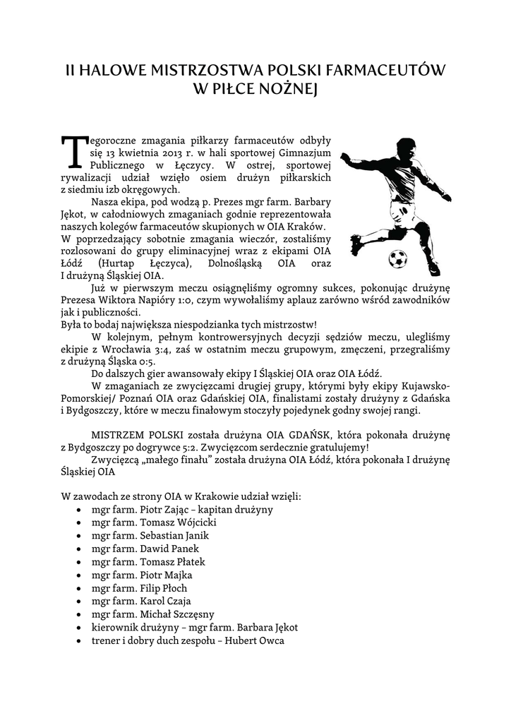 II HALOWE MISTRZOSTWA POLSKI FARMACEUTÓW W PIŁCE NOŻNEJ T egoroczne zmagania piłkarzy farmaceutów odbyły się 13 kwietnia 2013 r. w hali sportowej Gimnazjum Publicznego w Łęczycy. W ostrej, sportowej rywalizacji udział wzięło osiem drużyn piłkarskich z siedmiu izb okręgowych. Nasza ekipa, pod wodzą p. Prezes mgr farm. Barbary Jękot, w całodniowych zmaganiach godnie reprezentowała naszych kolegów farmaceutów skupionych w OIA Kraków. W poprzedzający sobotnie zmagania wieczór, zostaliśmy rozlosowani do grupy eliminacyjnej wraz z ekipami OIA Łódź (Hurtap Łęczyca), Dolnośląską OIA oraz I drużyną Śląskiej OIA. Już w pierwszym meczu osiągnęliśmy ogromny sukces, pokonując drużynę Prezesa Wiktora Napióry 1:0, czym wywołaliśmy aplauz zarówno wśród zawodników jak i publiczności. Była to bodaj największa niespodzianka tych mistrzostw! W kolejnym, pełnym kontrowersyjnych decyzji sędziów meczu, ulegliśmy ekipie z Wrocławia 3:4, zaś w ostatnim meczu grupowym, zmęczeni, przegraliśmy z drużyną Śląska 0:5. Do dalszych gier awansowały ekipy I Śląskiej OIA oraz OIA Łódź. W zmaganiach ze zwycięzcami drugiej grupy, którymi były ekipy KujawskoPomorskiej/ Poznań OIA oraz Gdańskiej OIA, finalistami zostały drużyny z Gdańska i Bydgoszczy, które w meczu finałowym stoczyły pojedynek godny swojej rangi. MISTRZEM POLSKI została drużyna OIA GDAŃSK, która pokonała drużynę z Bydgoszczy po dogrywce 5:2. Zwycięzcom serdecznie gratulujemy! Zwycięzcą „małego finału” została drużyna OIA Łódź, która pokonała I drużynę Śląskiej OIA W zawodach ze strony OIA w Krakowie udział wzięli: • mgr farm. Piotr Zając – kapitan drużyny • mgr farm. Tomasz Wójcicki • mgr farm. Sebastian Janik • mgr farm. Dawid Panek • mgr farm. Tomasz Płatek • mgr farm. Piotr Majka • mgr farm. Filip Płoch • mgr farm. Karol Czaja • mgr farm. Michał Szczęsny • kierownik drużyny – mgr farm. Barbara Jękot • trener i dobry duch zespołu – Hubert Owca Naszą ekipę wsparł nie tylko swoją obecnością Pan Wojciech Świderski – Prezes Farminy wraz z małżonką i synem. Serdecznie dziękuję wszystkim kolegom-piłkarzom, którzy swoją postawą przyczynili się do tego, że nasza drużyna wystartowała w zawodach i po raz pierwszy reprezentowała OIA Kraków. Za zajęcie siódmego miejsca w zawodach otrzymaliśmy dyplom okolicznościowy. Sekretarz Okręgowej Rady Aptekarskiej w Krakowie mgr farm. Piotr Zając