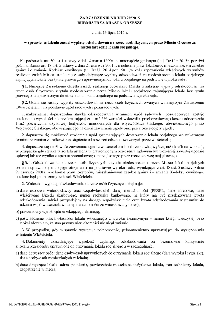 ZARZĄDZENIE NR VII/129/2015 BURMISTRZA MIASTA ORZESZE z dnia 23 lipca 2015 r. w sprawie ustalenia zasad wypłaty odszkodowań na rzecz osób fizycznych przez Miasto Orzesze za niedostarczenie lokalu socjalnego. Na podstawie art. 30 ust.1 ustawy z dnia 8 marca 1990r. o samorządzie gminnym ( t.j. Dz.U z 2013r. poz.594 późn. zm),oraz art. 18 ust. 5 ustawy z dnia 21 czerwca 2001 r. o ochronie praw lokatorów, mieszkaniowym zasobie gminy i o zmianie Kodeksu cywilnego (t.j. Dz.U. 2014 poz.150 )w celu zapewnienia właściwych warunków realizacji zadań Miasta, ustala się zasady dotyczące wypłaty odszkodowań za niedostarczenie lokalu socjalnego zajmującym lokale bez tytułu prawnego i uprawnionym do lokalu socjalnego na podstawie wyroku sądu . § 1. Niniejsze Zarządzenie określa zasady realizacji obowiązku Miasta w zakresie wypłaty odszkodowań na rzecz osób fizycznych z tytułu niedostarczenia przez Miasto lokalu socjalnego zajmującym lokale bez tytułu prawnego, a uprawnionym do otrzymania lokalu socjalnego na podstawie wyroku sądu. § 2. Ustala się zasady wypłaty odszkodowań na rzecz osób fizycznych zwanych w niniejszym Zarządzeniu „Właścicielem”, na podstawie ugód sądowych i pozasądowych: 1. maksymalna, dopuszczalna stawka odszkodowania w ramach ugód sądowych i pozasądowych, zostaje ustalona do wysokości nie przekraczającej za 1 m2 3% wartości wskaźnika przeliczeniowego kosztu odtworzenia 1 m2 powierzchni użytkowej budynków mieszkalnych dla województwa śląskiego, obwieszczonego przez Wojewodę Śląskiego, obowiązującego na dzień zawierania ugody oraz przez okres objęty ugodą; 2. dopuszcza się możliwość zawierania ugód gwarantujących dostarczenie lokalu socjalnego we wskazanym terminie w zamian za całkowite odstąpienie od roszczeń odszkodowawczych przez właściciela; 3. dopuszcza się możliwość zawierania ugód z właścicielami lokali ze stawką wyższą niż określona w pkt. 1, w przypadku gdy stawka ta została ustalona w prawomocnym orzeczeniu sądowym lub wcześniej zawartej ugodzie sądowej lub też wynika z operatu szacunkowego sporządzonego przez rzeczoznawcę majątkowego. § 3. 1. Odszkodowania na rzecz osób fizycznych z tytułu niedostarczenia przez Miasto lokali socjalnych osobom uprawnionym do jego otrzymania na podstawie wyroku sądu, wynikające z art. 18 ust. 5 ustawy z dnia 21 czerwca 2001r. o ochronie praw lokatorów, mieszkaniowym zasobie gminy i o zmianie Kodeksu cywilnego, ustalane będą na pisemny wniosek Właściciela. 2. Wniosek o wypłatę odszkodowania na rzecz osób fizycznych obejmuje: a) dane osobowe wnioskodawcy oraz współwłaścicieli danej nieruchomości (PESEL, dane adresowe, dane właściwego Urzędu skarbowego, numer rachunku bankowego, na który ma być przekazywana kwota odszkodowania, udział przypadający na danego współwłaściciela oraz kwota odszkodowania w stosunku do udziału współwłaściciela w danej nieruchomości za wnioskowany okres), b) prawomocny wyrok sądu orzekającego eksmisję, c) poświadczenie prawa własności lokalu wskazanego w wyroku eksmisyjnym – numer księgi wieczystej wraz z oświadczeniem, że stan prawny nieruchomości nie uległ zmianie. 3. W przypadku, gdy w sprawie występuje pełnomocnik, pełnomocnictwo uprawniające do występowania w imieniu Właściciela. 4. Dokumenty uzasadniające wysokość żądanego odszkodowania za z lokalu przez osoby uprawnione do otrzymania lokalu socjalnego a w szczególności: bezumowne korzystanie a) dane dotyczące osób: dane osoby/osób uprawnionych do otrzymania lokalu socjalnego (data wyroku i sygn. akt), dane osoby/osób zamieszkałych w lokalu; b) dane dotyczące lokalu: adres, położenie, powierzchnie mieszkalna i użytkowa lokalu, stan techniczny lokalu, zaopatrzenie w media; Id: 76710B01-3B3B-4C4B-9C88-D4E937A6815C. Przyjęty Strona 1 c) dokumenty świadczące o wysokości odszkodowania za bezumowne korzystanie z lokalu, do opłacania którego są zobowiązane osoby uprawnione do otrzymania lokalu socjalnego wraz z tabelarycznym zestawieniem naliczeń i wypłat dokonywanych przez te osoby w dochodzonym okresie; d) dokumenty potwierdzające wysokość opłat dodatkowych wraz z tabelarycznym zestawieniem naliczeń i wpłat dokonywanych przez te osoby w dochodzonym okresie; e) wypełniony wniosek o wypłatę odszkodowania wraz z opisem lokalu według wzoru stanowiącego załącznik nr 1i nr 2 do Zarządzenia; f) oświadczenie właściciela o wysokości czynszu jaki płacił lokator przed wyrokiem według wzoru stanowiącego załącznik nr 3 do Zarządzenia. 5. Ramowe warunki ugody zostały określone w załączniku nr 4 do Zarządzenia, którym jest projekt ugody, z tym zastrzeżeniem, iż zmianie nie mogą ulec postanowienia § 5. § 4. 1. Wszelkie dokumenty winny zostać złożone w oryginale lub w uwierzytelnionych kopiach. 2. Wniosek niekompletny, który nie zostanie uzupełniony w wyznaczonym terminie pozostawiony będzie bez rozpoznania. § 5. 1. Postępowanie w sprawie wypłaty odszkodowań na podstawie niniejszego Zarządzenia prowadzi Wydział Komunalny Urzędu Miejskiego w Orzeszu, który dokonuje weryfikacji wniosków złożonych przez właścicieli lokali ubiegających się o wypłatę odszkodowania. 2. W sprawie ustalenia wysokości odszkodowania prowadzone będą negocjacje z Właścicielem. Podstawą do zawarcia ugody jest sporządzony protokół z negocjacji. § 6. 1. W przypadku pozytywnej oceny złożonych dokumentów, zostanie przygotowana propozycja ugody określająca wysokość proponowanego odszkodowania, które w ocenie Miasta jest bezsporne i nie budzące wątpliwości. 2. Wypłata odszkodowania na wskazany przez wierzyciela rachunek bankowy następuje w terminie wskazanym w ugodzie. 3. Wypłatę odszkodowania realizuje Referat Finansowy ds. Budżetowych Urzędu Miejskiego w Orzeszu w ramach zaplanowanych środków finansowych na realizację tego zadania na podstawie dyspozycji Wydzi