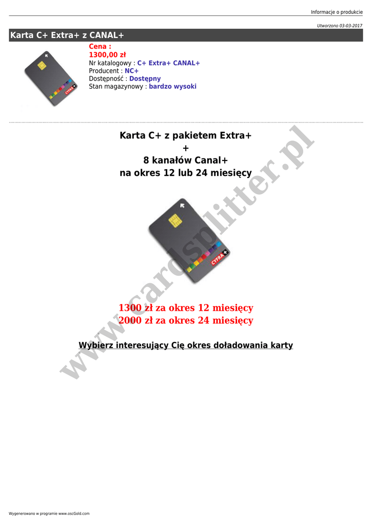 Informacje o produkcie Utworzono 03-03-2017 Karta C+ Extra+ z CANAL+ Cena : 1300,00 zł Nr katalogowy : C+ Extra+ CANAL+ Producent : NC+ Dostępność : Dostępny Stan magazynowy : bardzo wysoki ar d sp lit te r .p l Karta C+ z pakietem Extra+ + 8 kanałów Canal+ na okres 12 lub 24 miesięcy w .c 1300 zł za okres 12 miesięcy 2000 zł za okres 24 miesięcy w w Wybierz interesujący Cię okres doładowania karty Wygenerowano w programie www.oscGold.com .p l sp lit te r ar d w .c w w Oferta zawierająca flagowe kanały NC+, czyli pakiet 8 kanałów CANAL+ Karta jest ważna od daty wysyłki. Można ją używać w dowolnym dekoderze lub module CI, akceptującym karty kodowe systemu Seca Mediaguard. Pakiet telewizji NC+ (Cyfra +) bez miesięcznego abonamentu i rachunków !!! Do zakupu karty kodowej nie są wymagane żadne polskie dokumenty. Pakiet Extra+ z CANAL+ zawiera następujące kanały: Informacje o produkcie w w w .c ar d sp lit te r .p l CANAL+ HD, CANAL+ 1 HD, CANAL+ FILM HD, CANAL+ SERIALE HD, CANAL+ DISCOVERY HD, CANAL+ FAMILY HD, CANAL+ SPORT HD, CANAL+ SPORT2 HD, MINIMINI+ HD, ALE KINO+ HD, DOMO+ HD, PLANETE+ HD, TELETOON+ HD, KUCHNIA+ HD, NSPORT+ HD, AXN SPIN HD, ROMANCE TV HD, KINO POLSKA, 13 ULICA, TVP SERIALE, STOPKLATKA TV, TVP SPORT HD, TVN TURBO HD, POLSAT SPORT NEWS, TVP ABC, DISCOVERY HISTORIA, TVP HISTORIA, TVP KULTURA, FOKUS TV, TVN HD, TVN7 HD, TVN STYLE HD, POLSAT HD, TVP1 HD, TVP2 HD, TVP POLONIA, TVP ROZRYWKA, POLSAT 2, PULS 2, TTV, TV4, TV6, TV PULS, ESKA TV, POLO TV, VIVA, MUZO.TV, VOX MUSIC TV, MJUZIK.TV, POLONIA 1, MANGO 24, TV DISCO, POWER TV, 4FUN TV, TELE 5, TVS, TVN24 HD, TVN24 BIZNES I ŚWIAT, TVN METEO ACTIVE, TVP INFO, TVP REGIONALNA, POLSAT NEWS 2, REPUBLIKA, TV5MONDE, CNBC EUROPE, BBC WORLD, BLOOMBERG, FRANCE24, FOX HD, AXN HD, BBC HD, TVN FABUŁA, POLSAT FILM HD, POLSAT ROMANS, CBS DRAMA, EUROSPORT HD, BBC BRIT HD, ORANGE SPORT, POLSAT PLAY, DA VINCI LEARNING, DISNEY JUNIOR, DISNEY XD, DISNEY CHENNEL, JIM JAM, DISCOVERY CHANNEL HD, NAT GEO WILD HD, NATIONAL GEOGRAPHIC CHANNEL HD, TRAVEL CHANNEL, TLC HD, TVP HD, TRACE URBAN, E! ENTERTAINMENT, MTV, POLSAT CAFE, DISCO POLO MUSIC, CBS REALITY, DISCOVERY LIFE, CI POLSAT, POLSAT NEWS HD, CNN, SUPERSTACJA, FOX COMEDY HD, MGM HD, COMEDY CENTRAL HD, PARAMOUNT CHANNEL HD, UNIVERSAL CHANNEL HD, SCIFI UNIVERSAL, AXN WHITE, AXN BLACK, FILMBOX, COMEDY CENTRAL FAMILY, CBS ACTION, CBS EUROPA, TCM, EUROSPORT 2 HD, DISCOVERY TURBO XTRA HD, EXTREME SPORTS, MOTOWIZJA, NICKELODEON HD, NICKELODEON, NICK JR, BABY TV, BBC CBEEBIES, BOOMERANG, CARTOON NETWORK, ANIMAL PLANET HD, BBC EARTH HD, DISCOVERY SCIENCE, LIFETIME HD, ID HD, MTV LIVE HD, MTV ROCKS, VH1, BBC LIFESTYLE, KINO POLSKA MUZYKA Wygenerowano w programie www.oscGold.com .p l sp lit te r ar d ● ● Angielskiej Premier League, Francuskiej Ligue 1, Polskiej T-Mobile Ekstraklasy. w w ● w .c Na kanałach Canal+ Sport HD i Canal+ Sport2 HD dostępne są transmisje z meczów najlepszych lig piłkarskich Świata, w tym: Zakup pakiet już dziś i ciesz się możliwością oglądania najlepszych widowisk piłkarskich na Świecie, włączając w to mecze Ligi Mistrzów!!! Jeżeli ta lista kanałów jest dla Ciebie nazbyt uboga, to zapraszamy do zapoznania się z naszą bogatą ofertą pakietów nc+ http://cardsplitter.pl/karty-kodowe-c-37_180.html Wybierz odpowiedni dla siebie pakiet w możliwie najniższych cenach !!! Dostępne opcje Karta C+ Extra+ z CANAL+ » Ilość miesięcy: 12, 24 (+700,00 zł).