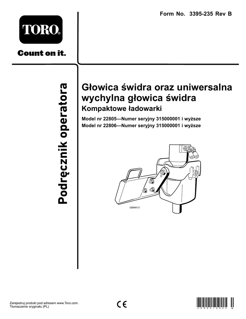 Form No. 3395-235 Rev B Głowica świdra oraz uniwersalna wychylna głowica świdra Kompaktowe ładowarki Model nr 22805—Numer seryjny 315000001 i wyższe Model nr 22806—Numer seryjny 315000001 i wyższe Zarejestruj produkt pod adresem www.Toro.com. Tłumaczenie oryginału (PL) *3395-235* B OSTRZEŻENIE KALIFORNIA Propozycja 65 ostrzeżenie Ten produkt zawiera jeden lub więcej związków chemicznych uznanych w Stanie Kalifornia za wywołujące raka, uszkodzenia płodu lub działające szkodliwie dla rozrodczości. Użycie tego produktu może skutkować narażeniem się na działanie związków chemicznych uznanych w Stanie Kalifornia za wywołujące raka, uszkodzenia płodu lub działające szkodliwie dla rozrodczości. g004523 Rysunek 1 Niniejszy produkt spełnia wymagania stosownych dyrektyw europejskich. Więcej informacji zawiera deklaracja włączenia na końcu niniejszej broszury. 1. Położenie numeru modelu i numeru seryjnego Model nr Wprowadzenie Numer seryjny Ta maszyna to świder o napędzie hydraulicznym będący osprzętem do ładowarek kompaktowych Toro. Służy ona do wykonywania w glebie pionowych otworów niezbędnych przy budowie słupów, sadzeniu roślin, do innych celów budowlanych oraz związanych z kształtowaniem terenów zielonych. Nie jest ona przeznaczona do wiercenia otworów w nawierzchniach utwardzonych, betonowych lub warstwie lodu. Niniejsza instrukcja zawiera opis potencjalnych zagrożeń, a zawarte w niej ostrzeżenia zostały oznaczone symbolem ostrzegawczym (Rysunek 2), który sygnalizuje niebezpieczeństwo, mogące spowodować poważne obrażenia lub śmierć w razie zlekceważenia zalecanych środków ostrożności. Należy przeczytać uważnie poniższe informacje, aby poznać zasady właściwej obsługi i konserwacji urządzenia, nie uszkodzić go i uniknąć obrażeń ciała. Odpowiedzialność za prawidłowe i bezpieczne użytkowanie produktu spoczywa na użytkowniku. Rysunek 2 g000502 1. Symbol ostrzegawczy Z firmą Toro można skontaktować się bezpośrednio poprzez stronę www.Toro.com w kwestiach dotyczących materiałów szkoleniowych z zakresu bezpieczeństwa oraz eksploatacji produktu, informacji na temat akcesoriów, pomocy w znalezieniu autoryzowanego sprzedawcy lub rejestracji urządzenia. W niniejszej instrukcji występują dwa słowa podkreślające wagę informacji. Ważne zwraca uwagę na szczególne informacje techniczne, a Uwaga podkreśla informacje ogólne wymagające uwagi. Aby skorzystać z serwisu, zakupić oryginalne części firmy Toro lub uzyskać dodatkowe informacje, należy skontaktować się z autoryzowanym przedstawicielem serwisowym lub biurem obsługi klienta firmy Toro. Prosimy o przygotowanie numeru modelu i numeru seryjnego produktu. Rysunek 1 przedstawia położenie oznaczenia modelu oraz numeru seryjnego na urządzeniu. Należy zapisać je w przewidzianym na to miejscu. © 2016—The Toro® Company 8111 Lyndale Avenue South Bloomington, MN 55420 2 Napisz do nas pod adres www.Toro.com. Wydrukowano w Stanach Zjednoczonych. Wszelkie prawa zastrzeżone Spis treści Bezpieczeństwo Bezpieczeństwo ............................................................. 3 Wskaźniki stabilności ............................................... 4 Naklejki informacyjne i ostrzegawcze ........................ 5 Przegląd produktu .......................................................... 6 Specyfikacje ........................................................... 6 Działanie ...................................................................... 6 Instalowanie świdra ................................................. 6 Wiercenie otworu .................................................... 8 Odłączanie świdra ................................................... 8 Konserwacja ................................................................. 9 Zalecany harmonogram konserwacji ............................. 9 Smarowanie osi obrotu w ramionach jarzma ................ 9 Wymiana oleju w przekładni planetarnej ..................... 9 Przechowywanie ...........................................................10 Rozwiązywanie problemów ............................................11 Nieprawidłowe użytkowanie lub czynności obsługowe przeprowadzane przez operatora lub właściciela mogą doprowadzić do obrażeń ciała. Aby zmniejszyć ryzyko obrażeń, należy przestrzegać zaleceń bezpieczeństwa umieszczonych poniżej oraz w Instrukcji obsługi zespołu jezdnego. Należy zwracać szczególną uwagę na symbol alarmu bezpieczeństwa, tj. Uwaga, Ostrzeżenie lub Niebezpieczeństwo — są to instrukcje dotyczące bezpieczeństwa osobistego. Nieprzestrzeganie zasad bezpieczeństwa może doprowadzić do obrażeń lub śmierci. NIEBEZPIECZEŃSTWO W obszarze roboczym mogą występować podziemne instalacje elektryczne, gazowe i/lub linie telefoniczne. W przypadku dokopania się do którejś z wymienionych instalacji może dojść do porażenia prądem lub wybuchu. Na obszarze pracy należy oznaczyć instalacje podziemne i nie kopać w oznaczonych obszarach. Proszę skontaktować się z lokalnymi służbami zajmującymi się oznaczaniem lub firmą użyteczności publicznej w celu oznaczenia nieruchomości (np. w Stanach Zjednoczonych proszę zadzwonić pod numer 811 w celu połączenia się z krajowymi służbami ds. oznaczeń). OSTRZEŻENIE Przy wyłączonym silniku osprzęt znajdujący się w pozycji uniesionej może stopniowo opadać. Osoby znajdujące się w pobliżu mogą zostać przygniecione lub zranione przez opuszczający się osprzęt. Przy każdym wyłączeniu zespołu jezdnego osprzęt należy opuszczać na podłoże. OSTRZEŻENIE Podczas wjeżdżania na wzniesienie lub zjeżdżania z niego istnieje niebezpieczeństwo przewrócenia się maszyny, jeżeli jej cięższa strona skierowana jest w dół zbocza. Przewrócenie się maszyny niesie ryzyko przygniecenia lub poważnego zranienia osób. W górę i w dół zbocza należy