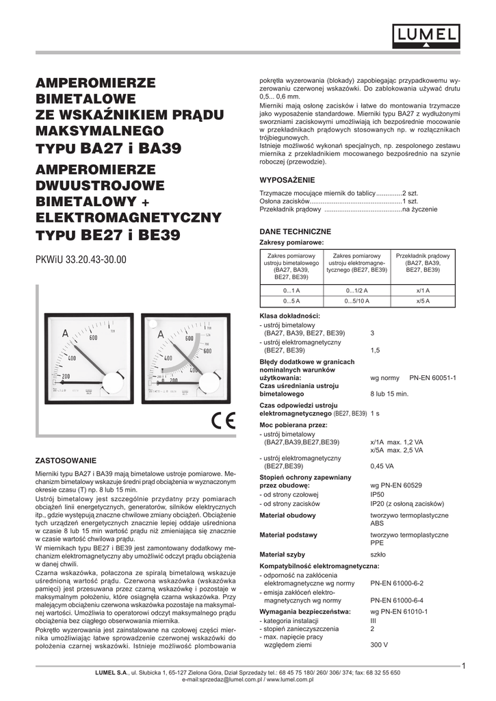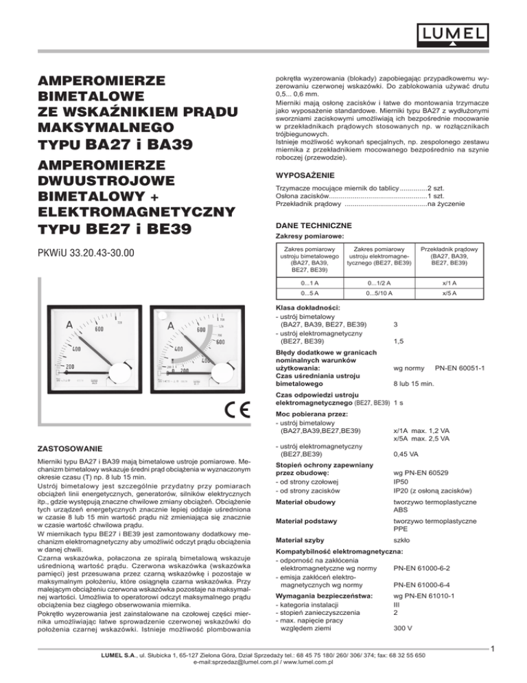 AMPEROMIERZE BIMETALOWE ZE WSKAŹNIKIEM PR¥DU MAKSYMALNEGO Typu BA27 i BA39 AMPEROMIERZE DWUUSTROJOWE BIMETALOWY + ELEKTROMAGNETYCZNY Typu BE27 i BE39 PKWiU 33.20.43-30.00 pokrêt³a wyzerowania (blokady) zapobiegaj¹c przypadkowemu wyzerowaniu czerwonej wskazówki. Do zablokowania u¿ywaæ drutu. 0,5... 0,6 mm. Mierniki maj¹ os³onê zacisków i ³atwe do montowania trzymacze jako wyposa¿enie standardowe. Mierniki typu BA27 z wyd³u¿onymi sworzniami zaciskowymi umo¿liwiaj¹ ich bezpoœrednie mocowanie w przek³adnikach pr¹dowych stosowanych np. w roz³¹cznikach trójbiegunowych. Istnieje mo¿liwoœæ wykonañ specjalnych, np. zespolonego zestawu miernika z przek³adnikiem mocowanego bezpoœrednio na szynie roboczej (przewodzie). WYPOSA¯ENIE Trzymacze mocuj¹ce miernik do tablicy...............2 szt. Os³ona zacisków..................................................1 szt. Przek³adnik pr¹dowy ...........................................na ¿yczenie DANE TECHNICZNE Zakresy pomiarowe: Zakres pomiarowy ustroju bimetalowego (BA27, BA39, . BE27, BE39) Zakres pomiarowy ustroju elektromagnetycznego (BE27, BE39) Przek³adnik pr¹dowy (BA27, BA39, . BE27, BE39) 0...1 A 0...1/2 A x/1 A 0...5 A 0...5/10 A x/5 A Klasa dok³adnoœci: - ustrój bimetalowy . (BA27, BA39, BE27, BE39) - ustrój elektromagnetyczny . (BE27, BE39) 3 B³êdy dodatkowe w granicach nominalnych warunków u¿ytkowania: Czas uœredniania ustroju bimetalowego wg normy PN-EN 60051-1 1,5 8 lub 15 min. Czas odpowiedzi ustroju elektromagnetycznego (BE27, BE39) 1 s ZASTOSOWANIE Mierniki typu BA27 i BA39 maj¹ bimetalowe ustroje pomiarowe. Mechanizm bimetalowy wskazuje œredni pr¹d obci¹¿enia w wyznaczonym okresie czasu (T) np. 8 lub 15 min. Ustrój bimetalowy jest szczególnie przydatny przy pomiarach obci¹¿eñ linii energetycznych, generatorów, silników elektrycznych itp., gdzie wystêpuj¹ znaczne chwilowe zmiany obci¹¿eñ. Obci¹¿enie tych urz¹dzeñ energetycznych znacznie lepiej oddaje uœredniona. w czasie 8 lub 15 min wartoœæ pr¹du ni¿ zmieniaj¹ca siê znacznie. w czasie wartoœæ chwilowa pr¹du. W miernikach typu BE27 i BE39 jest zamontowany dodatkowy mechanizm elektromagnetyczny aby umo¿liwiæ odczyt pr¹du obci¹¿enia w danej chwili. Czarna wskazówka, po³aczona ze spiral¹ bimetalow¹ wskazuje uœrednion¹ wartoœæ pr¹du. Czerwona wskazówka (wskazówka pamiêci) jest przesuwana przez czarn¹ wskazówkê i pozostaje w maksymalnym po³o¿eniu, które osi¹gnê³a czarna wskazówka. Przy malej¹cym obci¹¿eniu czerwona wskazówka pozostaje na maksymalnej wartoœci. Umo¿liwia to operatorowi odczyt maksymalnego pr¹du obci¹¿enia bez ci¹g³ego obserwowania miernika. Pokrêt³o wyzerowania jest zainstalowane na czo³owej czêœci miernika umo¿liwiaj¹c ³atwe sprowadzenie czerwonej wskazówki do po³o¿enia czarnej wskazówki. Istnieje mo¿liwoœæ plombowania. Moc pobierana przez: - ustrój bimetalowy . (BA27,BA39,BE27,BE39) - ustrój elektromagnetyczny . (BE27,BE39) x/1A max. 1,2 VA x/5A max. 2,5 VA 0,45 VA Stopieñ ochrony zapewniany przez obudowê: - od strony czo³owej - od strony zacisków wg PN-EN 60529 IP50 IP20 (z os³on¹ zacisków) Materia³ obudowy tworzywo termoplastyczne. ABS Materia³ podstawy tworzywo termoplastyczne . PPE Materia³ szyby szk³o Kompatybilnoœæ elektromagnetyczna: - odpornoœæ na zak³ócenia . elektromagnetyczne wg normy PN-EN 61000-6-2 - emisja zak³óceñ elektro-. magnetycznych wg normy PN-EN 61000-6-4 Wymagania bezpieczeñstwa: - kategoria instalacji - stopieñ zanieczyszczenia - max. napiêcie pracy . wzglêdem ziemi wg PN-EN 61010-1 III 2 300 V LUMEL S.A., ul. Słubicka 1, 65-127 Zielona Góra, Dzia³ Sprzeda¿y tel.: 68 45 75 180/ 260/ 306/ 374; fax: 68 32 55 650. e-mail:[email protected] / www.lumel.com.pl Masa: - BA27 - BE27 - BA39 - BE39 WYMIARY ZEWNÊTRZNE I MONTA¯OWE 0,16 kg 0,20 kg 0,22 kg 0,27 kg Kategorie wykonañ klimatycznych mierników Jeœli w zamówieniu nie podano inaczej, mierniki s¹ przeznaczone do stosowania w pomieszczeniach zamkniêtych nie klimatyzowanych w warunkach klimatu umiarkowanego wg normy. PN-EN60051: 1999 Na ¿yczenie zamawiaj¹cego mierniki mog¹ byæ przystosowane do u¿ytkowania w warunkach klimatu tropikalnego suchego lub mokrego, tak¿e w pomieszczeniach zamkniêtych nieklimatyzowanych - s¹ wtedy oznakowane symbolem TIII. Zakres temperatury pracy mierników Mierniki dzia³aj¹ bez uszkodzeñ w zakresie temperatur od - 25°C do + 40°C zgodnie z obowi¹zuj¹cymi normami. Dopasowanie zakresu pomiarowego miernika do zakresów przekładników: przez wymianę podzielni; sposób wymiany podzielni pokazany jest w instrukcji obsługi. Typ miernika a b d BA27 i BE27 68+0,7 72 61,5 BA39 i BE39 92+0,8 96 61,5 KOD WYKONAÑ KOD I OZNACZENIE POZYCJI PRACY MIERNIKA Tablica1 Kod zakresu F201 F205 F3 F301 F305 F306 F307 F308 F309 F311 F312 F313 F314 F315 F316 F317 F318 F320 F321 F322 F323 F324 F350 F351 F352 F354 F355 F356 F357 F359 F365 Opis zakresu (zakres pomiarowy) 1,2 A 6A 1,2XA X/1 1,2 A 1/1 6 A 5/1 7,2 A 6/1 12 A 10/1 18 A 15/1 24 A 20/1 36 A 30/1 48 A 40/1 60 A 50/1 72 A 60/1 96 A 80/1 120 A 100/1 180 A 150/1 240 A 200/1 360 A 300/1 480 A 400/1 600 A 500/1 720 A 600/1 960 A 800/1 1200 A 1k/1 1800 A 1,5k/1 2400 A 2k/1 3600 A 3k/1 4800 A 4k/1 6000 A 5k/1 7200 A 6k/1 12000 A 10k/1 1440 A 1,2k/1 Kod zakresu F366 F4 F405 F406 F407 F408 F409 F411 F412 F413 F414 F415 F416 F417 F418 F420 F421 F422 F423 F424 F450 F451 F452 F454 F455 F456 F457 F459 F465 F466 1920 A 1,6k/1 1,2XA X/5 6 A 5/5 7,2 A 6/5 12 A 10/5 18 A 15/5 24 A 20/5 36 A 30/5 48 A 40/5 60 A 50/5 72 A 60/5 96 A 80/5 120 A 100/5 180 A 150/5 240 A 200/5 360 A 300/5 480 A 400/5 600 A 500/5 720 A 600/5 960 A 800/5 1200 A 1k/5 1800 A 1,5k/5 2400 A 2k/5 3600 A 3k/5 4800 A 4k/5 6000 A 5k/5 7200 A 6k/5 12000 A 10k/5 1440 A 1,2k/5 1920 A 1,6k/5 Tablica 2 Kod MIERNIKI BIMETALOWE BA27, BE27, BA39, BE39 Opis zakresu (zakres pomiarowy) 0 B C D E F G H K Pozycja pracy C3 90° C1 0° C2 