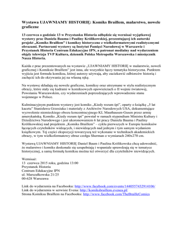 Wystawa UJAWNIAMY HISTORIĘ: Komiks Braillem, malarstwo, nowele graficzne 13 czerwca o godzinie 13 w Przystanku Historia odbędzie się wernisaż wyjątkowej wystawy prac Daniela Bauma i Pauliny Królikowskiej, prezentującej ich autorski projekt „Komiks Braillem” i komiksy historyczne z wielkoformatowymi realistycznymi obrazami. Partnerami wystawy są Instytut Pamięci Narodowej w Warszawie i Przystanek Historia Centrum Edukacyjne IPN, a patronat medialny nad wydarzeniem objęły telewizja TVP Kultura, dziennik Polska Metropolia Warszawska i miesięcznik Nasza Historia. Każda z prac prezentowanych na wystawie „UJAWNIAMY HISTORIĘ w malarstwie, noweli graficznej i Komiksie Braillem” jest inna, ale wszystkie łączy tematyka historyczna. Punktem wyjścia jest formuła komiksu, której autorzy używają, aby zaciekawić odbiorców historią i zachęcić ich do okrywania jej na własną rękę. Na wystawę składają się nowele graficzne, komiksy oraz utrzymane w stylu realistycznym obrazy, które stały się kadrami w komiksowych opowieściach o II wojnie światowej, Powstaniu Warszawskim, czy wydarzeniach poprzedzających wprowadzenie stanu wojennego w Polsce. Kulminacyjnym punktem wystawy jest komiks „Kiedy rozum śpi”, oparty o książkę „5 lat kacetu” Stanisława Grzesiuka i materiały z Archiwów Narodowych USA, dokumentujące wyzwolenie niemieckiego obozu koncentracyjnego KL Mauthausen-Gusen przez armię amerykańską. Komiks „Kiedy rozum śpi” powstał w ramach stypendium Ministra Kultury i Dziedzictwa Narodowego i jest ukoronowaniem 6 lat pracy Daniela Bauma i Pauliny Królikowskiej nad projektem „Komiks Braillem” – cyklu pierwszych w Europie komiksów łączących czytelników widzących, i niewidzących nad jednym i tym samym wydaniem książkowym. Tej części ekspozycji towarzyszą też wykonane w technikach akademickich obrazy, w tym wielkoformatowy obraz czołgu Sherman o wymiarach 240x270 cm. Wystawą UJAWNIAMY HISTORIĘ Daniel Baum i Paulina Królikowska chcą udowodnić, że malarstwo i komiks doskonale się uzupełniają i wspaniale sprawdzają się w tematyce historycznej, a samą formułę komiksu można też otworzyć dla czytelników niewidzących. Wernisaż: 13 czerwca 2015 roku, godzina 13:00 Przystanek Historia Centrum Edukacyjne IPN ul. Marszałkowska 21/25 00-628 Warszawa Link do wydarzenia na Facebooku: http://www.facebook.com/events/1440557432914106/ Link do wydarzenia w serwisie Evena: http://komiksbraillem.evenea.pl/ Strona Komiksu Braillem na Facebooku: http://www.facebook.com/TheBrailleComics