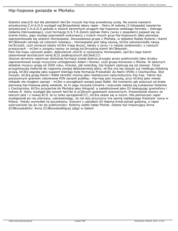 Płońszczak - Gazeta lokalna - Płońsk, Raciąż, Baboszewo, Czerwińsk, Dzierzążnia, Joniec, Naruszewo Hip-hopowa gwiazda w Płońsku Sobotni wieczÃłr był dla płońskich fanÃłw muzyki hip-hop prawdziwą ucztą. Na scenie kawiarni artystycznej C.H.A.O.S wystąpił ogÃłlnopolskiej sławy raper - Ostry.W sobotę (3 listopada) kawiarnia artystyczna C.H.A.O.S gościła w swoich skromnych progach hip-hopowca wielkiego formatu - Ostrego (Adama Ostrowskiego), czyli formację O.S.T.R.Zanim jednak Ostry (wraz z zespołem) pojawił się na scenie klubu, jego występ poprzedzili wykonawcy z trzech innych grup hip-hopowych.Jako pierwsza zaprezentowała się widzom Homeopatia. Dwuosobowa grupa z Płońska, w składzie Radek Rutecki i Kamil WrÃłblewski istnieje od czterech miesięcy.- Homeopatia jest taką nazwą, ktÃłra odzwierciedla naszą twÃłrczość, czyli oznacza teksty ktÃłre mają leczyć, teksty o życiu i o naszej osobowości, o naszych przeżyciach - mÃłwi o związku nazwy ze swoją twÃłrczością Kamil WrÃłblewski. Fani hip-hopu usłyszeli jeden, debiutancki utwÃłr w wykonaniu Homeopatii, oprÃłcz tego Kamil zaserwował słuchaczom serię „podkręconych bitÃłw―. Jeszcze skromny repertuar płońskiej formacji został dobrze przyjęty przez publiczność.Jako drudzy zaprezentowali swoje muzyczne umiejętności Adam i Komar, czyli grupa Konexion z Płocka. W obecnym składzie muzycy grają od 2005 roku, chociaż, jak twierdzą, hip-hopem zajmują się od zawsze. Teraz przygotowują materiał do nagrania swojej debiutanckiej płyty, ktÃłra ma się ukazać już niedługo.Ostatnią grupą, ktÃłra zagrała jako support Ostrego była formacja Przeszłość Za Nami (PZN) z Ciechocinka. Styl muzyki, ktÃłrą grają Kamil i Rafał określić można jako realistyczno-optymistyczny hip-hop. Takim też, pozytywnym graniem członkowie PZN zarazili publikę.- Hip-hop jest muzyką, przy ktÃłrej jako młody chłopak nie mogłem zasnąć - mÃłwi o początkach swojej pasji Rafał. Od momentu jak pożyczył od brata pierwszą hip-hopową płytę wiedział, że to jego muzyka.Uznanie i szacunek należą się Łukaszowi Golemie z Ciechocinka, ktÃłry przyjechał do Płońska jako fotograf, a zadebiutował jako DJ obsługując gramofony i mikser. Ostry wystąpił dla swoich fanÃłw w pÃłźnych godzinach wieczornych. Prezentował utwory ze starych płyt i z nowej „Ja tu tylko sprzątam―, ktÃłra ukaże się w lutym. Dla płońszczan raper występował po raz pierwszy, udowadniając, że nie bez przyczyny ma opinię najlepszego freestyle`owca w Polsce. Teksty wymyślał na poczekaniu. Koncert z udziałem DJ Haema trwał ponad godzinę, a raper wykrzykiwał raz po raz do publiczności: Robimy wielki hałas Płońsk. Odzew był imponujący.Anna ZiÃłłkowskafoto: Anna ZiÃłłkowskaWięcej zdjęć w Galerii http://www.plonszczak.pl Kreator PDF Utworzono 3 March, 2017, 11:51