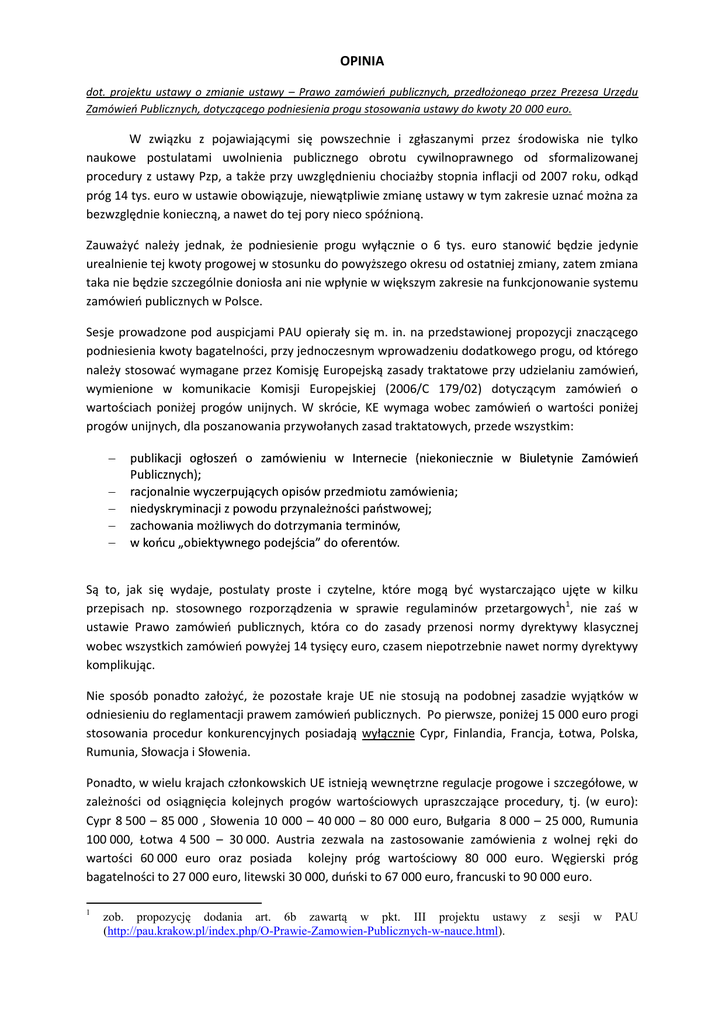OPINIA dot. projektu ustawy o zmianie ustawy – Prawo zamówień publicznych, przedłożonego przez Prezesa Urzędu Zamówień Publicznych, dotyczącego podniesienia progu stosowania ustawy do kwoty 20 000 euro. W związku z pojawiającymi się powszechnie i zgłaszanymi przez środowiska nie tylko naukowe postulatami uwolnienia publicznego obrotu cywilnoprawnego od sformalizowanej procedury z ustawy Pzp, a także przy uwzględnieniu chociażby stopnia inflacji od 2007 roku, odkąd próg 14 tys. euro w ustawie obowiązuje, niewątpliwie zmianę ustawy w tym zakresie uznać można za bezwzględnie konieczną, a nawet do tej pory nieco spóźnioną. Zauważyć należy jednak, że podniesienie progu wyłącznie o 6 tys. euro stanowić będzie jedynie urealnienie tej kwoty progowej w stosunku do powyższego okresu od ostatniej zmiany, zatem zmiana taka nie będzie szczególnie doniosła ani nie wpłynie w większym zakresie na funkcjonowanie systemu zamówień publicznych w Polsce. Sesje prowadzone pod auspicjami PAU opierały się m. in. na przedstawionej propozycji znaczącego podniesienia kwoty bagatelności, przy jednoczesnym wprowadzeniu dodatkowego progu, od którego należy stosować wymagane przez Komisję Europejską zasady traktatowe przy udzielaniu zamówień, wymienione w komunikacie Komisji Europejskiej (2006/C 179/02) dotyczącym zamówień o wartościach poniżej progów unijnych. W skrócie, KE wymaga wobec zamówień o wartości poniżej progów unijnych, dla poszanowania przywołanych zasad traktatowych, przede wszystkim: Są to, jak się wydaje, postulaty proste i czytelne, które mogą być wystarczająco ujęte w kilku przepisach np. stosownego rozporządzenia w sprawie regulaminów przetargowych1, nie zaś w ustawie Prawo zamówień publicznych, która co do zasady przenosi normy dyrektywy klasycznej wobec wszystkich zamówień powyżej 14 tysięcy euro, czasem niepotrzebnie nawet normy dyrektywy komplikując. Nie sposób ponadto założyć, że pozostałe kraje UE nie stosują na podobnej zasadzie wyjątków w odniesieniu do reglamentacji prawem zamówień publicznych. Po pierwsze, poniżej 15 000 euro progi stosowania procedur konkurencyjnych posiadają wyłącznie Cypr, Finlandia, Francja, Łotwa, Polska, Rumunia, Słowacja i Słowenia. Ponadto, w wielu krajach członkowskich UE istnieją wewnętrzne regulacje progowe i szczegółowe, w zależności od osiągnięcia kolejnych progów wartościowych upraszczające procedury, tj. (w euro): Cypr 8 500 – 85 000 , Słowenia 10 000 – 40 000 – 80 000 euro, Bułgaria 8 000 – 25 000, Rumunia 100 000, Łotwa 4 500 – 30 000. Austria zezwala na zastosowanie zamówienia z wolnej ręki do wartości 60 000 euro oraz posiada kolejny próg wartościowy 80 000 euro. Węgierski próg bagatelności to 27 000 euro, litewski 30 000, duński to 67 000 euro, francuski to 90 000 euro. 1 zob. propozycję dodania art. 6b zawartą w pkt. III projektu ustawy (http://pau.krakow.pl/index.php/O-Prawie-Zamowien-Publicznych-w-nauce.html). z sesji w PAU Podkreślić należy, że powyższe progi dotyczą przede wszystkim wymogu publicznego ogłoszenia o przetargu czy o prowadzeniu negocjacji. Jak wynika z opracowania OECD, tylko te kraje przenoszą całościowo przetargowe procedury unijne poniżej progów dyrektywy: Polska (14 000 euro), Włochy (20 000 euro) i Czechy (70 000 euro)2. Powyżej przytoczone wartości to progi „bagatelności” prawa zamówień publicznych a następne to progi stosowania znacznie uproszczonych procedur przetargowych bądź negocjacyjnych z wymogiem publicznego ogłoszenia (przewidując rozmaite rozwiązania w zależności od specyfiki krajowej), aż do osiągnięcia progów wartości, które wymagają zawarcia umowy za pomocą unijnych procedur przetargowych. Podkreślić warto, że nawet we Francji publikacja w Krajowym Biuletynie Zamówień wymagana jest dopiero od 90 000 euro. Jednocześnie zważyć należy, czy wraz z podniesieniem progu bagatelności ustawy nie należy wprowadzić do aktu normy kompetencyjnej uprawniającej do zastosowania ustawy do zamówień normami prawa zamówień publicznych nieobjętych (art. 4 Pzp ab initio), gdyż mimo pozornej możliwości wyprowadzenia takiego uprawnienia z arg. a maiori, w aktualnym stanie prawnym ustawa nie wprowadza w tym zakresie rozróżnienia. Ponadto, należy zaznaczyć, że wraz z regulacją kwot progowych w obszarze zamówień publicznych, należy jak najszybciej doprecyzować ustawę – Prawo zamówień publicznych w zakresie norm dotyczących ustalania wartości zamówienia (art. 32 i nast. uPzp), przede wszystkim w zakresie zamówień udzielanych w częściach3, bowiem, co podnoszono i do czego przychyla się również Urząd Zamówień Publicznych, aktualne normy są zbyt skąpo wyrażone w ustawie. Prowadzić to jednak może nie tylko do nadmiernej uznaniowości przy ocenie naruszenia norm zakazu dzielenia zamówień, ale również, przeciwnie, do prostego obalania dowodu na zaistnienie takiego naruszenia. Rekapitulując należy uznać zmianę progu stosowania przepisów Pzp za konieczną, jednakże nie dającą się obronić w takim kształcie, w jakim została zaproponowana przez Urząd Zamówień Publicznych. Opracował: Adam Jaracz prawnik w Instytucie Nauk Geologicznych PAN 2 3 OECD (2010), “Public Procurement in EU Member States - The Regulation of Contract Below the EU Thresholds and in Areas not Covered by the Detailed Rules of the EU Directives”, Sigma Papers, No. 45, OECD Publishing. http://dx.doi.org/10.1787/5km91p7s1mxv-en Na przykład postulowane nadanie art. 32 ust. 2 następującego brzmienia z dodaniem ust. 2a i 2b: „2. Zamawiający może udzielić zamówienia o ustalonym zakresie w drodze odrębnych postępowań, jeżeli podział tego zamówienia na części jest możliwy, z zastrzeżeniem ust. 2a i 2b. 2a. Z zastrzeżeniem art. 6a, zakazane są podziały robót budowlanych bądź podziały planowanego nabycia podobnych us