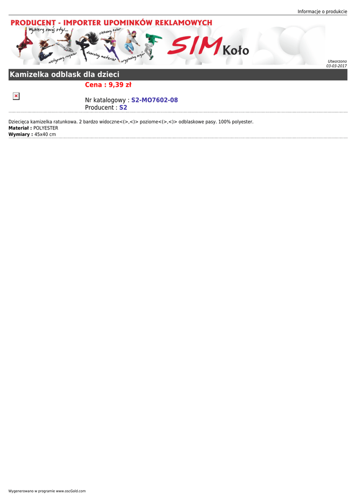 Informacje o produkcie Utworzono 03-03-2017 Kamizelka odblask dla dzieci Cena : 9,39 zł Nr katalogowy : S2-MO7602-08 Producent : S2 Dziecięca kamizelka ratunkowa. 2 bardzo widoczne<(>,<)> poziome<(>,<)> odblaskowe pasy. 100% polyester. Materiał : POLYESTER Wymiary : 45x40 cm Wygenerowano w programie www.oscGold.com
