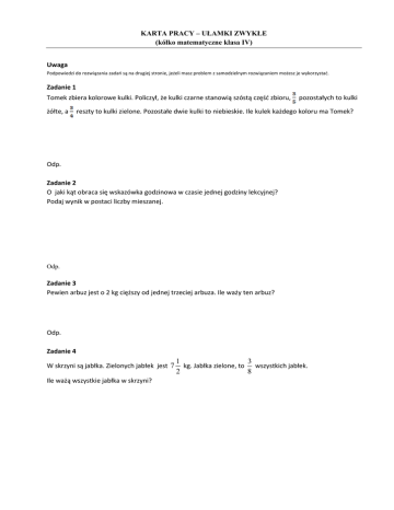 KARTA PRACY – UŁAMKI ZWYKŁE (kółko matematyczne klasa IV) Uwaga Podpowiedzi do rozwiązania zadań są na drugiej stronie, jeżeli masz problem z samodzielnym rozwiązaniem możesz je wykorzystać. Zadanie 1 Tomek zbiera kolorowe kulki. Policzył, że kulki czarne stanowią szóstą część zbioru, żółte, a pozostałych to kulki reszty to kulki zielone. Pozostałe dwie kulki to niebieskie. Ile kulek każdego koloru ma Tomek? Odp. Zadanie 2 O jaki kąt obraca się wskazówka godzinowa w czasie jednej godziny lekcyjnej? Podaj wynik w postaci liczby mieszanej. Odp. Zadanie 3 Pewien arbuz jest o 2 kg cięższy od jednej trzeciej arbuza. Ile waży ten arbuz? Odp. Zadanie 4 W skrzyni są jabłka. Zielonych jabłek jest 7 Ile ważą wszystkie jabłka w skrzyni? 1 3 kg. Jabłka zielone, to wszystkich jabłek. 8 2 Podpowiedzi do rozwiązania zadań Zadanie 1 Podpowiedź: Zobrazuj rozwiązanie na poniższym rysunku. Odp. Zadanie 2 Podpowiedź: Zastanów się jaki kąt pokonuje wskazówka godzinowa w czasie: 1 godziny, 30 min, 15 minut. Wykorzystaj informację: W czasie 1 godziny godzinowa wskazówka obraca się o kąt 360 = , bo , W czasie 30 minut godzinowa wskazówka obraca się o kąt . W czasie 15 minut godzinowa wskazówka obraca się o kąt W czasie 30+15=45 minut godzinowa wskazówka obraca się o kąt Zadanie 3 Wykorzystaj w rozwiązaniu poniższy rysunek . Zadanie 4 Przeanalizuj poniższe rysunki. = . z Przykładowe rozwiązania zadań Zadanie 1 Odp. 24 kulki. Zadanie 2 Zastanów się jaki kąt pokonuje wskazówka godzinowa w czasie: 1 godziny, 30 min, 15 minut. Wykorzystaj informację: W czasie 1 godziny godzinowa wskazówka obraca się o kąt 30 , bo z 360 =30 . W czasie 30 minut godzinowa wskazówka obraca się o kąt 15 . W czasie 15 minut godzinowa wskazówka obraca się o kąt 7½ W czasie 30+15=45 minut godzinowa wskazówka obraca się o kąt 15 +7½ =22½ Odp. 22½ Zadanie 3 Odp. Arbuz waży 3 kg. Zadanie 4 Odp. W skrzyni było 20 kg jabłek.