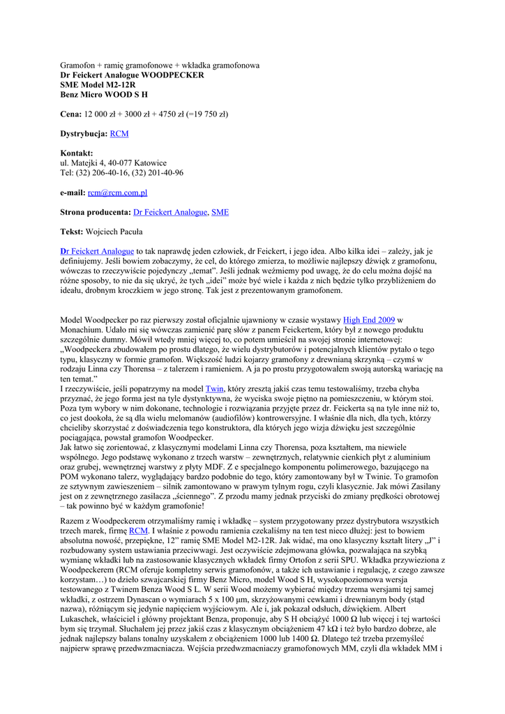 Gramofon + ramię gramofonowe + wkładka gramofonowa Dr Feickert Analogue WOODPECKER SME Model M2-12R Benz Micro WOOD S H Cena: 12 000 zł + 3000 zł + 4750 zł (=19 750 zł) Dystrybucja: RCM Kontakt: ul. Matejki 4, 40-077 Katowice Tel: (32) 206-40-16, (32) 201-40-96 e-mail: [email protected] Strona producenta: Dr Feickert Analogue, SME Tekst: Wojciech Pacuła Dr Feickert Analogue to tak naprawdę jeden człowiek, dr Feickert, i jego idea. Albo kilka idei – zależy, jak je definiujemy. Jeśli bowiem zobaczymy, że cel, do którego zmierza, to możliwie najlepszy dźwięk z gramofonu, wówczas to rzeczywiście pojedynczy „temat”. Jeśli jednak weźmiemy pod uwagę, że do celu można dojść na różne sposoby, to nie da się ukryć, że tych „idei” może być wiele i każda z nich będzie tylko przybliżeniem do ideału, drobnym kroczkiem w jego stronę. Tak jest z prezentowanym gramofonem. Model Woodpecker po raz pierwszy został oficjalnie ujawniony w czasie wystawy High End 2009 w Monachium. Udało mi się wówczas zamienić parę słów z panem Feickertem, który był z nowego produktu szczególnie dumny. Mówił wtedy mniej więcej to, co potem umieścił na swojej stronie internetowej: „Woodpeckera zbudowałem po prostu dlatego, że wielu dystrybutorów i potencjalnych klientów pytało o tego typu, klasyczny w formie gramofon. Większość ludzi kojarzy gramofony z drewnianą skrzynką – czymś w rodzaju Linna czy Thorensa – z talerzem i ramieniem. A ja po prostu przygotowałem swoją autorską wariację na ten temat.” I rzeczywiście, jeśli popatrzymy na model Twin, który zresztą jakiś czas temu testowaliśmy, trzeba chyba przyznać, że jego forma jest na tyle dystynktywna, że wyciska swoje piętno na pomieszczeniu, w którym stoi. Poza tym wybory w nim dokonane, technologie i rozwiązania przyjęte przez dr. Feickerta są na tyle inne niż to, co jest dookoła, że są dla wielu melomanów (audiofilów) kontrowersyjne. I właśnie dla nich, dla tych, którzy chcieliby skorzystać z doświadczenia tego konstruktora, dla których jego wizja dźwięku jest szczególnie pociągająca, powstał gramofon Woodpecker. Jak łatwo się zorientować, z klasycznymi modelami Linna czy Thorensa, poza kształtem, ma niewiele wspólnego. Jego podstawę wykonano z trzech warstw – zewnętrznych, relatywnie cienkich płyt z aluminium oraz grubej, wewnętrznej warstwy z płyty MDF. Z e specjalnego komponentu polimerowego, bazującego na POM wykonano talerz, wyglądający bardzo podobnie do tego, który zamontowany był w Twinie. To gramofon ze sztywnym zawieszeniem – silnik zamontowano w prawym tylnym rogu, czyli klasycznie. Jak mówi Zasilany jest on z zewnętrznego zasilacza „ściennego”. Z przodu mamy jednak przyciski do zmiany prędkości obrotowej – tak powinno być w każdym gramofonie! Razem z Woodpeckerem otrzymaliśmy ramię i wkładkę – system przygotowany przez dystrybutora wszystkich trzech marek, firmę RCM. I właśnie z powodu ramienia czekaliśmy na ten test nieco dłużej: jest to bowiem absolutna nowość, przepiękne, 12” ramię SME Model M2-12R. Jak widać, ma ono klasyczny kształt litery „J” i rozbudowany system ustawiania przeciwwagi. Jest oczywiście zdejmowana główka, pozwalająca na szybką wymianę wkładki lub na zastosowanie klasycznych wkładek firmy Ortofon z serii SPU. Wkładka przywieziona z Woodpeckerem (RCM oferuje kompletny serwis gramofonów, a także ich ustawianie i regulację, z czego zawsze korzystam…) to dzieło szwajcarskiej firmy Benz Micro, model Wood S H, wysokopoziomowa wersja testowanego z Twinem Benza Wood S L. W serii Wood możemy wybierać między trzema wersjami tej samej wkładki, z ostrzem Dynascan o wymiarach 5 x 100 μm, skrzyżowanymi cewkami i drewnianym body (stąd nazwa), różniącym się jedynie napięciem wyjściowym. Ale i, jak pokazał odsłuch, dźwiękiem. Albert Lukaschek, właściciel i główny projektant Benza, proponuje, aby S H obciążyć 1000 Ω lub więcej i tej wartości bym się trzymał. Słuchałem jej przez jakiś czas z klasycznym obciążeniem 47 kΩ i też było bardzo dobrze, ale jednak najlepszy balans tonalny uzyskałem z obciążeniem 1000 lub 1400 Ω. Dlatego też trzeba przemyśleć najpierw sprawę przedwzmacniacza. Wejścia przedwzmacniaczy gramofonowych MM, czyli dla wkładek MM i MC wysokopoziomowych (jak S H), mają niemal zawsze stałe obciążenie 47 kΩ. I z nimi Benz Micro nie pokaże wszystkiego, co potrafi. Różnice między 1000 Ω i 47 kΩ nie są może powalające, ale dla mnie to pierwsze jest jednak lepsze. Mój preamp RCM Audio Sensor Prelude IC na szczęście pozwala zmieniać obciążenie. Żeby wiedzieć, co i jak, przesłuchałem gramofon także z wkładką Denona DL-103SA oraz Air Tight PC-1. Punktem odniesienia były dla mnie – Transrotor Argos, Bergmann Audio Sindre oraz Goldenote Bellavista Signature. ODSŁUCH Płyty użyte do odsłuchu: • • • • • • • • • • • • • • Count Basie&Tony Bennett, Basie/Benett, Roulette/Classic Records, SR 25072, 4 x 45 rpm, special one-sided pressing, 180 g LP. e.s.t., Retrospective, ACT Music+Vision, ACT 9021-1, 2 x 180 g LP. Eva Cassidy, Songbird, Blix Street/S&P Records, S&P-501, 180 g LP. Falla, The Three Cornered Hat, Ernest Anserment, Decca/Esoteric, ESLP-10003, 200 g LP. Frank Sinatra, Sinatra&Sextet: Live in Paris, Warner Music/Mobile Fidelity, MFSL 1-312, No. 238, 2 x 180 g LP. Frank Sinatra, Sinatra&Strings, Warner Music/Mobile Fidelity, MFSL 1-313, No. 199, 180 g LP. Frank Sinatra, The Voice, Columbia/Classic Records, CL- 743, 180 g LP. Jeniffer Warnes, The Well, Davisch&Warnes./Cisco, CLP-7009, 180 g LP. Kraftwerk, Tour The France, EMI, 591 708 1, 2 x 180 g LP. Nat “King” Cole, Just One Of Those Things, Capitol/S&P Records, S&P-508, 180 g LP. Stan Getz&João Gilberto, Getz/Gilberto, Verve/Speakers Corner, 009 8545, 180 g LP. Tori Amos, Abnormally Attracted To Sin, Un