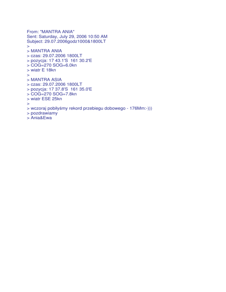 From: "MANTRA ANIA" Sent: Saturday, July 29, 2006 10:50 AM Subject: 29.07.2006godz1000&1800LT > > MANTRA ANIA > czas: 29.07.2006 1800LT > pozycja: 17 43.1'S 161 30.2'E > COG=270 SOG=6.0kn > wiatr E 18kn > > MANTRA ASIA > czas: 29.07.2006 1800LT > pozycja: 17 37.8'S 161 35.0'E > COG=270 SOG=7.8kn > wiatr ESE 25kn > > wczoraj pobiły my rekord przebiegu dobowego - 176Mm:-))) > pozdrawiamy > Ania&Ewa From: "mantra ASIA" Sent: Saturday, July 29, 2006 1:23 PM Subject: 29.07. mantra Asia 1800LT 17 37,8S 161 35,0E COG 270 SOG 6,5 ESE 20 mantra Ania 17 43,1S 161 30,2E COG 270 SOG 6,0 E 18 Tenk yu tumas (to w j zyku bislama - prawda e ładne?) za update prognozy. Uprasza si o dalsze updaty - najlepiej codziennie. Z pozdrowieniami, Marta Asia From: "mantra ASIA" Sent: Sunday, July 30, 2006 6:00 AM Subject: nie wraca wcale nie łatwo Witajcie z Morza Koralowego! Opu ciły my ju Wyspy Szcz liwe (ich mieszka cy uwa aj si za najszcz liwszych ludzi na wiecie) i jeste my na ostatniej prostej przed Australia. Poznałam paru eglarzy, którzy od kilku, kilkunastu lat pływaj w kółko. Straceni dla społecze stwa, ale te społecze stwo do niczego im nie jest potrzebne. yj w swojej, eglarskiej społeczno ci, z dala od wielkomiejskiego zgiełku, po piechu i polityki. Taki sposób na ycie. Jak Odys nie wracaj , bo navigare necesse est, a nie to l dowe vivere. Wi kszo zreszt nie ma do czego wraca , bo "domem jest okr t". Zatrzymuj si gdzie po drodze, postoj , popracuj , eby zarobi na nast pny kawałek rejsu. Niektórzy pływaj z onami, rodzinami, inni samotnie (jeszcze lub ju ). Całkiem łatwo byłoby nie wraca i straci si dla społecze stwa. Wystarczyłoby tylko przesta uprawia eglarstwo i zacz uprawia eglarza ;-). Nauczy si robi weki w szybkowarze i piec pizze na patelni, jak Portugalka Ana. Zostawi w choler to wszystko (nienajgorsze przecie ), co zostało i czeka na l dzie. Tylko czy chc ? W zasadzie eglarsko jestem ju usatysfakcjonowana. Turystycznie mniej, bo ten rejs jest za szybki, cho jak wszyscy mówi , lepiej w dwa lata ni wcale. Jeszcze tylko Australia, pochodzi z Browarem po górach i marzenia (te najwa niejsze) spełnione. Mogłabym wraca . Czy chce? "Tam w dali słoik konfitur" - mieszkanie, przyjaciele, rodzina, szklana budka - ci gle jeszcze jest do czego wraca . Sło ce wieci, pasat popycha nas do przodu. Pozdrowienia, Asia From: "mantra ASIA" Sent: Monday, July 31, 2006 12:58 AM Subject: Australia Hej Andrzeju, w ramach przylotu Darii pomy lałam, e mo e przekazałby jej pełzacze do grota (oderwał mi si jeden z dołu a ju nie mam zapasowych) oraz mo e pokrowiec na grota (jest ju naprawd w strz pach:-(. Przydałyby si te ko cówki do w y i korba do windy (przy schodzeniu z kotwicy w Port Vila przy kwarantannie zupełnie si wyrobiła). Napisz mo e te co my lisz o wyci ganiu lodek w Cairns?. Czy przyjedziesz razem z Dari ? Pozdrawiam Marta From: "mantra ASIA" Sent: Monday, July 31, 2006 8:28 AM Subject: szybkie Mantry;-) Kochany Andrzeju, Po pierwsze - bardzo dzi kuje za yczenia i pami :-). Nie wyobra am sobie tymczasem wi kszej rado ci ni eglowanie wła nie, szczególnie teraz, w tych cudownych warunkach kiedy dosłownie fruniemy przez ocean. W takich chwilach chce si , eby port przeznaczenia był odległy o wiele tysi cy mil......Widzisz, tak odległa czuj si teraz od wiata, który za mn został....i wcale nie chce wraca ;-). My lałam o tym, eby zosta na ten czas w Australii lub polecie do Miami, co Ty na to? W ka dym razie czuje si teraz jakby wyrosły nam skrzydła, tak mamy wspaniał i szybk eglug . A wła nie, a propos szybkiej eglugi, serdecznie gratuluje sukcesów Twoich Mantr. Wygl da na to, e spod Twojej r ki wychodz najszybsze jachty;-). Pozdrawiam serdecznie Marta From: "mantra ASIA" Sent: Tuesday, August 01, 2006 8:53 AM Subject: super Dla mnie bomba. Jeste wielki. I tyle. Thx. Z Cairns chciałabym, za pozwoleniem, wyskoczy na par dni do Brisbane - b dzie troch czasu przed przyjazdem Darii, bo w Darwin b dzie robota. Pozdrowienia, Asia From: "mantra ASIA" Sent: Wednesday, August 02, 2006 3:39 AM Subject: 02.08 Hej Andrzeju, oto pozycje z 1000LT mantra Asia 17 07,8S 152 37,5E COG 283 SOG 6.5 SE 17 silnik 00:55/00:55 mantra Ania 17 04,6E 152 23,6E COG 290 SOG 5.3 silnik 03:40/03:40 hmm, coraz bardziej mi si ta rywalizacja podoba:-)......jedzie si po prostu cudownie:-)))))) Słuchaj, ju par razy pytano nas czy mamy mo e polska bander ....wiesz w klubach eglarskich wywieszaj bandery odwiedzaj cych jachtów. Bardzo chcieli nasz z uwagi, e to taki egzotyczny;-) kraj i w dodatku "egzotyczne" załogi. Mo e podesłałby przez Dari par banderek? pozdrawiam i dzi ki za pogod :-) Marta From: "mantra ASIA" Sent: Saturday, August 05, 2006 3:35 AM Subject: meta start 27.07.2006 0915 przej cie linii mety 05.08.2006 0134 liczba godzin na silniku 00h55min u ciski:-) Marta Asia p.s. jeste my po odprawie, która kosztowała 580 dolarów australijskich za obie łódki, płatno karta. Stoimy na kotwicowisku naprzeciw Marlin Mariny i tak ju chyba zostaniemy. Nie ma sensu sta w marinie (27 dol. za noc/łódka). To na razie tyle, pozdrawiamy M&A From: "MANTRA ANIA" Sent: Saturday, August 05, 2006 9:21 AM Subject: meta Witaj Andrzeju! wczoraj, 04.08 o godz 2305 przeszły my lini mety przepłyn ły my 1319Mm jeste my po odprawie (Aska zapłaciła karta, gotówki nie przejmuj ) stoimy na kotwicy w Marlin Marina (postój w marinie kosztuje 27 dol. austr. za dob ) potrzebujemy rodzaj antyfoulingu- producenta i dat malowania wszystko u nas w porz dku pozdrawiam Ania From: "mantra ASIA" Sent: Saturday, August 05, 2006 10:12 AM Subject: Re: meta Hej Andrzeju, Australia ju mi si podoba:-).....i to bardzo:-). Wiem, e nie powinno si nowych miejsc porównywa ze sob , ale na razie sprawia na mnie wra enie skrzy owania Europy ze Stanami.....no i pachnie inaczej ni wszystko do tej pory, co raczej trudno wyrazi słowami;-). Postaram si nagra Ci zdj cia na płyt i wysła do Polski razem z Ewa. ciskam Marta p.s. kwaranta