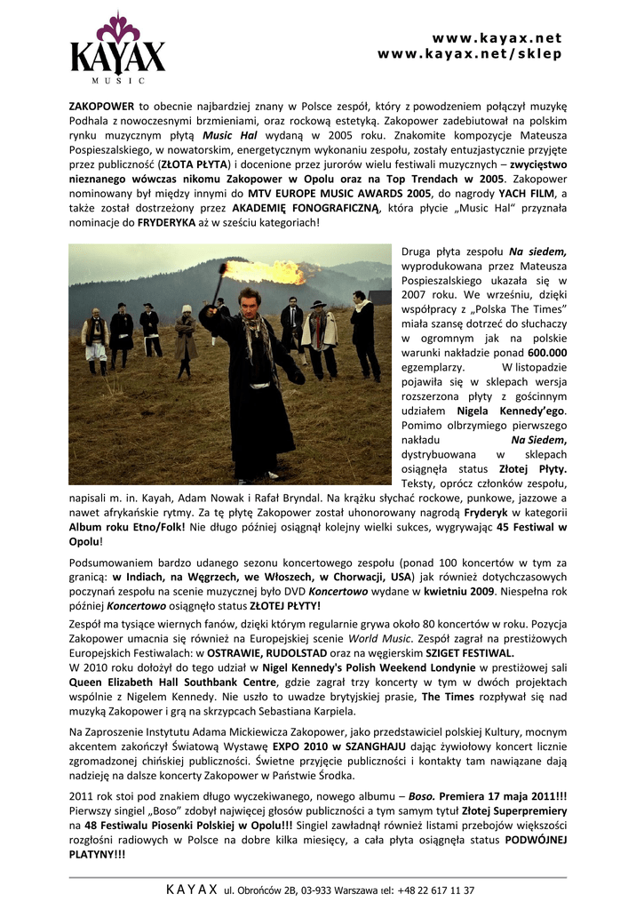 www.kayax.net www.kayax.net/sklep ZAKOPOWER to obecnie najbardziej znany w Polsce zespół, który z powodzeniem połączył muzykę Podhala z nowoczesnymi brzmieniami, oraz rockową estetyką. Zakopower zadebiutował na polskim rynku muzycznym płytą Music Hal wydaną w 2005 roku. Znakomite kompozycje Mateusza Pospieszalskiego, w nowatorskim, energetycznym wykonaniu zespołu, zostały entuzjastycznie przyjęte przez publiczność (ZŁOTA PŁYTA) i docenione przez jurorów wielu festiwali muzycznych – zwycięstwo nieznanego wówczas nikomu Zakopower w Opolu oraz na Top Trendach w 2005. Zakopower nominowany był między innymi do MTV EUROPE MUSIC AWARDS 2005, do nagrody YACH FILM, a także został dostrzeżony przez AKADEMIĘ FONOGRAFICZNĄ, która płycie „Music Hal“ przyznała nominacje do FRYDERYKA aż w sześciu kategoriach! Druga płyta zespołu Na siedem, wyprodukowana przez Mateusza Pospieszalskiego ukazała się w 2007 roku. We wrześniu, dzięki współpracy z „Polska The Times” miała szansę dotrzeć do słuchaczy w ogromnym jak na polskie warunki nakładzie ponad 600.000 egzemplarzy. W listopadzie pojawiła się w sklepach wersja rozszerzona płyty z gościnnym udziałem Nigela Kennedy’ego. Pomimo olbrzymiego pierwszego nakładu Na Siedem, dystrybuowana w sklepach osiągnęła status Złotej Płyty. Teksty, oprócz członków zespołu, napisali m. in. Kayah, Adam Nowak i Rafał Bryndal. Na krążku słychać rockowe, punkowe, jazzowe a nawet afrykańskie rytmy. Za tę płytę Zakopower został uhonorowany nagrodą Fryderyk w kategorii Album roku Etno/Folk! Nie długo później osiągnął kolejny wielki sukces, wygrywając 45 Festiwal w Opolu! Podsumowaniem bardzo udanego sezonu koncertowego zespołu (ponad 100 koncertów w tym za granicą: w Indiach, na Węgrzech, we Włoszech, w Chorwacji, USA) jak również dotychczasowych poczynań zespołu na scenie muzycznej było DVD Koncertowo wydane w kwietniu 2009. Niespełna rok później Koncertowo osiągnęło status ZŁOTEJ PŁYTY! Zespół ma tysiące wiernych fanów, dzięki którym regularnie grywa około 80 koncertów w roku. Pozycja Zakopower umacnia się również na Europejskiej scenie World Music. Zespół zagrał na prestiżowych Europejskich Festiwalach: w OSTRAWIE, RUDOLSTAD oraz na węgierskim SZIGET FESTIWAL. W 2010 roku dołożył do tego udział w Nigel Kennedy's Polish Weekend Londynie w prestiżowej sali Queen Elizabeth Hall Southbank Centre, gdzie zagrał trzy koncerty w tym w dwóch projektach wspólnie z Nigelem Kennedy. Nie uszło to uwadze brytyjskiej prasie, The Times rozpływał się nad muzyką Zakopower i grą na skrzypcach Sebastiana Karpiela. Na Zaproszenie Instytutu Adama Mickiewicza Zakopower, jako przedstawiciel polskiej Kultury, mocnym akcentem zakończył Światową Wystawę EXPO 2010 w SZANGHAJU dając żywiołowy koncert licznie zgromadzonej chińskiej publiczności. Świetne przyjęcie publiczności i kontakty tam nawiązane dają nadzieję na dalsze koncerty Zakopower w Państwie Środka. 2011 rok stoi pod znakiem długo wyczekiwanego, nowego albumu – Boso. Premiera 17 maja 2011!!! Pierwszy singiel „Boso” zdobył najwięcej głosów publiczności a tym samym tytuł Złotej Superpremiery na 48 Festiwalu Piosenki Polskiej w Opolu!!! Singiel zawładnął również listami przebojów większości rozgłośni radiowych w Polsce na dobre kilka miesięcy, a cała płyta osiągnęła status PODWÓJNEJ PLATYNY!!! KAYAX ul. Obrońców 2B, 03-933 Warszawa tel: +48 22 617 11 37 www.kayax.net www.kayax.net/sklep Skład zespołu: Sebastian Karpiel Bułecka Bartek Kudasik Wojciech Topa – Józef Chyc Piotr „Falko” Rychlec Łukasz Moskal Tomek „Serek” Krawczyk Michał Trąbski Dominik Trębski głos, skrzypce, dudy podhalańskie, fujara słowacka, głos, altówka; głos, skrzypce; głos, basy podhalańskie; instrumenty klawiszowe; głos, perkusja; gitara elektryczna; gitara basowa trąbka Nagrody: 2005 – Superpremiera - Opole Festiwal 2005 – Sopot TopTrendy Festiwal 2008 – Superpremiera - Opole Festiwal 2008 – Fryderyk, Album roku Etno/Folk 2011 – Superpremiera - Opole Festiwal Dyskografia: Music Hal (cd), 2005; Na siedem (cd), 2008; Koncertowo (dvd), 2009; Boso (cd), 2011 Złota Płyta Złota Płyta Złota Płyta Podwójna Platynowa Płyta Więcej na stronie zespołu www.zakopower.pl lub facebook.com/zakopower kontakt: Rafał Podlewski: [email protected]; +48 606 431 255 KAYAX ul. Obrońców 2B, 03-933 Warszawa tel: +48 22 617 11 37