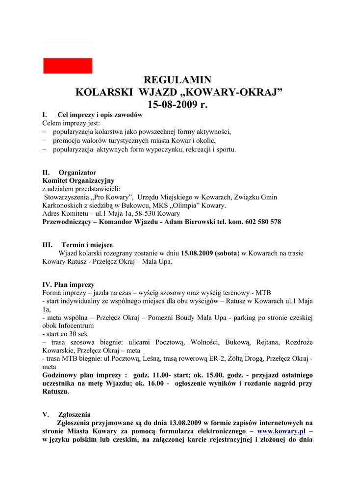REGULAMIN KOLARSKI WJAZD „KOWARY-OKRAJ” 15-08-2009 r. I. Cel imprezy i opis zawodów Celem imprezy jest: − popularyzacja kolarstwa jako powszechnej formy aktywności, − promocja walorów turystycznych miasta Kowar i okolic, − popularyzacja aktywnych form wypoczynku, rekreacji i sportu. II. Organizator Komitet Organizacyjny z udziałem przedstawicieli: Stowarzyszenia „Pro Kowary”, Urzędu Miejskiego w Kowarach, Związku Gmin Karkonoskich z siedzibą w Bukowcu, MKS „Olimpia” Kowary. Adres Komitetu – ul.1 Maja 1a, 58-530 Kowary Przewodniczący – Komandor Wjazdu - Adam Bierowski tel. kom. 602 580 578 III. Termin i miejsce Wjazd kolarski rozegrany zostanie w dniu 15.08.2009 (sobota) w Kowarach na trasie Kowary Ratusz - Przełęcz Okraj – Mala Upa. IV. Plan imprezy Forma imprezy – jazda na czas – wyścig szosowy oraz wyścig terenowy - MTB - start indywidualny ze wspólnego miejsca dla obu wyścigów – Ratusz w Kowarach ul.1 Maja 1a, - meta wspólna – Przełęcz Okraj – Pomezni Boudy Mala Upa - parking po stronie czeskiej obok Infocentrum - start co 30 sek – trasa szosowa biegnie: ulicami Pocztową, Wolności, Bukową, Rejtana, Rozdroże Kowarskie, Przełęcz Okraj – meta - trasa MTB biegnie: ul Pocztową, Leśną, trasą rowerową ER-2, Żółtą Drogą, Przełęcz Okraj meta Godzinowy plan imprezy : godz. 11.00- start; ok. 15.00. godz. - przyjazd ostatniego uczestnika na metę Wjazdu; ok. 16.00 - ogłoszenie wyników i rozdanie nagród przy Ratuszu. V. Zgłoszenia Zgłoszenia przyjmowane są do dnia 13.08.2009 w formie zapisów internetowych na stronie Miasta Kowary za pomocą formularza elektronicznego – www.kowary.pl – w języku polskim lub czeskim, na załączonej karcie rejestracyjnej i złożonej do dnia 13.08.2009 roku w Informacji Turystycznej w Kowarach ul. 1 Maja 1a wraz z dołączoną kopią dowodu wpłaty. Istnieje możliwość zapisu w dniu wjazdu w godz. od 8.00 do 9.30 w Biurze Zawodów w Informacji Turystycznej Urzędu Miejskiego. Wpisowe należy wpłacać na konto MKS Olimpia Kowary w Banku PKO BP SA O/Jelenia Góra (nr konta 60 1020 2124 0000 8102 0066 7824) z dopiskiem „Wjazd na Okraj”. Wpisowe dla zawodników wjazdu szosowego zgodnie z przepisami PZKol wynosi młodzik -13-14 lat; 1996 – 1995 rok urodzenia 5,-zł junior młodszy -15-16 lat; 1994 – 1993 rok urodzenia 8,-zł junior -17-18 lat; 1992 – 1991 rok urodzenia 10,-zł młodzieżowiec - poniżej 23 lat - 19-22 lat; 1990 – 1987 rok urodzenia 12,-zł elita - 23 lata i starsi; 1986 rok urodzenia i starsi 16,-zł elita – kobiety -19 lat i starsze; 1990 rok urodzenia i starsze 10,-zł masters 30 lat i starsi 1979 rok urodzenia i starsi, 30,-zł Wpisowe dla zawodników w wjazdu MTB do 18 lat powyżej 18 lat 15,-zł 30,-zł Opłata startowa nie zawiera kaucji zwrotnej w wysokości 10 zł za chip pomiarowy, którą każdy uczestnik musi opłacić w dniu zawodów w biurze wyścigu. VI. Warunki uczestnictwa Wjazd Kolarski „Kowary-Okraj” jest imprezą ogólnodostępną. Uczestnikiem może być osoba, która spełni następujące warunki: a) dokona rejestracji w sposób określony w pkt IV, b) dokona opłaty startowej i dowód wpłaty okaże w Biurze Zawodów przy odbiorze numeru startowego, c) złoży czytelny podpis na Karcie Zgłoszeniowej przed startem w wyścigu pod odpowiednią klauzulą. VII. Kategorie Wyścig Szosowy Ogólna, Kowarzanie, Zawodnicy zagraniczni a w tym: − Mężczyźni 8 kategorii wiekowych (dokładny opis na stronie internetowej) kat I 13-14 lat rocznik 1996-95 kat II 15-16 lat rocznik 1994-93 kat III 17-18 lat rocznik 1992-91 kat IV 19-29 lat rocznik 1990-80 kat V 30-39 lat rocznik 1979-70 kat VI 40-49 lat rocznik 1969-60 kat VII 50-59 lat rocznik 1959-50 kat VIII 60 i starsi rocznik 1949 i starsi - Kobiety Bez podziału na kategorie – minimum ukończone 13 lat. Wyścig MTB Kategorie jak w Wyścigu Szosowym VIII. Nagrody i świadczenia organizatora 1. Nagrody. W każdej kategorii przyznane będą medale oraz nagrody za miejsca I do III, przy co najmniej 10 startujących, poniżej 10 zawodników w danej kategorii nagroda przysługuje wyłącznie za I miejsce. Dyplomy uzyskają zawodnicy za miejsca od I do III. Nagrody dodatkowe: 1. Najmłodszy uczestnik 2. Najstarszy uczestnik 3. Najliczniejsza rodzina 4. Najszybszy zawodnik kategorii „szosówka” 5. Najszybszy zawodnik kategorii MTB 6. Najszybsza kobieta Sponsorzy imprezy fundują nagrody rzeczowe dla najlepszych zawodników oraz do wylosowania wśród wszystkich, którzy ukończą zawody. 2. Świadczenia dla zawodników. W ramach wpisowego zawodnik otrzymuje: • numer startowy, • prawo do korzystania z bufetu, • ubezpieczenie OC, • upominki sponsorów, • zabezpieczenie medyczne, • pamiątkowe zdjęcie z trasy do pobrania ze strony internetowej. Organizator zapewnia regeneracyjny posiłek i napoje(bidon) na starcie. IX. Zabezpieczenie Trasy: Obie trasy zostaną odpowiednio oznakowane i zabezpieczone przy użyciu taśmy i płotków odgradzających. Na trasach będą znajdować się oznakowani porządkowi, odpowiedzialni za przestrzeganie bezpieczeństwa i regulaminu zawodów. O imprezie zostaną powiadomione odpowiednie organy, które dodatkowo zabezpieczą przebieg zawodów. Zostanie zapewniona obsługa medyczna. ADRES SZPITALA: Kowary ul. Sanatoryjna 15 tel. 075-6415700 X. Postanowienia końcowe Komisję sędziowską wyznacza DZKol Sędzia główny – Wiesław Kucab. Trasa wyścigu szosowego odbędzie przy częściowo ograniczonym ruchu drogowym. Wjazd szosowy jest zaliczany do challange dolnośląskiego. KOMITET ORGANIZACYJNY PROPOZIC "CYKLISTICKÝ VÝJEZD KOWARY – OKRAJ”. 15-08-2009 r. I. Cíl akce a popis závodů - popularizace cyklistiky jako formy aktivity dostupné všem, - propagace turistických možností města Kowary a polsko-českého pohraničí - popularizace aktivní formy odpočinku, rekreace a sportu. II. Pořadatel Organizační výbor s účastí zástup