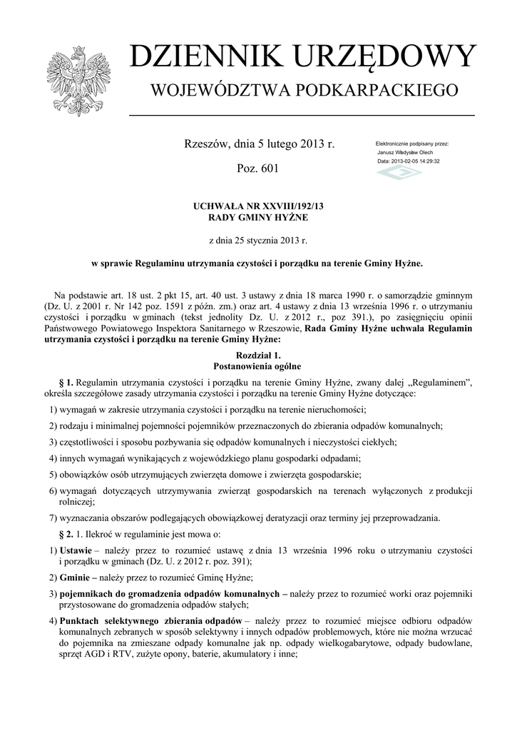 DZIENNIK URZĘDOWY WOJEWÓDZTWA PODKARPACKIEGO Rzeszów, dnia 5 lutego 2013 r. Elektronicznie podpisany przez: Janusz Władysław Olech Poz. 601 Data: 2013-02-05 14:29:32 UCHWAŁA NR XXVIII/192/13 RADY GMINY HYŻNE z dnia 25 stycznia 2013 r. w sprawie Regulaminu utrzymania czystości i porządku na terenie Gminy Hyżne. Na podstawie art. 18 ust. 2 pkt 15, art. 40 ust. 3 ustawy z dnia 18 marca 1990 r. o samorządzie gminnym (Dz. U. z 2001 r. Nr 142 poz. 1591 z późn. zm.) oraz art. 4 ustawy z dnia 13 września 1996 r. o utrzymaniu czystości i porządku w gminach (tekst jednolity Dz. U. z 2012 r., poz 391.), po zasięgnięciu opinii Państwowego Powiatowego Inspektora Sanitarnego w Rzeszowie, Rada Gminy Hyżne uchwala Regulamin utrzymania czystości i porządku na terenie Gminy Hyżne: Rozdział 1. Postanowienia ogólne § 1. Regulamin utrzymania czystości i porządku na terenie Gminy Hyżne, zwany dalej „Regulaminem”, określa szczegółowe zasady utrzymania czystości i porządku na terenie Gminy Hyżne dotyczące: 1) wymagań w zakresie utrzymania czystości i porządku na terenie nieruchomości; 2) rodzaju i minimalnej pojemności pojemników przeznaczonych do zbierania odpadów komunalnych; 3) częstotliwości i sposobu pozbywania się odpadów komunalnych i nieczystości ciekłych; 4) innych wymagań wynikających z wojewódzkiego planu gospodarki odpadami; 5) obowiązków osób utrzymujących zwierzęta domowe i zwierzęta gospodarskie; 6) wymagań dotyczących utrzymywania zwierząt gospodarskich na terenach wyłączonych z produkcji rolniczej; 7) wyznaczania obszarów podlegających obowiązkowej deratyzacji oraz terminy jej przeprowadzania. § 2. 1. Ilekroć w regulaminie jest mowa o: 1) Ustawie – należy przez to rozumieć ustawę z dnia 13 września 1996 roku o utrzymaniu czystości i porządku w gminach (Dz. U. z 2012 r. poz. 391); 2) Gminie – należy przez to rozumieć Gminę Hyżne; 3) pojemnikach do gromadzenia odpadów komunalnych – należy przez to rozumieć worki oraz pojemniki przystosowane do gromadzenia odpadów stałych; 4) Punktach selektywnego zbierania odpadów – należy przez to rozumieć miejsce odbioru odpadów komunalnych zebranych w sposób selektywny i innych odpadów problemowych, które nie można wrzucać do pojemnika na zmieszane odpady komunalne jak np. odpady wielkogabarytowe, odpady budowlane, sprzęt AGD i RTV, zużyte opony, baterie, akumulatory i inne; Dziennik Urzędowy Województwa Podkarpackiego –2– Poz. 601 5) Harmonogramie – należy przez to rozumieć harmonogram odbioru odpadów komunalnych na terenie Gminy Hyżne dostarczany właścicielom nieruchomości przez gminę; 6) Mieszkańcu – należy przez to rozumieć osobę fizyczną mającą na terenie gminy miejsce zamieszkania w rozumieniu przyjętym w art. 2d rozporządzenia WE nr 763/2008. Rozdział 2. Wymagania w zakresie utrzymania czystości i porządku na terenie nieruchomości § 3. Właściciele nieruchomości są zobowiązani do utrzymania czystości i porządku oraz należytego stanu sanitarno-higienicznego i estetycznego nieruchomości poprzez: 1) Wyposażenie nieruchomości w pojemniki do gromadzenia odpadów komunalnych, dostosowane do urządzeń załadowczych pojazdów, oraz utrzymywanie tych urządzeń w odpowiednim stanie sanitarnym, porządkowym i technicznym, aby korzystanie z nich odbywało się bez przeszkód i powodowania zagrożeń dla zdrowia użytkowników, 2) Prowadzenie selektywnej zbiórki stałych odpadów komunalnych powstałych na terenie nieruchomości, 3) Przyłączenie nieruchomości do istniejącej sieci kanalizacyjnej lub w przypadku gdy budowa sieci jest technicznie lub ekonomicznie nieuzasadniona, wyposażenie nieruchomości w zbiornik bezodpływowy do gromadzenia nieczystości ciekłych lub przydomową oczyszczalnię ścieków bytowych, spełniające wymagania określone w przepisach Prawa budowlanego, 4) Usuwanie nieczystości ciekłych z nieruchomości z częstotliwością i w sposób gwarantujący, że nie nastąpi przepełnienie zbiornika bezodpływowego, 5) Uprzątanie błota, śniegu, lodu i innych zanieczyszczeń z części nieruchomości służących do użytku publicznego powinno być wykonywane przez podmioty do tego zobowiązane na podstawie ustawy, niezwłocznie po ich zaśnieżeniu, oblodzeniu lub zanieczyszczeniu, 6) Mycie pojazdów samochodowych poza myjniami wyłącznie w miejscach dozwolonych, a więc: a) na terenie nieruchomości niesłużącej do użytku publicznego tylko pod warunkiem, że powstające ścieki odprowadzane są do kanalizacji sanitarnej lub gromadzone w szczelnych zbiornikach bezodpływowych, w szczególności ścieki takie nie mogą być odprowadzane bezpośrednio do zbiorników wodnych lub do ziemi, b) na terenach służących do użytku publicznego tylko w miejscach do tego przygotowanych i specjalnie oznaczonych; 7) Drobne naprawy pojazdów samochodowych a więc: wymiana kół, świec zapłonowych, żarówek, uzupełnianie płynów, regulacje, poza warsztatami samochodowymi, dozwolone są na terenie nieruchomości tylko za zgodą właściciela nieruchomości i tylko wtedy, gdy nie są one uciążliwe dla sąsiednich nieruchomości, a powstające odpady są gromadzone w sposób umożliwiający ich usunięcie zgodnie z przepisami ustawy. § 4. 1. Ustala się następujące zasady w zakresie prowadzenia selektywnego zbierania i odbierania odpadów: 1) Prowadzenie selektywnego zbierania następujących frakcji odpadów komunalnych: a) papieru i tektury (w tym opakowania, gazety, czasopisma itd.), b) tworzywa sztucznego, c) szkła i odpadów opakowaniowych ze szkła (szkło bezbarwne i kolorowe), d) metalu, e) opakowań wielomateriałowych, f) odpady komunalne ulegające biodegradacji, w tym odpady opakowaniowe ulegające biodegradacji - jest obowiązkowe we wszystkich rodzajach zabudowy. 2) Prowadzenie selektywnego zbierania odpadów komunalnych ulegających biodegradacji, w tym odpadów opakowaniowyc