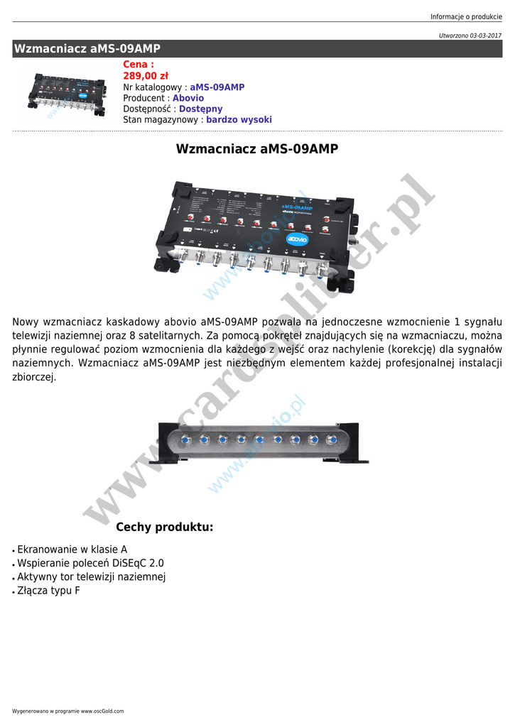 Informacje o produkcie Utworzono 03-03-2017 Wzmacniacz aMS-09AMP Cena : 289,00 zł Nr katalogowy : aMS-09AMP Producent : Abovio Dostępność : Dostępny Stan magazynowy : bardzo wysoki sp lit te r .p l Wzmacniacz aMS-09AMP w w w .c ar d Nowy wzmacniacz kaskadowy abovio aMS-09AMP pozwala na jednoczesne wzmocnienie 1 sygnału telewizji naziemnej oraz 8 satelitarnych. Za pomocą pokręteł znajdujących się na wzmacniaczu, można płynnie regulować poziom wzmocnienia dla każdego z wejść oraz nachylenie (korekcję) dla sygnałów naziemnych. Wzmacniacz aMS-09AMP jest niezbędnym elementem każdej profesjonalnej instalacji zbiorczej. Cechy produktu: ● ● ● ● Ekranowanie w klasie A Wspieranie poleceń DiSEqC 2.0 Aktywny tor telewizji naziemnej Złącza typu F Wygenerowano w programie www.oscGold.com .p l ● ● ● ● ● ● ● ● ● ● ● ar d ● w .c ● Zakres częstotliwości SAT [MHz]: 950 – 2200 Zakres częstotliwości TER [MHz]: 47 – 862 Wzmocnienie SAT [dB]: 12 – 30 Wzmocnienie TER [dB]: 8 – 26 Korekcja SAT [dB]: 6 (stała) Korekcja TER [dB]: 0 – 15 (zmienna) Izolacja SAT-SAT [dB]: 30 Izolacja TER-SAT [dB]: 25 Max. poziom wyjściowy SAT [dBµV]: 108 Max. poziom wyjściowy TER [dBµV]: 110 Impedancja wejścia/wyjścia [Ohm]: 75 Napięcie przełączania [V/kHz]: 13/22 DiSEqC 2.0 Napięcie zasilania [V AC]: 190 – 260 Pobór prądu [mA]: 1000 w w ● sp lit te r Specyfikacja: