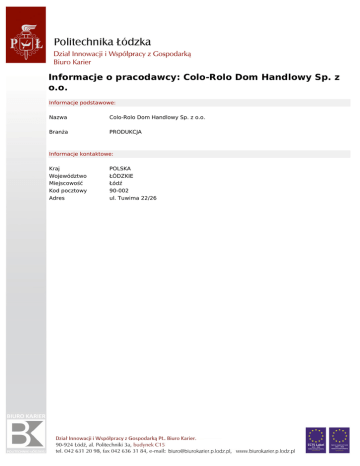 Informacje o pracodawcy: Colo-Rolo Dom Handlowy Sp. z o.o. Informacje podstawowe: Nazwa Colo-Rolo Dom Handlowy Sp. z o.o. Branża PRODUKCJA Informacje kontaktowe: Kraj Województwo Miejscowość Kod pocztowy Adres POLSKA ŁÓDZKIE Łódź 90-002 ul. Tuwima 22/26