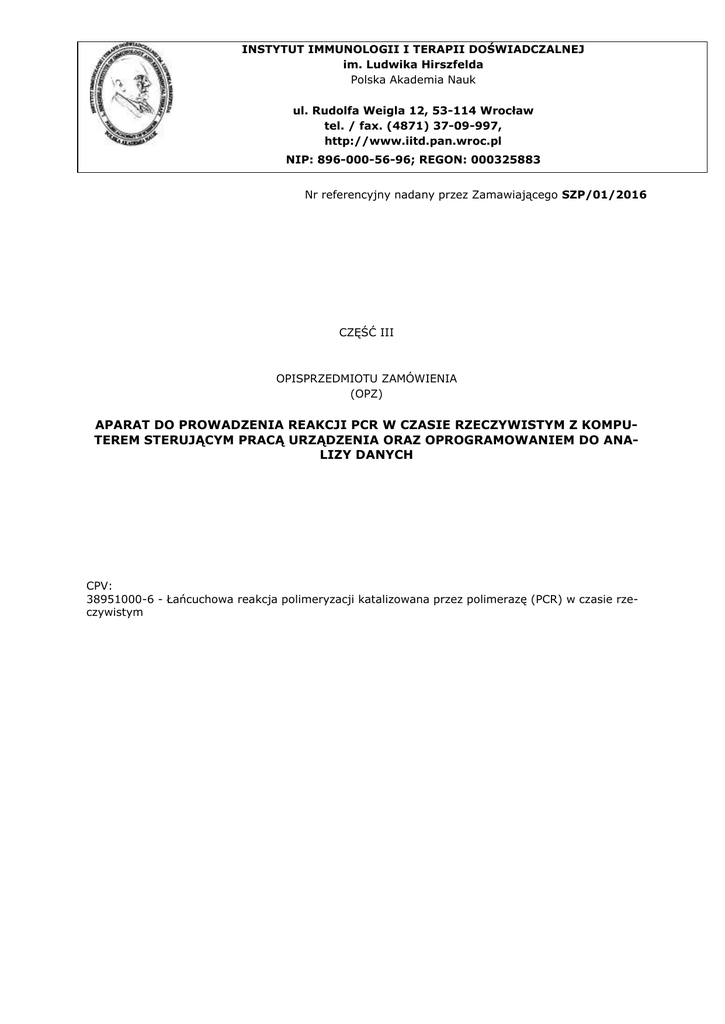 INSTYTUT IMMUNOLOGII I TERAPII DOŚWIADCZALNEJ im. Ludwika Hirszfelda Polska Akademia Nauk ul. Rudolfa Weigla 12, 53-114 Wrocław tel. / fax. (4871) 37-09-997, http://www.iitd.pan.wroc.pl NIP: 896-000-56-96; REGON: 000325883 Nr referencyjny nadany przez Zamawiającego SZP/01/2016 CZĘŚĆ III OPISPRZEDMIOTU ZAMÓWIENIA (OPZ) APARAT DO PROWADZENIA REAKCJI PCR W CZASIE RZECZYWISTYM Z KOMPUTEREM STERUJĄCYM PRACĄ URZĄDZENIA ORAZ OPROGRAMOWANIEM DO ANALIZY DANYCH CPV: 38951000-6 - Łańcuchowa reakcja polimeryzacji katalizowana przez polimerazę (PCR) w czasie rzeczywistym CZEŚĆ III – OPZ Dostawa wraz z montażem, uruchomieniem i bezpłatnym instruktarzem personelu, następującej aparatury naukowo – badawczej, fabrycznie nowej, niepowystawowej i kompletnej: Aparat do prowadzenia reakcji PCR w czasie rzeczywistym z komputerem sterującym pracą urządzenia oraz oprogramowaniem do analizy danych Opis przedmiotu zamówienia: Aparat pozwalający na prowadzenie reakcji PCR w czasie rzeczywistym z wykorzystaniem różnych barwników fluorescencyjnych umożliwiający wykonywanie analiz ilościowych (bezwzględnej i względnej) oraz analizy mutacji (HRM/ Gene Scanning, end-point, weryfikacja genotypu na podstawie krzywej topnienia). W szczególności przedmiot zamówienia dotyczy: Aparatu do PCR w technologii Peltiera z blokiem 96-dołkowym zaopatrzonego w diodę LED (źródło światła), kamerę CCD (odczyt fluorescencji) z możliwością detekcji w minimum 6 kanałach, wyposażonego w komputer do sterowania urządzeniem, oprogramowaniem do zbierania i analizy danych oraz zasilacz awaryjny (UPS) z listwą filtrującą. Zakup będzie wykorzystany do realizacji projektu grantowego NCN 2014/15/B/NZ5/03517 Lp. Nazwa przedmiotu zamówienia 1. 2. 3. 4. 5. 6. 7. 8. 9. 10. 11. 12. 13. Aparat do prowadzenia reakcji PCR w czasie rzeczywistym z komputerem sterującym pracą urządzenia oraz oprogramowaniem do analizy danych Parametry obligatoryjne Nowy (rok produkcji nie starszy niż 2015) i nieużywany aparat do prowadzenia reakcji PCR w czasie rzeczywistym oparty na technologii Peltiera Możliwość jednoczesnej amplifikacji 96 lub 384 próbek (w zależności od dostarczonego bloku) przy użyciu odpowiednio płytek 96- i 384- dołkowych Możliwość samodzielnej wymiany bloków bez konieczności kalibracji aparatu Wymiana bloków nie może wpływać na zmianę parametrów technicznych urządzenia np. ilość dostępnych kanałów detekcji Blok grzejny wykonany w całości ze srebra Minimum 5 kanałów wzbudzenia światła i 6 kanałów detekcji Źródło wzbudzania fluorescencji – pojedyncza dioda LED zainstalowana na stałe. System detekcji wykorzystujący kamerę CCD umożliwiający jednoczesny odczyt wszystkich analizowanych prób Szybkość nagrzewania bloku nie mniejsza niż 4°C/sek – poparte certyfikatem Szybkość chłodzenia bloku nie mniejsza niż 2°C/sek – poparte certyfikatem Homogenność termiczna bloku nie gorsza niż ±0,4°C - poparte certyfikatem Wymagane funkcje aparatu: a) kontrola aparatu b) zbieranie i przechowywanie danych c) analiza ilościowa bezwzględna umożliwiająca pomiar ilości kopii DNA w badanej próbce w oparciu o krzywą standardową) d) analiza ilościowa względna umożliwiająca pomiar poziomu ekspresji genu badanego w stosunku do genu referencyjnego e) analiza High Resolution Melting (HRM) / Gene Scanning (analiza mutacji / SNP) z możliwością automatycznego grupowania prób o podobnym profilu f) analiza genotypowania typu end-point przy pomocy sond hydrolizujących do wykrywania mutacji (analiza dyskryminacji alleli) g) analiza krzywej topnienia h) analiza genotypu na podstawie temperatury topnienia produktu i) analiza porównawcza między płytkami Dla urządzenia nie jest wymagane ani rekomendowane przeprowadzanie okresowych kalibracji systemu optycznego związanych z wykorzystaniem różnych barwników fluorescencyjnych lub stosowanych rodzajów analiz w celu zapewnienia optymalnego działania. APARAT DO PROWADZENIA REAKCJI PCR W CZASIE RZECZYWISTYM Z KOMPUTEREM STERUJĄCYM PRACĄ URZĄDZENIA ORAZ OPROGRAMOWANIEM DO ANALIZY DANYCH 2 CZEŚĆ III – OPZ 14. 15. 16. 17. 18. 19. 20. 21. 22. 23. 24. 25. 26. Urządzenie nie wymaga normalizacji z barwnikiem referencyjnym typu Rox Dostępność w ofercie producenta urządzenia zestawów odczynników dostosowanych i zoptymalizowanych do pracy na aparacie System otwarty dopuszczający użycie odczynników różnych producentów Minimalne wymagania dotyczące komputera sterującego urządzeniem, monitora i baterii (UPS): a) procesor dwurdzeniowy 1,8 GHz b) pamięć RAM 2GB c) dysk twardy 320 GB d) 6 portów USB e) napęd optyczny DVD/RW f) System Windows 7 lub nowszy g) monitor LED 19” h) klawiatura i) mysz j) system zasilania awaryjnego (UPS) zdolny podtrzymać pracę aparatu i komputera w przypadku braku energii elektrycznej (nie gorszy niż 2200VA) Brak konieczności odnawiania licencji na oprogramowanie Instrukcja w pełnej wersji w języku polskim i angielskim Szkolenie personelu w zakresie obsługi sprzętu Zestaw odczynników startowych Dodatkowe oprogramowanie do analizy danych Geneex Enterprise Bezpłatne wsparcie w zakresie metody Real-time PCR na miejscu u zamawiającego zarówno w okresie gwarancyjnym jak i pogwarancyjnym Dodatkowe 12 miesięcy gwarancji Możliwość dostarczenia przynajmniej 10 referencji od użytkowników aparatu z terenu Polski Zasilanie 230V, 50Hz Termin realizacji: - max 6 tygodni od podpisania umowy Oczekiwane warunki gwarancji: Lp. I. 1. 2. 3. 4. II. 1. 2. 3. Warunki obligatoryjne WARUNKI SERWISU GWARANCYJNEGO Gwarancja minimum 24 miesiące Czas reakcji serwisu od zgłoszenia max. 48 godz. Czas naprawy do 14 dni Koszt roboczogodziny (skalkulowany z wszystkimi kosztami towarzyszącymi m.in.: dojazd, hotel, diety itd.) WARUNKI SERWISU POGWARANCYJNEGO Czas reakcji serwisu od zgłoszenia max. 48 godz. Czas naprawy do 14 dni Gwarantowany okres serwisu pogwarancyjnego nie 