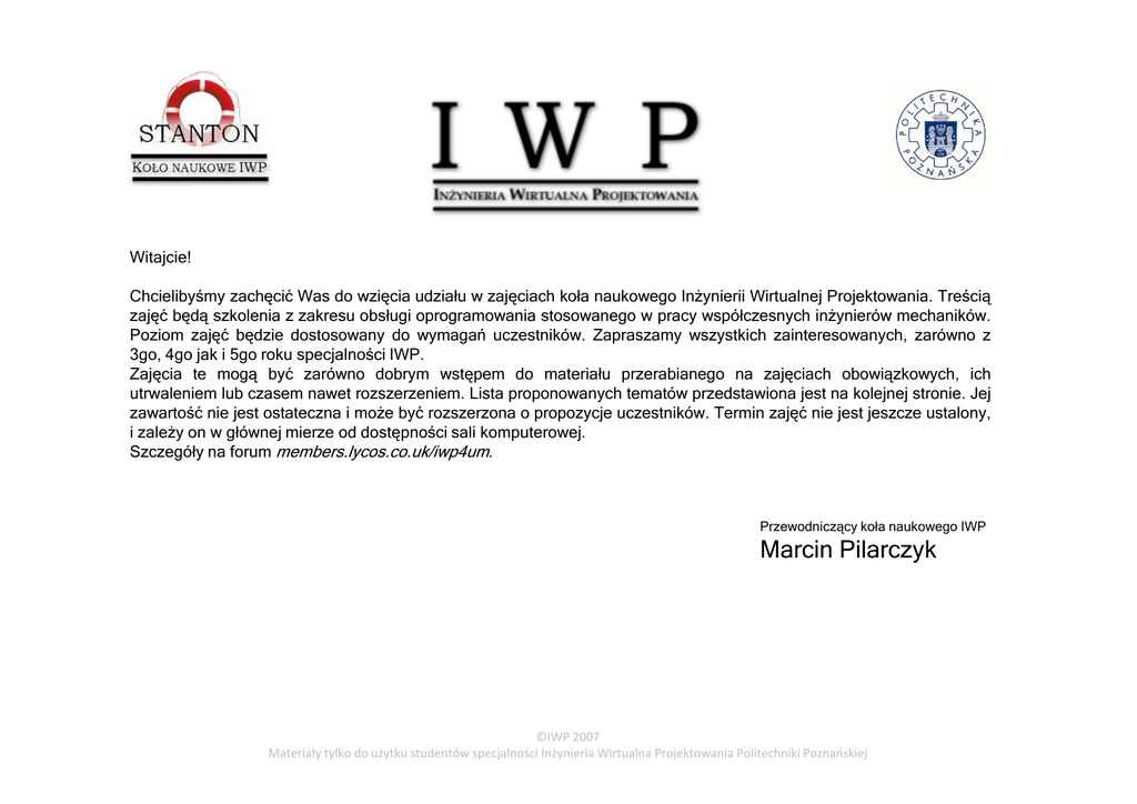 Witajcie! Chcielibyśmy zachęcić Was do wzięcia udziału w zajęciach koła naukowego Inżynierii Wirtualnej Projektowania. Treścią zajęć będą szkolenia z zakresu obsługi oprogramowania stosowanego w pracy współczesnych inżynierów mechaników. Poziom zajęć będzie dostosowany do wymagań uczestników. Zapraszamy wszystkich zainteresowanych, zarówno z 3go, 4go jak i 5go roku specjalności IWP. Zajęcia te mogą być zarówno dobrym wstępem do materiału przerabianego na zajęciach obowiązkowych, ich utrwaleniem lub czasem nawet rozszerzeniem. Lista proponowanych tematów przedstawiona jest na kolejnej stronie. Jej zawartość nie jest ostateczna i może być rozszerzona o propozycje uczestników. Termin zajęć nie jest jeszcze ustalony, i zależy on w głównej mierze od dostępności sali komputerowej. Szczegóły na forum members.lycos.co.uk/iwp4um. Przewodniczący koła naukowego IWP Marcin Pilarczyk ©IWP 2007 Materiały tylko do użytku studentów specjalności Inżynieria Wirtualna Projektowania Politechniki Poznańskiej Co potrafi SolidWorks®? Dowiedz się jak można wykorzystać jeden z najczęściej stosowanych programów CAD. Zajęcia obejmują zarówno podstawy obsługi programu, zarządzanie dokumentacją oraz techniki zaawansowane pomocne podczas codziennej pracy konstruktora. Poznaj CATIA® v5 Zajęcia z podstaw obsługi pakietu CATIA®v5 ze szczególnym uwzględnieniem modułów modelowania bryłowego i powierzchniowego, złożeń i kinematyki oraz tworzenia dokumentacji płaskiej. Kurs Blendera Blender służy do tworzenia i animowania modeli 3D. Program posiada ogromny potencjał, jednak aby ten potencjał wykorzystać należy zapoznać się z obsługą jego oryginalnego interfejsu. Zajęcia obejmują podstawy tworzenia i reprezentacji przestrzennej modeli, prostą animację oraz podstawy modułu symulacji fizycznych. Ujarzmić powierzchnie swobodne Do tego celu idealnym narzędziem wydaje się być program Rhinoceros3D®. Na zajęciach będą zaprezentowane możliwości Rhino, omówiony interfejs programu oraz narzędzia służące do efektywnego tworzenia modeli 3D. Symulacja w programie ABAQUS® Zajęcia których tematem jest symulacja zjawisk fizycznych z wykorzystaniem programu ABAQUS®. Python nie gryzie ☺ Kurs programowania w języku Python. Poznaj jeden z najbardziej elastycznych, przenośnych oraz łatwych do nauczenia języków programowania. ©IWP 2007 Materiały tylko do użytku studentów specjalności Inżynieria Wirtualna Projektowania Politechniki Poznańskiej