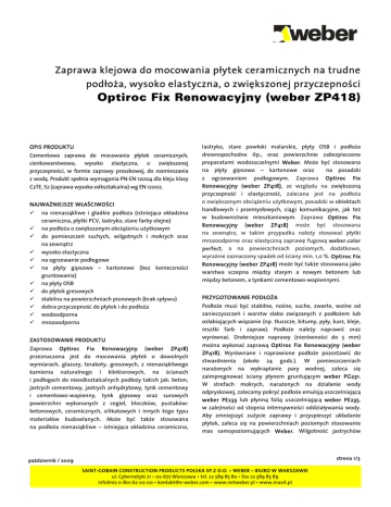 Zaprawa klejowa do mocowania płytek ceramicznych na trudne podłoża, wysoko elastyczna, o zwiększonej przyczepności Optiroc Fix Renowacyjny (weber ZP418) OPIS PRODUKTU Cementowa zaprawa do mocowania płytek ceramicznych, cienkowarstwowa, wysoko elastyczna, o zwiększonej przyczepności, w formie zaprawy proszkowej, do rozmieszania z wodą. Produkt spełnia wymagania PN-EN 12004 dla kleju klasy C2TE, S2 (zaprawa wysoko odkształcalna) wg EN 12002. NAJWAŻNIEJSZE WŁAŚCIWOŚCI 9 9 9 9 9 9 9 9 9 9 9 9 na nienasiąkliwe i gładkie podłoża (istniejąca okładzina ceramiczna, płytki PCV, lastryko, stare farby olejne) na podłoża o zwiększonym obciążeniu użytkowym do pomieszczeń suchych, wilgotnych i mokrych oraz na zewnątrz wysoko elastyczna na ogrzewanie podłogowe na płyty gipsowo – kartonowe (bez konieczności gruntowania) na płyty OSB do płytek gresowych stabilna na powierzchniach pionowych (brak spływu) dobra przyczepność do płytek i do podłoża wodoodporna mrozoodporna ZASTOSOWANIE PRODUKTU Zaprawa Optiroc Fix Renowacyjny (weber ZP418) przeznaczona jest do mocowania płytek o dowolnych wymiarach, glazury, terakoty, gresowych, z nienasiąkliwego kamienia naturalnego i klinkierowych, na ścianach i podłogach do nieodkształcalnych podłoży takich jak: beton, jastrych cementowy, jastrych anhydrytowy, tynk cementowy i cementowo-wapienny, tynk gipsowy oraz surowych powierzchni wykonanych z cegieł, bloczków, pustaków: betonowych, ceramicznych, silikatowych i innych tego typu materiałów budowlanych. Może być także stosowana na podłoża nienasiąkliwe – istniejąca okładzina ceramiczna, lastryko, stare powłoki malarskie, płyty OSB i podłoża drewnopochodne itp., oraz powierzchnie zabezpieczone preparatami wodoszczelnymi Weber. Może być stosowana na płyty gipsowo – kartonowe oraz na posadzki z ogrzewaniem podłogowym. Zaprawa Optiroc Fix Renowacyjny (weber ZP418), ze względu na zwiększoną przyczepność i elastyczność, zalecana jest na podłoża o zwiększonym obciążeniu użytkowym, posadzki w obiektach handlowych i przemysłowych, ciągi komunikacyjne, jak też w budownictwie mieszkaniowym. Zaprawa Optiroc Fix Renowacyjny (weber ZP418) może być stosowana na zewnątrz, w takim przypadku należy stosować płytki mrozoodporne oraz elastyczną zaprawę fugową weber.color perfect, a na powierzchniach poziomych, dodatkowo, wyraźnie zaznaczony spadek od ściany min. 1,0 %. Optiroc Fix Renowacyjny (weber ZP418) może być także stosowana jako warstwa sczepna między starym a nowym betonem lub między betonem, a tynkami cementowo-wapiennymi. PRZYGOTOWANIE PODŁOŻA Podłoże musi być stabilne, nośne, suche, zwarte, wolne od zanieczyszczeń i warstw słabo związanych z podłożem lub osłabiających wiązanie (np. tłuszcze, bitumy, pyły, kurz, kleje, resztki farb i zapraw). Podłoże należy naprawić oraz wyrównać. Drobniejsze naprawy (nierówności do 5 mm) można wykonać zaprawą Optiroc Fix Renowacyjny (weber ZP418). Wyrównane i naprawione podłoże pozostawić do stwardnienia (około 24 godz.). W pomieszczeniach narażonych na wykraplanie pary wodnej, zaleca się zaimpregnować ściany płynem gruntującym weber PG231. W strefach mokrych, narażonych na działanie wody odpryskowej, zalecamy pokryć podłoże emulsją uszczelniającą weber PE233 lub płynną folią uszczelniającą weber PE235, w zależności od stopnia intensywności oddziaływania wody. Aby zmniejszyć zużycie zaprawy i przyspieszyć układanie płytek, zaleca się na powierzchniach poziomych stosowanie mas samopoziomujących Weber. Wilgotność jastrychów strona 1/3 październik / 2009 SAINT-GOBAIN CONSTRUCTION PRODUCTS POLSKA SP.Z O.O. • WEBER – BIURO W WARSZAWIE ul. Cybernetyki 21 • 02-677 Warszawa • tel. 22 589 85 80 • fax 22 589 85 89 infolinia 0-801 62 00 00 • [email protected] • www.netweber.pl • www.maxit.pl Zaprawa klejowa do mocowania płytek ceramicznych na trudne podłoża, wysoko elastyczna, o zwiększonej przyczepności Optiroc Fix Renowacyjny (weber ZP418) cementowych nie powinna przekraczać 4,0 % wagowo, wilgotność jastrychów anhydrytowych 0,5 % wagowo, a wilgotność podłoży gipsowych nie powinna przekraczać 1,0 % wagowo. Podłoża silnie porowate, wymagające redukcji chłonności, należy pokryć 1-2 warstwami płynu gruntującego weber PG231. Podłoża gipsowe (tynki i jastrychy anhydrytowe) należy zagruntować 2 – ma warstwami płynu gruntującego głęboko penetrującego weber PG229. Przed przyklejaniem płytek w systemach ogrzewania podłogowego należy „wygrzać” podłoże, włączyć instalację grzewczą na 24 godz., po czym wyłączyć i odczekać do ostygnięcia. W przypadku klejenia na gładkie, nienasiąkliwe podłoże (istniejące płytki, lastryko, PCV) powierzchnię wystarczy tylko odtłuścić. W przypadku klejenia na płyty OSB, powierzchnię płyty zmatowić grubym papierem ściernym. W przypadku klejenia na stare powłoki farb olejnych, sprawdzić przyczepność farby do podłoża, powierzchnię zmatowić grubym papierem ściernym i odtłuścić. Płyty gipsowo – kartonowe nie muszą być gruntowane, chyba, że wymagają zabezpieczenia jak dla strefy wilgotnej lub mokrej. WSKAZÓWKI WYKONAWCZE Zaprawę nanosić na podłoże gładką krawędzią pacy, wykonując w ten sposób jednocześnie warstwę kontaktową, a następnie równomiernie rozprowadzać krawędzią zębatą. Wielkość zębów pacy dobiera się w zależności od wielkości płytek. Płytek nie moczyć w wodzie. Suche i czyste płytki należy układać na zaprawę przed pojawieniem się matowego „naskórka” (do 30 min od momentu nałożenia na podłoże). Płytki przyklejać przyciskając mocno do warstwy zaprawy i jednocześnie lekko przesuwając. Prawidłowo ułożone płytki ścienne powinny być pokryte zaprawą w 70% – 90% ich spodniej powierzchni. Przy układaniu płytek na podłogach oraz na zewnątrz, 100% powierzchni