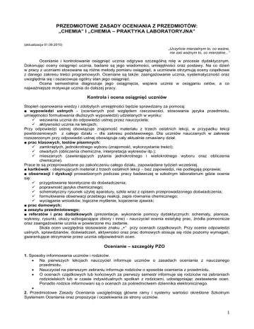 PRZEDMIOTOWE ZASADY OCENIANIA Z PRZEDMIOTÓW: „CHEMIA” I „CHEMIA – PRAKTYKA LABORATORYJNA” (aktualizacja 01.09.2015) „Uczyńcie mierzalnym to, co ważne, nie zaś ważnym to, co mierzalne...” Ocenianie i kontrolowanie osiągnięć ucznia odgrywa szczególną rolę w procesie dydaktycznym. Dokonując oceny osiągnięć ucznia, badane są jego wiadomości, umiejętności oraz postawy. Na co dzień w pracy z uczniami stosowane są różne metody pomiaru osiągnięć, a uczniowie otrzymują oceny cząstkowe z danego zakresu treści programowych. Oceniane są także: zaangażowanie ucznia, systematyczność oraz uwzględnia się i oszacowuje ogólny stan jego osiągnięć. Ocena semestralna diagnozuje jego osiągnięcia, wspiera ucznia w osiąganiu celów, a co najważniejsze motywuje ucznia do dalszej pracy. Kontrola i ocena osiągnięć uczniów Stopień opanowania wiedzy i zdobytych umiejętności będzie sprawdzany za pomocą: ■ wypowiedzi ustnych - (ocenianych pod względem rzeczowości, stosowania języka przedmiotu, umiejętności formułowania dłuższych wypowiedzi) udzielanych w wyniku: wezwania ucznia do odpowiedzi ustnej przez nauczyciela; aktywności ucznia na lekcjach; Przy odpowiedzi ustnej obowiązuje znajomość materiału z trzech ostatnich lekcji, w przypadku lekcji powtórzeniowych z całego działu – dla zakresu podstawowego. Dla uczniów nauczanych w zakresie rozszerzonym przy odpowiedzi ustnej obowiązuje cały aktualnie omawiany dział. ■ prac klasowych, testów pisemnych: zamkniętych, jednokrotnego wyboru (znajomość, wykorzystanie treści); otwartych (obliczenia chemiczne, interpretacja wykresów itp.); mieszanych (zawierających pytania jednokrotnego i wielokrotnego wyboru oraz obliczenia chemiczne). Prace te są przeprowadzane po zakończeniu całego działu, zapowiadane tydzień wcześniej. ■ kartkówek - obejmujących materiał z trzech ostatnich lekcji – bez zapowiedzi, nie podlegają poprawie; ■ obserwacji i dyskusji prowadzonych podczas pracy badawczej w szkolnym laboratorium gdzie ocenia się: przygotowanie teoretyczne do doświadczenia; poprawność języka chemicznego; schematyczny rysunek użytej aparatury, szkła wraz z opisem przeprowadzonego doświadczenia; formułowanie obserwacji przebiegu reakcji, zapis równania chemicznego; wyciąganie wniosków, logiczne myślenie, kojarzenie zjawisk; ■ prac domowych; ■ zeszytu przedmiotowego; ■ referatów i prac dodatkowych (prezentacje, wykonanie pomocy dydaktycznych: schematy, plansze, wykresy, rysunki, okazy wzbogacające zbiory i inne) - nauczyciel ocenia estetykę prac, źródła pomocnicze oraz zaangażowanie ucznia w powierzone mu zadanie. Skala ocen uwzględnia stosowanie znaku „+” przy ocenach cząstkowych. Przy ocenie odpowiedzi ustnych, sprawdzianów, doświadczeń, aktywności oraz prac domowych stosuje się róże poziomy wymagań, gwarantujące otrzymanie przez ucznia odpowiednich ocen. Ocenianie – szczegóły PZO 1. Sposoby informowania uczniów i rodziców. Na pierwszych lekcjach nauczyciel informuje uczniów o zasadach oceniania z nauczanego przedmiotu. Nauczyciel na pierwszym zebraniu informuje rodziców o sposobie oceniania z przedmiotu. O ocenach cząstkowych lub końcowych za pierwszy semestr informuje się rodziców na zebraniach rodzicielskich lub w czasie indywidualnych spotkań z rodzicami, udostępniając zestawienie ocen. Ponadto rodzice informowani są o ocenach za pośrednictwem dziennika elektronicznego. 2. Przedmiotowe Zasady Oceniania uwzględniają główne ramy i systemy wartości określone Szkolnym Systemem Oceniania oraz propozycje i oczekiwania ze strony uczniów. 1 3. Ocenianie jest jawne, oparte o opracowane kryteria, a oceny stawiane przez nauczyciela uzasadnione. Każdy uczeń ma prawo zgłoszenia się do nauczyciela w celu weryfikacji oceny ze sprawdzianu pisemnego (nieprawidłowa punktacja, przeoczenie odpowiedzi itp.). 4. W przypadku prac klasowych, przyjmuje się skale punktową przeliczaną na oceny cyfrowe według kryteriów uwzględniających następujące skale procentowe: 100% - 95% - ocena celująca (6) 94% - 91% - ocena bardzo dobra plus (5+) 90% - 85% - ocena bardzo dobra (5) 84% - 80% - ocena dobra plus (4+) 79% - 70% - ocena dobra (4) 69% - 63% - ocena dostateczna plus (3+) 62% - 51% - ocena dostateczna (3) 50% - 46% - ocena dopuszczająca plus (2+) 45% - 30% - ocena dopuszczająca (2) 29% - 0% - ocena niedostateczna (1) W przypadków kartkówek – ocena bardzo dobra (85 -100%). Przedstawione kryteria stosowane są dla poziomów: podstawowego i rozszerzonego. Na koniec roku szkolnego przewidziany jest test diagnostyczny obejmujący materiał od początku danego roku szkolnego. Test ten jest obowiązkowy dla uczniów realizujących program rozszerzony – (z wagą 6), nie podlega poprawie. Nauczyciel oddaje sprawdzone prace pisemne do wglądu uczniom, w terminie dwóch tygodni od momentu ich napisania. 5. Uczeń ma prawo poprawić ocenę niedostateczną z każdej pracy klasowej - tylko raz w ciągu dwóch tygodni po oddaniu prac (dokładny termin jest ustalany wspólnie przez uczniów i nauczyciela). Dla wszystkich chętnych ustala się jeden termin poprawy. Do dziennika obok oceny uzyskanej poprzednio wpisuje się ocenę z poprawy. Uzyskane dwie oceny są uwzględniane podczas wystawiania ocen semestralnych i rocznych. Uczeń jest zobowiązany do uczestnictwa w pracy pisemnej w określonym przez nauczyciela dniu. Nieobecność na pracy klasowej może być usprawiedliwiona wyłącznie chorobą ucznia (lub pilnymi sprawami rodzinnymi) i potwierdzona przez rodziców lub lekarza. Jeżeli uczeń nie usprawiedliwił swej nieobecności jest zobowiązany do napisania pracy na najbliższej lekcji, na której jest obecny. Rezygnacja z poprawy w wyznaczonym terminie wiąże się z otrzymaniem oceny niedostatecznej i utratą szansy na powtórne napisanie danej pracy klasowej. W odpowiednich sytuacjach, można przeprowadzić krót