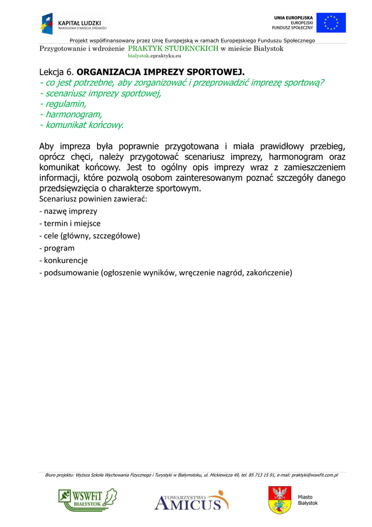 Projekt współfinansowany przez Unię Europejską w ramach Europejskiego Funduszu Społecznego Przygotowanie i wdrożenie PRAKTYK STUDENCKICH w mieście Białystok bialystok.epraktyka.eu Lekcja 6. ORGANIZACJA IMPREZY SPORTOWEJ. - co jest potrzebne, aby zorganizować i przeprowadzić imprezę sportową? scenariusz imprezy sportowej, regulamin, harmonogram, komunikat końcowy. Aby impreza była poprawnie przygotowana i miała prawidłowy przebieg, oprócz chęci, należy przygotować scenariusz imprezy, harmonogram oraz komunikat końcowy. Jest to ogólny opis imprezy wraz z zamieszczeniem informacji, które pozwolą osobom zainteresowanym poznać szczegóły danego przedsięwzięcia o charakterze sportowym. Scenariusz powinien zawierać: - nazwę imprezy - termin i miejsce - cele (główny, szczegółowe) - program - konkurencje - podsumowanie (ogłoszenie wyników, wręczenie nagród, zakończenie) Biuro projektu: Wyższa Szkoła Wychowania Fizycznego i Turystyki w Białymstoku, ul. Mickiewicza 49, tel. 85 713 15 91, e-mail: [email protected] Miasto Białystok Projekt współfinansowany przez Unię Europejską w ramach Europejskiego Funduszu Społecznego Przygotowanie i wdrożenie PRAKTYK STUDENCKICH w mieście Białystok bialystok.epraktyka.eu SCENARIUSZ „RODZINNEGO TURNIEJU TENISA STOŁOWEGO” O PUCHAR DYREKTORA SZKOŁY PODSTAWOWEJ NR 26 W BIAŁYMSTOKU. 1. „Rodzinny Turniej Tenisa Stołowego” odbędzie się 12 marca 2011 roku o godz. 9.00 na Sali gimnastycznej SP 26 w Białymstoku, ul. Radzymińska 11. 2. Cel główny: Przeciwdziałanie zjawiskom negatywnym, poprzez rozbudzanie zainteresowań sportowych Cele szczegółowe: - działania profilaktyczne – sport alternatywą spędzania wolnego czasu, - prowadzenie zdrowego stylu życia, - integracja środowiska lokalnego, - integracja rodziny, - wdrażanie zasady zdrowej rywalizacji sportowej (fair play), - edukacja poprzez zabawę. 3. Program: 9.00 – 11.00 rozgrywki grupowe 11.00 – 12.30 rozgrywki finałowe 4. Zakończenie turnieju: 13.00 – ogłoszenie wyników, wręczenie pucharu, medali i nagród, zakończenie. Regulamin imprezy sportowej, to zbiór reguł i zasad według których zmagania sportowe będą rozgrywane. Także określa w jaki sposób będzie, jeżeli istnieje taka potrzeba, wyłoniony zwycięzca i kolejne miejsca w klasyfikacji. Jaki jest system nagród i kar. Regulamin powinien zawierać: - organizatora imprezy, Biuro projektu: Wyższa Szkoła Wychowania Fizycznego i Turystyki w Białymstoku, ul. Mickiewicza 49, tel. 85 713 15 91, e-mail: [email protected] Miasto Białystok Projekt współfinansowany przez Unię Europejską w ramach Europejskiego Funduszu Społecznego Przygotowanie i wdrożenie PRAKTYK STUDENCKICH w mieście Białystok bialystok.epraktyka.eu - termin i miejsce imprezy, - zasady i sposób przeprowadzenia imprezy, - termin i zasady zgłaszania uczestników, - warunki udziału, - sposób przyznawania nagród. Biuro projektu: Wyższa Szkoła Wychowania Fizycznego i Turystyki w Białymstoku, ul. Mickiewicza 49, tel. 85 713 15 91, e-mail: [email protected] Miasto Białystok Projekt współfinansowany przez Unię Europejską w ramach Europejskiego Funduszu Społecznego Przygotowanie i wdrożenie PRAKTYK STUDENCKICH w mieście Białystok bialystok.epraktyka.eu Regulamin „Rodzinnego Turnieju Tenisa Stołowego” SZKOŁA PODSTAWOWA NR 26 w BIAŁYMSTOKU Białystok; 22.02.2011 r. REGULAMIN RODZINNY TURNIEJ TENISA STOŁOWEGO o PUCHAR DYREKTORA SP 26 I. Cel zawodów: Wzbogacenie programu wychowania fizycznego i zajęć pozalekcyjnych w szkole, upowszechnianie konkursu „ Sport dla Wszystkich ”, integracja środowiska. II. Organizator: Organizatorem zawodów jest SP 26 w Białymstoku dyrekcja nauczyciele wf - III. Termin i miejsce: 12 marca 2011r. (sobota) godzina 9.00 Sala gimnastyczna SP 26 w Białymstoku IV. Reguły ogólne i uczestnictwo: 1. 2. 3. 4. Turniej odbywa się w konkurencji drużynowej systemem pucharowym. W zawodach uczestniczyć mogą uczniowie naszej szkoły z klas IV – VI oraz osoby z nimi spokrewnione (brat, siostra, mama, tata, ciocia, wujek, babcia, dziadek itd.) Drużyna składa się z dwóch osób: ucznia naszej szkoły i osoby z nim spokrewnionej. W wyniku losowania będą ustalone pary drużyn. Mecze pomiędzy drużynami odbywają się według następującego klucza: 1 gra dziecko – dziecko 2 gra kuzyn - kuzyn 3 gra gra podwójna O wyniku meczu decyduje suma wyników poszczególnych gier. Mecze rozgrywane są do momentu zdobycia przez jedną z drużyn 2 punktów. Mecz rozgrywany jest na jednym stole. V. Zgłoszenia: Zgłoszenia przyjmowane są w sekretariacie szkoły, lub u nauczycieli wf do dnia 11.03. 2011r. VI. Nagrody: Zwycięzcy otrzymują pamiątkowe dyplomy, a najlepsze drużyny puchary ufundowany przez dyrektora szkoły. Organizator Biuro projektu: Wyższa Szkoła Wychowania Fizycznego i Turystyki w Białymstoku, ul. Mickiewicza 49, tel. 85 713 15 91, e-mail: [email protected] Miasto Białystok Projekt współfinansowany przez Unię Europejską w ramach Europejskiego Funduszu Społecznego Przygotowanie i wdrożenie PRAKTYK STUDENCKICH w mieście Białystok bialystok.epraktyka.eu Harmonogram imprezy sportowej, to z reguły rozpisany w minutach przebieg imprezy, wyznaczający chronologicznie początki i czas trwania konkretnych zdarzeń mających swój przebieg podczas czasu jej trwania. HARMONOGRAM RODZINNEGO TURNIEJU W TENISIE STOŁOWYM • 8.00 – odprawa personelu technicznego (sędziowie, organizatorzy, wolontariusze) • 8.30 – udostępnienie szatni dla zawodników • 9.00 – oficjalna rozgrzewka • 9.30 – uroczyste otwarcie turnieju • 9.45 – 13.00 – rozgrywki turniejowe • 13.00 – 13.30 – zadania organizacyjne (wypisanie dyplomów, przygotowanie podium i miejsca ceremonii zakończenia turnieju) • 13.30 – podsumowanie, wręczenie medali, dyplomów i nagród dla uczestników • 14.00 – 15.00 – czynności porządkowe • 15.00 – ko