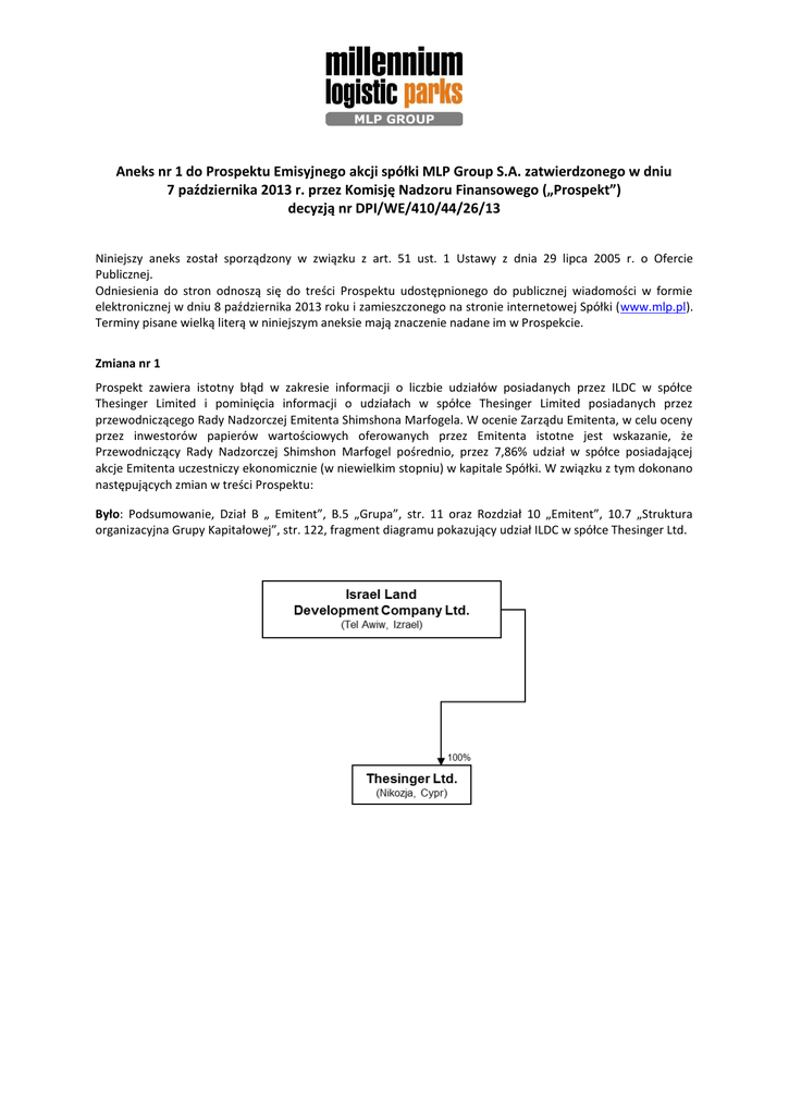 Aneks nr 1 do Prospektu Emisyjnego akcji spółki MLP Group S.A. zatwierdzonego w dniu 7 października 2013 r. przez Komisję Nadzoru Finansowego („Prospekt”) decyzją nr DPI/WE/410/44/26/13 Niniejszy aneks został sporządzony w związku z art. 51 ust. 1 Ustawy z dnia 29 lipca 2005 r. o Ofercie Publicznej. Odniesienia do stron odnoszą się do treści Prospektu udostępnionego do publicznej wiadomości w formie elektronicznej w dniu 8 października 2013 roku i zamieszczonego na stronie internetowej Spółki (www.mlp.pl). Terminy pisane wielką literą w niniejszym aneksie mają znaczenie nadane im w Prospekcie. Zmiana nr 1 Prospekt zawiera istotny błąd w zakresie informacji o liczbie udziałów posiadanych przez ILDC w spółce Thesinger Limited i pominięcia informacji o udziałach w spółce Thesinger Limited posiadanych przez przewodniczącego Rady Nadzorczej Emitenta Shimshona Marfogela. W ocenie Zarządu Emitenta, w celu oceny przez inwestorów papierów wartościowych oferowanych przez Emitenta istotne jest wskazanie, że Przewodniczący Rady Nadzorczej Shimshon Marfogel pośrednio, przez 7,86% udział w spółce posiadającej akcje Emitenta uczestniczy ekonomicznie (w niewielkim stopniu) w kapitale Spółki. W związku z tym dokonano następujących zmian w treści Prospektu: Było: Podsumowanie, Dział B „ Emitent”, B.5 „Grupa”, str. 11 oraz Rozdział 10 „Emitent”, 10.7 „Struktura organizacyjna Grupy Kapitałowej”, str. 122, fragment diagramu pokazujący udział ILDC w spółce Thesinger Ltd. Jest: Podsumowanie, Dział B „ Emitent”, B.5 „Grupa”, str. 11 oraz Rozdział 10 „Emitent”, 10.7 „Struktura organizacyjna Grupy Kapitałowej”, str. 122, fragment diagramu pokazujący udział ILDC Było: Dział B „ Emitent”, B.6 „Znaczni Akcjonariusze”, str. 12 oraz Rozdział 2 „Czynniki ryzyka”, 2.2 „Czynniki ryzyka związane z działalnością Emitenta i Grupy”, „Ryzyko związane z akcjonariuszem większościowym”, str. 33 oraz Rozdział 4 „Rozwodnienie”, str. 55 oraz Rozdział 13 „Znaczni Akcjonariusze”, str. 166. „Przez spółkę Thesinger Ltd., w której kapitale ILDC uczestniczy w 100% oraz poprzez 2/3 udziałów w spółce RRN Holdings & Investments Ltd., która posiada 75% udziałów w spółce Cajamarca Holland B.V., ekonomicznie ILDC uczestniczy w 49,4% kapitału Spółki, kontrolując efektywnie 86,1% głosów na Walnym Zgromadzeniu Spółki. Jest: Podsumowanie, Dział B „ Emitent”, B.6 „Znaczni Akcjonariusze”, str. 12 oraz Rozdział 2 „Czynniki ryzyka”, 2.2 „Czynniki ryzyka związane z działalnością Emitenta i Grupy”, „Ryzyko związane z akcjonariuszem większościowym”, str. 33 oraz Rozdział 4 „Rozwodnienie”, str. 55 oraz Rozdział 13 „Znaczni Akcjonariusze”, str. 166. „Przez spółkę Thesinger Ltd., w której kapitale ILDC uczestniczy w 92,14% oraz poprzez 2/3 udziałów w spółce RRN Holdings & Investments Ltd., która posiada 75% udziałów w spółce Cajamarca Holland B.V., ekonomicznie ILDC uczestniczy w 48,4% kapitału Spółki, kontrolując efektywnie 86,1% głosów na Walnym Zgromadzeniu Spółki.” Było: Rozdział 12 „Zarządzanie i ład korporacyjny”, 12.2 „Rada Nadzorcza”, „Funkcje pełnione przez członków Rady Nadzorczej w organach zarządzających i nadzorczych innych spółek, posiadane udziały”, str. 159. Imię i nazwisko Shimshon Marfogel Podmiot, w którym osoba pełniła funkcję lub posiadała udziały ILDC Ltd. ILDC Hotels Ltd Rapid Vision Ltd. Ma’ariv Holdings Ltd. Sky Line Canada Israel Ltd. Siedziba Funkcja Tel Awiw, Izrael Wiceprezes zarządu Tel Awiw, Izrael Dyrektor Tel Awiw, Izrael Przewodniczący rady nadzorczej Tel Awiw, Izrael Dyrektor Petah-Tikva, Izrael Dyrektor Jest: Rozdział 12 „Zarządzanie i ład korporacyjny”, 12.2 „Rada Nadzorcza”, „Funkcje pełnione przez członków Rady Nadzorczej w organach zarządzających i nadzorczych innych spółek, posiadane udziały”, str. 159. Imię i nazwisko Shimshon Marfogel Podmiot, w którym osoba pełniła funkcję lub posiadała udziały ILDC Ltd. Siedziba Funkcja Tel Awiw, Izrael Wiceprezes zarządu Tel Awiw, Izrael Dyrektor Tel Awiw, Izrael Przewodniczący rady nadzorczej Tel Awiw, Izrael Dyrektor Sky Line Canada Israel Ltd. Petah-Tikva, Izrael Dyrektor Thesinger Ltd. Nikozja, Cypr Wspólnik ILDC Hotels Ltd Rapid Vision Ltd. Ma’ariv Holdings Ltd. Zmiana nr 2 W dniu 8 października 2013 roku Zarząd Emitenta powziął wiadomość o podniesieniu roszczeń przez osoby trzecie wobec wiceprzewodniczącego Rady Nadzorczej Emitenta Eytana Levy dotyczących uprawnień tych osób do wykonywania praw z 69,63% udziałów w spółce N Towards the Next Millenium Ltd. Eytan Levy nie uznaje tych roszczeń. Zgodnie z informacjami z publicznie dostępnych rejestrów Eytan Levy jest wpisany jako jedyny wspólnik spółki N Towards the Next Millenium Ltd. Ponadto, zgodnie z wiedzą Emitenta, roszczenia te nie są obecnie przedmiotem żadnego postępowania i nie są dochodzone na drodze sądowej. Mimo, że powyżej opisane kwestie nie dotyczą bezpośrednio Emitenta, Zarząd Emitenta uznał, że informacja może być istotna dla inwestorów. Spółka N Towards the Next Millenium Ltd. jest powiązana z Emitentem poprzez posiadanie 33,33% (1/3) udziałów w kapitale zakładowym RRN Holdings & Investments Ltd., która uczestniczy w 75% w kapitale zakładowym Cajamarca Holland B.V. posiadającej 73,37% udział w kapitale zakładowym Emitenta. Powyższe oznacza, że efektywny, ekonomiczny udział spółki N Towards the Next Milenium Ltd. w kapitale zakładowym Emitenta wynosi 18,34%, jednak nie kontroluje ona efektywnie żadnych głosów na walnym zgromadzeniu Emitenta. Ponadto, w treści Prospektu wykryto istotny błąd dotyczący pominięcia w tabeli prezentującej funkcje pełnione przez członków Rady Nadzorczej w organach zarządzających i nadzorczych innych spółek oraz posiadane udzia