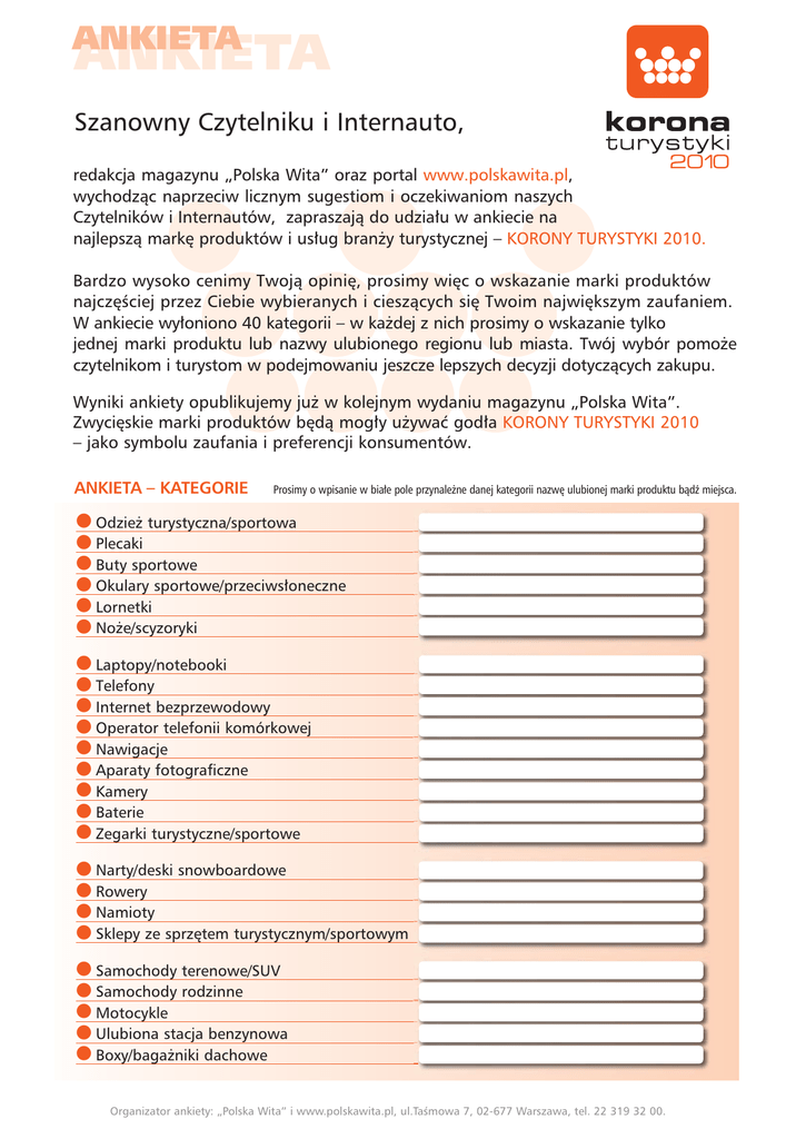 ! ! ! ANKIETA ANKIETA Szanowny Czytelniku i Internauto, redakcja magazynu „Polska Wita” oraz portal www.polskawita.pl, wychodząc naprzeciw licznym sugestiom i oczekiwaniom naszych Czytelników i Internautów, zapraszają do udziału w ankiecie na najlepszą markę produktów i usług branży turystycznej – KORONY TURYSTYKI 2010. Bardzo wysoko cenimy Twoją opinię, prosimy więc o wskazanie marki produktów najczęściej przez Ciebie wybieranych i cieszących się Twoim największym zaufaniem. W ankiecie wyłoniono 40 kategorii – w każdej z nich prosimy o wskazanie tylko jednej marki produktu lub nazwy ulubionego regionu lub miasta. Twój wybór pomoże czytelnikom i turystom w podejmowaniu jeszcze lepszych decyzji dotyczących zakupu. Wyniki ankiety opublikujemy już w kolejnym wydaniu magazynu „Polska Wita”. Zwycięskie marki produktów będą mogły używać godła KORONY TURYSTYKI 2010 – jako symbolu zaufania i preferencji konsumentów. ANKIETA – KATEGORIE Prosimy o wpisanie w białe pole przynależne danej kategorii nazwę ulubionej marki produktu bądź miejsca. l Odzież turystyczna/sportowa l Plecaki l Buty sportowe l Okulary sportowe/przeciwsłoneczne l Lornetki l Noże/scyzoryki l Laptopy/notebooki l Telefony l Internet bezprzewodowy l Operator telefonii komórkowej l Nawigacje l Aparaty fotograficzne l Kamery l Baterie l Zegarki turystyczne/sportowe l Narty/deski snowboardowe l Rowery l Namioty l Sklepy ze sprzętem turystycznym/sportowym l Samochody terenowe/SUV l Samochody rodzinne l Motocykle l Ulubiona stacja benzynowa l Boxy/bagażniki dachowe Organizator ankiety: „Polska Wita” i www.polskawita.pl, ul.TaÊmowa 7, 02-677 Warszawa, tel. 22 319 32 00.