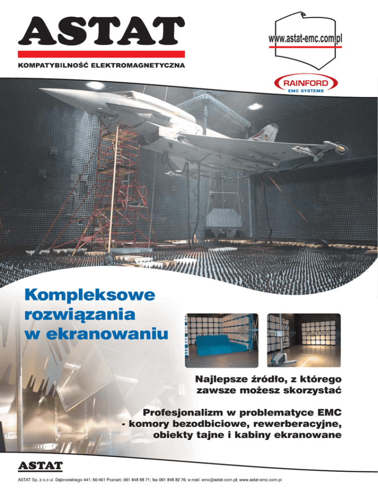 Kompleksowe rozwiązania w ekranowaniu Najlepsze źródło, z którego zawsze możesz skorzystać Profesjonalizm w problematyce EMC - komory bezodbiciowe, rewerberacyjne, obiekty tajne i kabiny ekranowane Kompleksowe rozwiązania w ekranowaniu Rainford EMC Systems i Astat zapraszają do współpracy! Projektujemy, produkujemy i instalujemy komory bezodbiciowe, rewerberacyjne, kabiny ekranowane specjalnie dla Ciebie. W dzisiejszym świecie, pełnym dokumentów prawnych i norm służących naszemu bezpieczeństwu, nie jest łatwo wprowadzić gotowy wyrób do obrotu towarowego. Pomożemy Ci już na starcie tak, by przejście tej drogi było jak najprostsze, najszybsze i najtańsze. Rainford z ponad 35-letnim doświadczeniem w zakresie obiektów ekranowanych posiada wiele doskonałych rozwiązań spełniających wymagania aktualnych norm. Jeśli szukasz czegoś specjalnego, Rainford EMC Systems i Astat służą zawsze pomocą. Posiadamy możliwości przygotowania i realizowania projektu dokładnie według Twoich oczekiwań. Z rozwiązań Rainford EMC Systems i Astat korzystają m.in.: V Akredytowane laboratoria pomiarowe V Niezależne ośrodki badawcze EMC V Firmowe laboratoria kontroli jakości V Firmowe laboratoria działów badawczo-rozwojowych V Laboratoria uczelnii wyższych Branże przemysłowe, z którymi współpracujemy: V Przemysł obronny i lotniczy V Elektronika konsumencka Najlepsze źródło, z którego zawsze możesz skorzystać Profesjonalizm w problematyce EMC - komory bezodbiciowe, rewerberacyjne, obiekty tajne i kabiny ekranowane V Elektronika przemysłowa V Przemysł samochodowy V Telekomunikacja/IT V Medycyna V Przemysł fonograficzny ASTAT Sp. z o.o., 60-451 Poznań, ul. Dąbrowskiego 441, tel. 061 848 88 71, faks 061 848 82 76, www.astat-emc.com.pl, [email protected] Kompleksowe rozwiązania w ekranowaniu Rainford EMC Systems posiada 35-letnie doświadczenie w projektowaniu, produkcji i instalacji obiektów ekranowanych. Światowe doświadczenie w projektowaniu wysokiej klasy komór bezodbiciowych, ich produkcji i instalacji... V Badania emisji i testy odporności V Rozwiązania: 3m Compact, 3m, 5m oraz 10m V Komory do pomiarów anten V Najwyższej jakości obiekty ekranowane dla EMC, TEMPEST, EMP, MRI V Komory rewerberacyjne V Odpowiednie wyposażenie: maszty, stoły obrotowe, sterowniki,... Pozwól nam przygotować i dostarczyć kompletne rozwiązanie pod klucz ... V Projekt V Produkcja V Instalacja/montaż V Kalibracja oraz testy jakości i szczelności V Konserwacja ASTAT Sp. z o.o., 60-451 Poznań, ul. Dąbrowskiego 441, tel. 061 848 88 71, faks 061 848 82 76, www.astat-emc.com.pl, [email protected] Kompleksowe rozwiązania w ekranowaniu Od wstępnego zapytania aż do końcowego rozwiązania System zapewnienia jakości jest nierozerwalną częścią naszej współpracy z Państwem Nasze konsekwentne podejście do zarządzania jakością zapewnia że, każdy produkt wybrany przez Ciebie na pewno spełni najostrzejsze wymagania jakościowe. Wszystkie elementy wyprodukowane przez duet Rainford EMC Systems i Astat podlegają bez wyjątku naszej kontroli w całym cyklu produkcyjnym. Każdy fragment działalności w całym procesie jest dokładnie monitorowany tak, by zapewnić najlepsze parametry i jakość oraz by zagwaratować naszym Klientom poczucie bezpieczeństwa. System zarządzania jakością został sprawdzony i akredytowany według BS EN ISO 9001:2000 Partnerski układ z naszymi Klientami, pozwala nam lepiej zrozumieć ich potrzeby od samego początku. Jeśli poszukujesz dalszych informacji o naszych możliwościach i ofercie lub chciałbyś zorganizować spotkanie z pracownikami naszego działu – skontaktuj się z nami. Najlepsze źródło, z którego zawsze możesz skorzystać. Profesjonalizm w problematyce EMC - komory bezodbiciowe, rewerberacyjne, obiekty tajne i kabiny ekranowane. Tel.: (061) 848 88 71, Fax: (061) 848 82 76 www.astat-emc.com.pl [email protected] ASTAT Sp. z o.o., 60-451 Poznań, ul. Dąbrowskiego 441, tel. 061 848 88 71, faks 061 848 82 76, www.astat-emc.com.pl, [email protected]