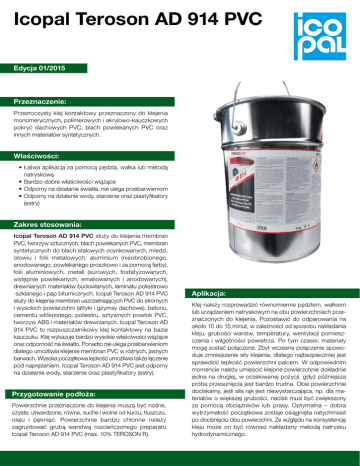 Icopal Teroson AD 914 PVC Edycja 01/2015 Przeznaczenie: Przezroczysty klej kontaktowy przeznaczony do klejenia monomerycznych, polimerowych i akrylowo-kauczkowych pokryć dachowych PVC, blach powlekanych PVC oraz innych materiałów syntetycznych. Właściwości: •Łatwa aplikacja za pomocą pędzla, wałka lub metodą natryskową •Bardzo dobre właściwości wiążące •Odporny na działanie światła, nie ulega przebarwieniom •Odporny na działanie wody, starzenie oraz plastyfikatory (estry) Zakres stosowania: Icopal Teroson AD 914 PVC służy do klejenia membran PVC, tworzyw sztucznych, blach powlekanych PVC, membran syntetycznych do blach stalowych ocynkowanych, miedzi, ołowiu i folii metalowych, aluminium (nieobrobionego, anodowanego, powlekanego proszkowo i za pomocą farby), folii aluminiowych, metali (surowych, fosfatyzowanych, wstępnie powlekanych, emaliowanych i anodowanych), drewnianych materiałów budowlanych, laminatu poliestrowo -szklanego i pap bitumicznych. Icopal Teroson AD 914 PVC służy do klejenia membran uszczelniających PVC do stromych i wysokich powierzchni (attyki i gzymsy dachowe), betonu, cementu włóknistego, poliestru, sztywnych powłok PVC, tworzyw ABS i materiałów drewnianych. Icopal Teroson AD 914 PVC to rozpuszczalnikowy klej kontaktowy na bazie kauczuku. Klej wykazuje bardzo wysokie właściwości wiążące oraz odporność na światło. Ponadto nie ulega przebarwieniom dlatego umożliwia klejenie membran PVC w różnych, jasnych barwach. Wysoka początkowa lepkość umożliwia także łączenie pod naprężeniem. Icopal Teroson AD 914 PVC jest odporny na działanie wody, starzenie oraz plastyfikatory (estry). Przygotowanie podłoża: Powierzchnie przeznaczone do klejenia muszą być nośne, czyste, utwardzone, równe, suche i wolne od kurzu, tłuszczu, oleju i pęknięć. Powierzchnie bardzo chłonne należy zagruntować grubą warstwą rozcieńczonego preparatu Icopal Teroson AD 914 PVC (max. 10% TEROSON R). Aplikacja: Klej należy rozprowadzić równomiernie pędzlem, wałkiem lub urządzeniem natryskowym na obu powierzchniach przeznaczonych do klejenia. Pozostawić do odparowania na około 10 do 15 minut, w zależności od sposobu nakładania kleju, grubości warstw, temperatury, wentylacji pomieszczenia i wilgotności powietrza. Po tym czasie, materiały mogą zostać połączone. Zbyt wczesne połączenie spowoduje zmniejszenie siły klejenia, dlatego najbezpieczniej jest sprawdzić lepkość powierzchni palcem. W odpowiednim momencie należy umieścić klejone powierzchnie dokładnie jedna na drugiej, w oczekiwanej pozycji, gdyż późniejsza próba przesunięcia jest bardzo trudna. Obie powierzchnie dociskamy, jeśli siła rąk jest niewystarczająca, np. dla materiałów o większej grubości, nacisk musi być zwiększony za pomocą obciążników lub prasy. Optymalna – dobra wytrzymałość początkowa zostaje osiągnięta natychmiast po dociśnięciu obu powierzchni. Ze względu na konsystencję kleju może on być również nakładany metodą natrysku hydrodynamicznego. Icopal Teroson AD 914 PVC Uwagi: Temperatury poniżej +5°C, wilgotność i wilgoć, śnieg i lód, ostry wiatr i mróz mogą mieć szkodliwy wpływ na właściwości wiążące produktu. W związku z tym nie należy stosować kleju w ww. warunkach (patrz DIN 18 338). Niskie temperatury (> 5°C) przedłużają czas wysychania, dlatego należy unikać zbyt szybkiego łączenia powierzchni. Nadmiar kleju/plamy kleju należy usunąć za pomocą preparatu TEROSON R 10L EGFD jeszcze przed ich utwardzeniem, także z narzędzi, używając rękawic odpornych na rozpuszczalniki, ochrony oczu, wałków i pędzli z naturalnego włosia. Należy przestrzegać wyżej wymienionych środków bezpieczeństwa. Szczegółowe informacje na temat bezpieczeństwa znajdują się w odpowiednich kartach charakterystyki. Oprócz ww. informacji należy przestrzegać odpowiednich wytycznych i przepisów różnych organizacji i stowarzyszeń handlu, jak również odpowiednich norm. W szczególności należy się zapoznać z następującymi wskazówkami i przepisami w aktualnie obowiązujących wersjach: • Przyjmowane obciążenia dla budynków, ruchu i obciążeń wiatrem budynków . • Pokrycia dachów i prace uszczelniające dachu • Wytyczne dla dachów płaskich wydane przez odpowiednie stowarzyszenia branżowe. Dane techniczne: Opakowanie metalowe 10 kg Główny składnik (baza) kauczuk butadienowoakrylonitrylowy (NBR) Kolor Mętny, półprzezroczysty Zapach Zapach estrów i ketonów Konsystencja Ciecz, nakładana pędzlem lub natryskiwana Temperatura aplikacji (temperatura powietrza/ podłoże) + 5°C to +30°C Środek czyszczący TEROSON R 10L EGFD Gęstość w temp. +20°C Około 0,9 g/cm3 Zawartość stała Około 28% Odporność na temperaturę Około +80°C Minimalny czas odparowania Zależy od temperatury powietrza/podłoża i względnej wilgotności powietrza. Zaleca się sprawdzić powierzchnię palcem. Czas wiązania (+23°C/50% wilgotności wzgl.) Około 10-15 minut Ilość wymagana Zależy od stanu podłoża i metody aplikacji Około 200 do 300 g/m2 przy stosowaniu na obu klejonych powierzchniach (klejenie kontaktowe). Przechowywanie Przechowywać w chłodnym miejscu. Najkorzystniejsza temperatura przechowywania wynosi od +10°C do +20°C. Dopuszczalny okres przechowywania wynosi 12 miesięcy. www.fundament.icopal.pl www.suchymur.icopal.pl www.gwarancje.icopal.pl