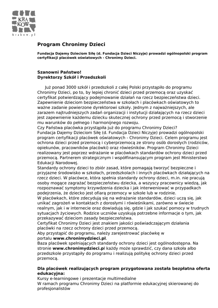 Program Chronimy Dzieci Fundacja Dajemy Dzieciom Siłę (d. Fundacja Dzieci Niczyje) prowadzi ogólnopolski program certyfikacji placówek oświatowych - Chronimy Dzieci. Szanowni Państwo! Dyrektorzy Szkół i Przedszkoli Już ponad 3000 szkół i przedszkoli z całej Polski przystąpiło do programu Chronimy Dzieci, po to, by lepiej chronić dzieci przed przemocą oraz uzyskać certyfikat potwierdzający podejmowanie działań na rzecz bezpieczeństwa dzieci. Zapewnienie dzieciom bezpieczeństwa w szkołach i placówkach oświatowych to ważne zadanie powierzone dyrektorowi szkoły. Jednym z najważniejszych, ale zarazem najtrudniejszych zadań organizacji i instytucji działających na rzecz dzieci jest zapewnienie każdemu dziecku skutecznej ochrony przed przemocą i stworzenie mu warunków do pełnego i harmonijnego rozwoju. Czy Państwa placówka przystąpiła już do programu Chronimy Dzieci? Fundacja Dajemy Dzieciom Siłę (d. Fundacja Dzieci Niczyje) prowadzi ogólnopolski program certyfikacji placówek oświatowych - Chronimy Dzieci. Celem programu jest ochrona dzieci przed przemocą i cyberprzemocą ze strony osób dorosłych (rodziców, opiekunów, pracowników placówki) oraz rówieśników. Program Chronimy Dzieci realizowany jest poprzez wdrażanie w placówkach standardów ochrony dzieci przed przemocą. Partnerem strategicznym i współfinansującym program jest Ministerstwo Edukacji Narodowej. Standardy ochrony dzieci to zbiór zasad, które pomagają tworzyć bezpieczne i przyjazne środowisko w szkołach, przedszkolach i innych placówkach działających na rzecz dzieci. W placówce, która spełnia standardy ochrony dzieci, m.in. nie pracują osoby mogące zagrażać bezpieczeństwu dziecka, a wszyscy pracownicy wiedzą, jak rozpoznawać symptomy krzywdzenia dziecka i jak interweniować w przypadkach podejrzenia, że dziecko jest ofiarą przemocy w szkole lub w rodzinie. W placówkach, które zdecydują się na wdrażanie standardów, dzieci uczą się, jak unikać zagrożeń w kontaktach z dorosłymi i rówieśnikami, zarówno w świecie realnym, jak i w internecie oraz dowiadują się, gdzie i jak szukać pomocy w trudnych sytuacjach życiowych. Rodzice uczniów uzyskują potrzebne informacje o tym, jak przekazywać dzieciom zasady bezpieczeństwa. Certyfikat Chronimy Dzieci jest znakiem jakości poświadczającym działania placówki na rzecz ochrony dzieci przed przemocą. Aby przystąpić do programu, należy zarejestrować placówkę w portalu www.chronimydzieci.pl. Baza placówek spełniających standardy ochrony dzieci jest ogólnodostępna. Na stronie www.chronimydzieci.pl każdy może sprawdzić, czy dana szkoła albo przedszkole przystąpiły do programu i realizują politykę ochrony dzieci przed przemocą. Dla placówek realizujących program przygotowana została bezpłatna oferta edukacyjna: Kursy e-learningowe i prezentacje multimedialne W ramach programu Chronimy Dzieci na platformie edukacyjnej skierowanej do profesjonalistów www.edukacja.fdds.pl została także udostępniona bogata oferta narzędzi multimedialnych. Prezentacje multimedialne i kursy e-learningowe są narzędziami, które mogą być wykorzystywane zarówno w pracy indywidualnej, jak również podczas rad szkoleniowych w szkołach i placówkach systemu oświaty. Wykorzystanie ich pozwala na poszerzenie i pogłębienie wiedzy personelu placówki w obszarze ochrony dzieci przed krzywdzeniem, a także jest pomocne w spełnieniu standardów określonych w ramach programu Chronimy Dzieci. Prezentacje multimedialne: 1. Bezpieczeństwo dzieci i młodzieży w internecie 2. Polityka ochrony dzieci przed krzywdzeniem 3. Rozpoznawanie krzywdzenia dzieci 4. Problem krzywdzenia dzieci – symptomy i konsekwencje 5. Przemoc rówieśnicza 6. Program Chronimy Dzieci – realizacja standardów ochrony dzieci przed krzywdzeniem Kursy e-learningowe: 1. Bezpieczeństwo dzieci i młodzieży online. Kurs dla profesjonalistów. 2. Diagnoza przemocy rówieśniczej. Kurs dla profesjonalistów. 3. Polityka ochrony dzieci przed krzywdzeniem. Kurs dla profesjonalistów. 4. Rozpoznawanie symptomów krzywdzenia dziecka. Kurs dla profesjonalistów. 5. Symptomy wykorzystywania seksualnego a zachowania seksualne dzieci i młodzieży. Kurs dla profesjonalistów. 6. Standardy bezpieczeństwa szkoły w internecie. Kurs dla profesjonalistów. Szkolenia dla nauczycieli Nauczyciele mogą skorzystać z bezpłatnych szkoleń ułatwiających wdrożenie standardów ochrony dzieci przed krzywdzeniem. Podczas szkoleń można zdobyć wiedzę dotyczącą wdrażania w placówce polityki ochrony dzieci przed krzywdzeniem, rozpoznawania symptomów krzywdzenia dzieci, podejmowania interwencji, w tym także w sytuacji przemocy rówieśniczej oraz bezpieczeństwa dzieci i młodzieży w internecie. Fundacja Dajemy Dzieciom Siłę przygotowała również gotowe scenariusze zajęć z dziećmi z zakresu profilaktyki krzywdzenia i wykorzystywania seksualnego oraz profilaktyki ryzykownych zachowań seksualnych młodzieży. Informacje na temat aktualnie realizowanych szkoleń oraz możliwości zapisów można znaleźć na stronie www.edukacja.fdds.pl. Zapraszamy do skorzystania z przygotowanej oferty! Załącznik: 1) Pismo 2) Logo Powered by TCPDF (www.tcpdf.org)