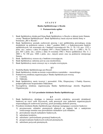 Tekst jednolity uwzględniający postanowienia Uchwały nr 1/2006 ZP z dnia 22.06.2006r., zmiany wprowadzone Uchwałą Nr 2/2008 ZP z dnia 20.06.2008r. , Uchwałą nr 3/2010 ZP z dnia 16.06.2010r. oraz Uchwałą nr 2/2011 ZP z dnia 16.06.2011r. STATUT Banku Spółdzielczego w Reszlu I Postanowienia ogólne §1 1. Bank Spółdzielczy działa pod firmą Bank Spółdzielczy w Reszlu w dalszej treści Statutu 2. 3. 4. 5. zwany "Bankiem Spółdzielczym". Bank Spółdzielczy może używać skrótu firmy w brzmieniu „BS w Reszlu”. Bank Spółdzielczy posiada osobowość prawną i jest spółdzielnią prowadzącą swoją działalność na podstawie ustawy z dnia 7 grudnia 2000 r. o funkcjonowaniu banków spółdzielczych, ich zrzeszaniu się i bankach zrzeszających /Dz. U. Nr 119, poz. 1252 z późn. zm./, ustawy z dnia 29 sierpnia 1997 r. Prawo bankowe /Dz. U. z 2002 r. Nr 72, poz. 665 z późn. zm./, ustawy z dnia 16 września 1982 r. Prawo spółdzielcze /Dz. U. z 2003 r. Nr 188 poz. 1848 z późn. zm./, innych ustaw oraz na podstawie niniejszego Statutu. Bank Spółdzielczy zrzesza się z bankiem zrzeszającym. Bank Spółdzielczy założony jest na czas nieokreślony. Bank Spółdzielczy może zrzeszyć się w związku rewizyjnym. §2 1. Siedzibą Banku Spółdzielczego jest Reszel. 2. Bank Spółdzielczy działa na terenie województwa warmińsko – mazurskiego. 3. Podstawową strukturę organizacyjną w Banku Spółdzielczym tworzą: 1) Centrala, 2) Oddziały. 4. Bank Spółdzielczy może tworzyć i prowadzić: Filie, Ekspozytury i Punkty Kasowe, podporządkowane bezpośrednio Oddziałom. 5. Szczegółową strukturę organizacyjną Banku Spółdzielczego określa Regulamin Organizacyjny. II Cel i przedmiot działania Banku Spółdzielczego §3 1. Bank Spółdzielczy, działając w interesie swoich członków, prowadzi działalność bankową na rzecz osób fizycznych, osób prawnych oraz jednostek organizacyjnych nieposiadających osobowości prawnej, jeżeli posiadają zdolność prawną. 2. Przedmiot działania Banku Spółdzielczego obejmuje następujące czynności bankowe: 1) przyjmowanie wkładów pieniężnych płatnych na żądanie lub z nadejściem oznaczonego terminu oraz prowadzenie rachunków tych wkładów, 2) prowadzenie innych rachunków bankowych, 3) udzielanie kredytów, 4) udzielanie i potwierdzanie gwarancji bankowych, 5) przeprowadzanie bankowych rozliczeń pieniężnych, 6) udzielanie pożyczek pieniężnych, 1 7) operacje czekowe i wekslowe, 8) wydawanie kart płatniczych oraz wykonywanie operacji przy ich użyciu, 9) nabywanie i zbywanie wierzytelności pieniężnych, 10) przechowywanie przedmiotów i papierów wartościowych, 11) udzielanie i potwierdzanie poręczeń, 12) prowadzenie skupu i sprzedaży wartości dewizowych, 13) pośredniczenie w dokonywaniu przekazów pieniężnych oraz rozliczeń w obrocie 3. 4. 5. 6. 7. 8. 9. 10. dewizowym. Przekazy pieniężne dokonywane są za pośrednictwem Banku Zrzeszającego. Czynności bankowe, o których mowa w ust. 2 pkt. 3, 4, 6 i 11, Bank Spółdzielczy może wykonywać z osobami fizycznymi zamieszkującymi lub prowadzącymi przedsiębiorstwo na terenie działania Banku Spółdzielczego lub z osobami prawnymi i jednostkami organizacyjnymi nieposiadającymi osobowości prawnej, a posiadającymi zdolność prawną, mającymi siedzibę lub jednostki organizacyjne na terenie działania Banku Spółdzielczego. Czynności bankowe, o których mowa w ust. 2 pkt. 4 i 11 Bank Spółdzielczy może wykonywać w zakresie i trybie uzgodnionym z Bankiem Zrzeszającym. Bank Spółdzielczy wykonuje również następujące czynności: 1) obejmuje lub nabywa akcje i prawa z akcji, udziały innej osoby prawnej i jednostki uczestnictwa w funduszach inwestycyjnych, 2) dokonuje obrotu papierami wartościowymi, 3) dokonuje, na warunkach uzgodnionych z dłużnikiem, zamiany wierzytelności na składniki majątku dłużnika, 4) nabywa i zbywa nieruchomości, 5) świadczy usługi finansowe w zakresie: a) pośrednictwa przy zawieraniu umów ubezpieczeniowych. Bank Spółdzielczy jest obowiązany do sprzedaży składników majątku, o których mowa w ust. 5 pkt 3, w odniesieniu do: 1) nieruchomości – w okresie nie dłuższym niż 5 lat od daty nabycia, 2) pozostałych składników majątku – w okresie nie dłuższym niż 3 lata od daty nabycia. Obowiązek, o którym mowa w ust. 6, nie spoczywa na Banku Spółdzielczym, jeżeli przejęte składniki majątku wykorzysta do prowadzenia własnej działalności bankowej. Każdorazowe objęcie lub nabycie, o którym mowa w ust. 5 pkt 1, dokonywane w granicach określonych w ustawie Prawo bankowe, wymaga uzyskania zgody Banku Zrzeszającego. Zgody Banku Zrzeszającego nie wymaga obejmowanie lub nabywanie akcji lub praw z akcji lub udziałów banków. Bank Spółdzielczy może, w drodze umowy zawartej na piśmie, na zasadach określonych w ustawie Prawo bankowe, powierzyć przedsiębiorcy lub przedsiębiorcy zagranicznemu, wykonywanie wyłącznie: 1) w imieniu i na rzecz Banku Spółdzielczego pośrednictwa w zakresie czynności bankowych na podstawie umowy agencyjnej, 2) czynności faktycznych związanych z działalnością bankową. Szczegółowe zasady, zakres i tryb powierzenia, o którym mowa w ust. 9 określa regulamin uchwalany przez Zarząd i zatwierdzany przez Radę Nadzorczą. §4 Czynności, o których mowa w postanowieniach Statutu określających przedmiot działania Banku Spółdzielczego, należy sklasyfikować według polskiej Klasyfikacji Działalności (PKD). 2 III Członkowie, ich prawa i obowiązki §5 1. Członkiem Banku Spółdzielczego (zwanym dalej członkiem lub członkiem Banku 2. 3. 4. 5. 6. 7. Spółdzielczego) może być osoba fizyczna o pełnej zdolności do czynności prawnych, a także osoba prawna. Warunkiem przyjęcia na członka Banku Spółdzielczego jest złożenie deklaracji w formie pisemnej pod rygorem nieważności. Podpisana przez przystępującego do Ba