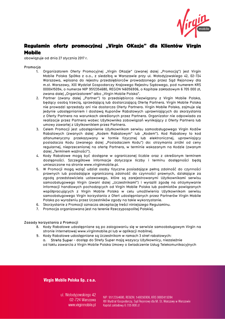 Regulamin oferty promocyjnej „Virgin OKazje” dla Klientów Virgin Mobile obowiązuje od dnia 27 stycznia 2017 r. Promocja 1. Organizatorem Oferty Promocyjnej „Virgin OKazje” (zwanej dalej „Promocją”) jest Virgin Mobile Polska Spółka z o.o., z siedzibą w Warszawie przy ul. Wołodyjowskiego 42, 02-724 Warszawa, wpisana do rejestru przedsiębiorców prowadzonego przez Sąd Rejonowy dla m.st. Warszawy, XIII Wydział Gospodarczy Krajowego Rejestru Sądowego, pod numerem KRS 0000415094, o numerze NIP 9512354680, REGON 146056906, o Kapitale zakładowym 6 705 000 zł, zwana dalej „Organizatorem" albo „Virgin Mobile Polska". 2. Partner (zwany dalej „Partner”) to przedsiębiorca niezwiązany z Virgin Mobile Polska, będący osobą trzecią, sprzedającą lub dostarczającą Ofertę Partnera. Virgin Mobile Polska nie prowadzi sprzedaży ani nie dostarcza Oferty Partnera. Virgin Mobile Polska, zajmuje się jedynie udostępnianiem i dostawą Kuponów Rabatowych uprawniających do skorzystania z Oferty Partnera na warunkach określonych przez Partnera. Organizator nie odpowiada za realizacje przez Partnera wobec Użytkownika zobowiązań wynikający z Oferty Partnera lub umowy zawartej z Użytkownikiem przez Partnera. 3. Celem Promocji jest udostępnienie Użytkownikom serwisu samoobsługowego Virgin Kodów Rabatowych (zwanych dalej „Kodem Rabatowym” lub „Kodem”). Kod Rabatowy to kod alfanumeryczny przekazywany w formie fizycznej lub elektronicznej, uprawniający posiadacza Kodu (zwanego dalej „Posiadaczem Kodu”) do: otrzymania zniżki od ceny regularnej, nieprzecenionej na ofertę Partnera, w terminie wskazanym na Kodzie (zwanym dalej „Terminem ważności”). 4. Kody Rabatowe mogą być dostępne w ograniczonej liczbie oraz z określonym terminem dostępności. Szczegółowe informacje dotyczące liczby i terminu dostępności będą umieszczone na stronie www.virginmobile.pl. 5. W Promocji mogą wziąć udział osoby fizyczne posiadające pełną zdolność do czynności prawnych lub posiadające ograniczoną zdolność do czynności prawnych, działające za zgodą przedstawiciela ustawowego, które są zarejestrowanymi Użytkownikami serwisu samoobsługowego Virgin (zwani dalej „Uczestnikami”) i wyrazili zgodę na otrzymywanie informacji handlowych pochodzących od Virgin Mobile Polska lub podmiotów powiązanych współpracujących z Virgin Mobile Polska w celu umożliwienia Użytkownikom serwisu samoobsługowego Virgin korzystania z Ofert udostępnianych przez Partnerów Virgin Mobile Polska po wyrażeniu przez Uczestników zgody na takie wykorzystanie. 6. Skorzystanie z Promocji oznacza akceptację treści niniejszego Regulaminu. 7. Promocja organizowana jest na terenie Rzeczypospolitej Polskiej. Zasady korzystania z Promocji 8. Kody Rabatowe udostępniane są po zalogowaniu się w serwisie samoobsługowym Virgin na stronie internetowej www.virginmobile.pl lub w aplikacji mobilnej. 9. Kody Rabatowe udostępniane są Uczestnikom w ramach 3 stref rabatowych: a. Strefa Super - dostęp do Strefy Super mają wszyscy Użytkownicy, niezależnie od faktu zawarcia z Virgin Mobile Polska Umowy o świadczenie Usług Telekomunikacyjnych b. Strefa Mega - dostęp do Strefy Mega mają Użytkownicy korzystający z Usług Telekomunikacyjnych Virgin Mobile Polska w ramach Oferty dla Klientów Abonamentowych oraz Użytkownicy korzystający z Usług Telekomunikacyjnych Virgin Mobile Polska w ramach Oferty na Kartę, którzy posiadają aktywny numer i w poprzednim miesiącu kalendarzowym wydali na usługi Virgin Mobile Polska kwotę minimum 35 PLN w ramach jednego numeru poprzez aktywację Pakietów lub korzystając z rozliczenia wg cennika. c. Strefa Giga - dostęp do Strefy Giga mają wszyscy Użytkownicy korzystający z Usług Telekomunikacyjnych Virgin Mobile Polska w ramach Oferty dla Klientów Abonamentowych oraz Użytkownicy korzystający z Usług Telekomunikacyjnych Virgin Mobile Polska w ramach Oferty na Kartę, którzy w ciągu ostatnich 3 miesięcy kalendarzowych wydali na usługi Virgin Mobile Polska, w każdym miesiącu, kwotę minimum 35 PLN w ramach jednego numeru poprzez aktywację Pakietów lub korzystając z rozliczenia wg cennika. 10. Przypisanie do stref odbywać się będzie automatycznie na podstawie kryteriów określonych w pkt 9 powyżej. Przypisanie do Strefy nastąpi w ciągu maksymalnie 4 dni po zakończeniu poprzedniego miesiąca kalendarzowego. 11. W ramach stref dostępne będą dwa rodzaje Kodów Rabatowych: a. bezpłatne – możliwość pobrania Kodu Rabatowego nie wiąże się z koniecznością uiszczenia jakichkolwiek opłat b. płatne – możliwość pobrania Kodu Rabatowego wiąże się koniecznością zapłaty określonej opłaty/kwoty. 12. Płatności za płatne Kody Rabatowe można dokonać za pośrednictwem PayU S.A. z siedzibą w Poznaniu (60-166), przy ul. Grunwaldzkiej 182). Realizacja Kuponu 13. O ile nie określono wyraźnie inaczej: a. nie ma ograniczeń pobrań bezpłatnych Kodów Rabatowych przez Uczestnika b. płatny Kod Rabatowy Uczestnik Promocji będzie mógł pobrać raz na 2 tygodnie. 14. Kod Rabatowy można zrealizować wyłącznie u Partnera lub przedstawiciela Partnera. 15. Kod Rabatowy jest ważny tylko dla jednego Uczestnika. 16. Liczba kodów rabatowych jest ograniczona. 17. Podczas realizacji Kodu Rabatowego u Partnera należy postępować zgodnie z instrukcjami opisanymi w Regulaminie „Virgin Okazje”. 18. W celu realizacji Kodu Rabatowego należy przedstawić go Partnerowi w Terminie Ważności. Kod Rabatowy niezrealizowany w Terminie Ważności wygasa automatycznie. Po wygaśnięciu Terminu Ważności nie można zrealizować Kodu, a Posiadaczowi Kodu Rabatowego nie przysługuje z tego tytułu zwrot kosztów lub odszkodowanie. 19. W przypadku wymiany Kodu Rabatowego na towary lub usługi spoza Oferty Partnera nie przysługuje Użytkownikowi prawo do otrzymania zwrotu gotówki lub nowego Kodu Rabatowego z 