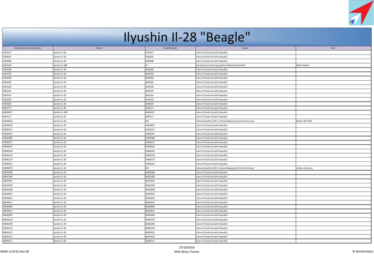 Ilyushin Il-28 "Beagle" Manufactors Serial Number Version Serial Number Owner 1501017 Ilyushin IL-28 1501017 Union of Soviet Socialist Republic 5400635 Ilyushin IL-28 5400635 Union of Soviet Socialist Republic 2400908 Ilyushin IL-28 2400908 Union of Soviet Socialist Republic 2402010 Ilyushin IL-28R 47 Sily Powietrzne Rzeczpospolitej Polskiej (Poland AF) 3402628 Ilyushin IL-28 3402628 Union of Soviet Socialist Republic 3402702 Ilyushin IL-28 3402702 Union of Soviet Socialist Republic 3402918 Ilyushin IL-28 3402918 Union of Soviet Socialist Republic 3403010 Ilyushin IL-28 3403010 Union of Soviet Socialist Republic 3403106 Ilyushin IL-28 3403106 Union of Soviet Socialist Republic 3403107 Ilyushin IL-28 3403107 Union of Soviet Socialist Republic 3403116 Ilyushin IL-28 3403116 Union of Soviet Socialist Republic 3403220 Ilyushin IL-28 3403220 Union of Soviet Socialist Republic 3403602 Ilyushin IL-28 3403602 Union of Soviet Socialist Republic 4403717 Ilyushin IL-28 4403717 Union of Soviet Socialist Republic 44004017 Ilyushin IL-28R 44004017 Union of Soviet Socialist Republic 4404117 Ilyushin IL-28 4404117 Union of Soviet Socialist Republic 44004426 Ilyushin IL-28 204 Luftstreitkraefte (LSK) / Luftverteidigung (LV) (East Germany) 54005879 Ilyushin IL-28 54005879 Union of Soviet Socialist Republic 54005917 Ilyushin IL-28 54005917 Union of Soviet Socialist Republic 54005947 Ilyushin IL-28 54005947 Union of Soviet Socialist Republic 54005980 Ilyushin IL-28 54005980 Union of Soviet Socialist Republic 54006017 Ilyushin IL-28 54006017 Union of Soviet Socialist Republic 54006025 Ilyushin IL-28 54006025 Union of Soviet Socialist Republic 54006104 Ilyushin IL-28 54006104 Union of Soviet Socialist Republic 54006138 Ilyushin IL-28 54006138 Union of Soviet Socialist Republic 54006170 Ilyushin IL-28 54006170 Union of Soviet Socialist Republic 54006201 Ilyushin IL-28 54006201 Union of Soviet Socialist Republic 54006279 Ilyushin IL-28 205 Luftstreitkraefte (LSK) / Luftverteidigung (LV) (East Germany) 64006908 Ilyushin IL-28 64006908 Union of Soviet Socialist Republic 64007408 Ilyushin IL-28 64007408 Union of Soviet Socialist Republic 36603301 Ilyushin IL-28 36603301 Union of Soviet Socialist Republic 36603309 Ilyushin IL-28 36603309 Union of Soviet Socialist Republic 36603608 Ilyushin IL-28 36603608 Union of Soviet Socialist Republic 36603807 Ilyushin IL-28 36603807 Union of Soviet Socialist Republic 36604203 Ilyushin IL-28 36604203 Union of Soviet Socialist Republic 46604417 Ilyushin IL-28 46604417 Union of Soviet Socialist Republic 46604809 Ilyushin IL-28 46604809 Union of Soviet Socialist Republic 46604911 Ilyushin IL-28 46604911 Union of Soviet Socialist Republic 46605004 Ilyushin IL-28 46605004 Union of Soviet Socialist Republic 46605019 Ilyushin IL-28 46605019 Union of Soviet Socialist Republic 46605209 Ilyushin IL-28 46605209 Union of Soviet Socialist Republic 46605219 Ilyushin IL-28 46605219 Union of Soviet Socialist Republic 46605411 Ilyushin IL-28 46605411 Union of Soviet Socialist Republic 46605415 Ilyushin IL-28 46605415 Union of Soviet Socialist Republic 56605517 Ilyushin IL-28 56605517 Union of Soviet Socialist Republic WMA 1110 01 Rev 06 27/10/2016 With Many Thanks Fate Deblin Poland Written Off 1963 Cottbus Germany © Worldmilitair Manufactors Serial Number Version Serial Number Owner Fate 56605702 Ilyushin IL-28 56605702 Union of Soviet Socialist Republic 56605703 Ilyushin IL-28 "Beagle" 425 Al Quwwa al Jawwiya al Iraqiya 56605704 Ilyushin IL-28 "Beagle" 426 Al Quwwa al Jawwiya al Iraqiya 56605705 Ilyushin IL-28 56605705 Union of Soviet Socialist Republic 56605717 Ilyushin IL-28 "Beagle" 427 Al Quwwa al Jawwiya al Iraqiya 56605818 Ilyushin IL-28 56605818 Union of Soviet Socialist Republic 56605913 Ilyushin IL-28 56605913 Union of Soviet Socialist Republic 56606111 Ilyushin IL-28 56606111 Union of Soviet Socialist Republic 56606118 Ilyushin IL-28 56606118 56606201 Ilyushin IL-28 56606201 Ilyushin IL-28 56606201 56606201 Ilyushin IL-28 56606201 Union of Soviet Socialist Republic 56606206 Ilyushin IL-28 "Beagle" 430 Al Quwwa al Jawwiya al Iraqiya 56606206 Ilyushin IL-28 "Beagle" 434 Al Quwwa al Jawwiya al Iraqiya 56606209 Ilyushin IL-28 56606210 Ilyushin IL-28 51 Sily Powietrzne Rzeczpospolitej Polskiej (Poland AF) 56606211 Ilyushin IL-28 Sily Powietrzne Rzeczpospolitej Polskiej (Poland AF) 56606212 Ilyushin IL-28 Sily Powietrzne Rzeczpospolitej Polskiej (Poland AF) 56606213 Ilyushin IL-28 56606540 Ilyushin IL-28 "Beagle" 56652109 Ilyushin IL-28 Sily Powietrzne Rzeczpospolitej Polskiej (Poland AF) 56652409 Ilyushin IL-28 Sily Powietrzne Rzeczpospolitej Polskiej (Poland AF) 56652419 Ilyushin IL-28 Sily Powietrzne Rzeczpospolitej Polskiej (Poland AF) 56652420 Ilyushin IL-28 56652509 Ilyushin IL-28 56652510 Ilyushin IL-28 Sily Powietrzne Rzeczpospolitej Polskiej (Poland AF) 56652511 Ilyushin IL-28 Sily Powietrzne Rzeczpospolitej Polskiej (Poland AF) 56652512 Ilyushin IL-28 Sily Powietrzne Rzeczpospolitej Polskiej (Poland AF) 56652517 Ilyushin IL-28 Sily Powietrzne Rzeczpospolitej Polskiej (Poland AF) 56652518 Ilyushin IL-28 Sily Powietrzne Rzeczpospolitej Polskiej (Poland AF) 56652601 Ilyushin IL-28 Sily Powietrzne Rzeczpospolitej Polskiej (Poland AF) 56652603 Ilyushin IL-28 65010219 Ilyushin IL-28 65010219 65010809 Ilyushin IL-28 65010809 Union of Soviet Socialist Republic 610001 Ilyushin IL-28U "Beagle" 001 Fortele Aeriene Romane (Romania) 610002 Ilyushin IL-28U "Beagle" 002 Fortele Aeriene Romane (Romania) 610003 Ilyushin IL-28U "Beagle" 003 Fortele Aeriene Romane (Romania) 610004 Ilyushin IL-28U Sily Powietrzne Rzeczpospolitej Polskiej (Poland AF) 610005 Ilyushin IL-28U Sily Powietrzne Rzeczpospolitej Polskiej (Poland AF) 610006 Ilyushin IL-28U Sily Powietrzne Rzeczpospolitej Polskiej (Poland AF) 610007 Ilyushin IL-28U 610008 Ilyushin IL-28U "Beagle" 018 Fortele Aeriene Romane (Romania) 610062 Ilyushin IL-28U "Beagle" 062 Fortele Aeriene Romane (Romania) 610119 Ilyushin IL-28U 610311 Ilyushin IL