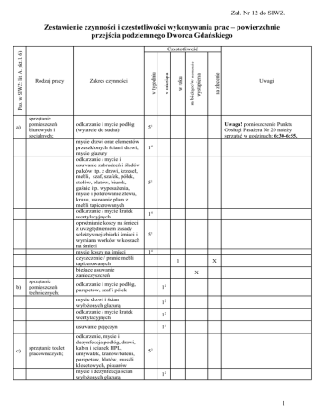 Zał. Nr 12 do SIWZ. a) sprzątanie pomieszczeń biurowych i socjalnych; odkurzanie i mycie podłóg (wytarcie do sucha) mycie drzwi oraz elementów przeszklonych ścian i drzwi, mycie glazury odkurzanie / mycie i usuwanie zabrudzeń i śladów palców itp. z drzwi, krzeseł, mebli, szaf, szafek, półek, stołów, blatów, biurek, gaśnic itp. wyposażenia, mycie i polerowanie zlewu, kranu, usuwanie plam z mebli tapicerowanych odkurzanie / mycie kratek wentylacyjnych opróżnianie koszy na śmieci z uwzględnieniem zasady selektywnej zbiórki śmieci i wymiana worków w koszach na śmieci mycie koszy na śmieci czyszczenie / pranie mebli tapicerowanych bieżące usuwanie zanieczyszczeń b) sprzątanie pomieszczeń technicznych; 51 14 51 14 1 X X 12 12 12 12 usuwanie pajęczyn sprzątanie toalet pracowniczych; na zlecenie 14 mycie drzwi i ścian wyłożonych glazurą odkurzanie / mycie kratek wentylacyjnych c) Uwagi Uwaga! pomieszczenie Punktu Obsługi Pasażera Nr 20 należy sprzątać w godzinach: 6:30-6:55. 51 odkurzanie i mycie podłóg, parapetów, szaf i półek odkurzenie, mycie i dezynfekcja podłóg, drzwi, kabin i ścianek HPL, umywalek, kranów/baterii, parapetów, blatów, muszli klozetowych, pisuarów mycie i dezynfekcja ścian wyłożonych glazurą na bieżąco/w momencie wystąpienia Zakres czynności w roku Rodzaj pracy w miesiącu Częstotliwość w tygodniu Poz. w SIWZ: lit. A. pkt.1. 6) Zestawienie czynności i częstotliwości wykonywania prac – powierzchnie przejścia podziemnego Dworca Gdańskiego 53 12 1 usuwanie graffiti na zlecenie na bieżąco/w momencie wystąpienia sprzątanie i utrzymanie w ciągłej czystości pomieszczeń toalet ogólnodostępnych; mycie pojemników na papier toaletowy, mydło i ręczniki papierowe odkurzanie term do podgrzewania wody usuwanie śmieci z koszy na śmieci z uwzględnieniem zasady selektywnej zbiórki śmieci i wymiana worków w koszach na śmieci mycie i dezynfekcja koszy na śmieci odświeżenie powietrza uzupełnienie, w zamontowanych do tego celu pojemnikach, papieru toaletowego, ręczników papierowych odkurzanie / mycie kratek wentylacyjnych mycie i polerowanie luster odkurzenie, mycie i dezynfekcja podłóg (wytarcie do sucha), drzwi, kabin i ścianek HPL, umywalek, kranów/baterii, parapetów, blatów, muszli klozetowych i pisuarów, koszy na śmieci mycie i dezynfekcja ścian wyłożonych glazurą mycie pojemników na papier toaletowy, mydło i ręczniki papierowe odkurzanie termy do podgrzewania wody opróżnianie koszy na śmieci z uwzględnieniem zasady selektywnej zbiórki śmieci i wymiana worków w koszach na śmieci odświeżenie powietrza mycie i polerowanie luster uzupełnienie, w zamontowanych do tego celu pojemnikach, papieru toaletowego, ręczników papierowych odkurzanie / mycie kratek wentylacyjnych w roku Zakres czynności w miesiącu Rodzaj pracy w tygodniu Poz. w SIWZ: lit. A. pkt.1. 6) d) Częstotliwość Uwagi 53 14 53 13 53 Nie dopuszcza się wykładania papieru i ręczników papierowych poza pojemnikami. 53 14 53 Uwaga! sprzątanie okresowe: standardy czystości określone dla pomieszczeń toalet ogólnodostępnych mają być osiągnięte na godziny: 6:00, 10:00, 14:00, 18:00. 7 14 7 14 7 7 7 7 X Nie dopuszcza się wykładania papieru i ręczników papierowych poza pojemnikami. X Technologię usuwania graffiti należy dostosować do rodzaju czyszczonej powierzchni. 14 2 bieżące usuwanie zanieczyszczeń e) sprzątanie i utrzymanie w ciągłej czystości ciągów komunikacyjnych ze schodami granitowymi, ruchomymi; odkurzanie i zmywanie ciągów komunikacyjnych (posadzek i schodów, w tym schodów ruchomych, poręczy) X W zależności od warunków atmosferycznych zwiększa się śliskość powierzchni na skutek występowania: wody, błota, śniegu, błota pośniegowego itp. na zlecenie X X 17 X X6 X usuwanie graffiti f) na bieżąco/w momencie wystąpienia W godz. 22:00-6:00. 75 zrywanie i usuwanie ogłoszeń, na których umieszczenie Zamawiający nie wyraził zgody usuwanie śladów palców, butów i innych zanieczyszczeń z wewnętrznych części ścian, okładzin, słupów, filarów, przeszkleń mycie glazury, filarów usuwanie kurzu, zabrudzeń spowodowanych przez ptaki (gałęzie, patyki) i innych zanieczyszczeń w przestrzeniach i ciągach technicznych, teletechnicznych usuwanie pajęczyn sprzątanie i utrzymanie w ciągłej czystości wind osobowych; Uwagi X likwidacja śniegu, błota pośniegowego, wody, lodu, piachu bieżące usuwanie zanieczyszczeń odkurzenie i umycie całego wnętrza windy (podłoga, ściany, sufit, futryna, skrzydła drzwiowe, elementy wejścia, prowadnice drzwi) odświeżenie powietrza bieżące usuwanie zanieczyszczeń, także w zadaszonych przedsionkach wind w roku Zakres czynności w miesiącu Rodzaj pracy w tygodniu Poz. w SIWZ: lit. A. pkt.1. 6) Częstotliwość X Technologię usuwania graffiti należy dostosować do rodzaju czyszczonej powierzchni. X Sprzątanie okresowe – standardy czystości określone dla wind mają być osiągnięte na godziny: 7:00, 13:00, 19:00. 7 X X 3 usuwanie sopli lodu i nawisów śnieżnych z zadaszeń w sposób nie uszkadzający oczyszczanej powierzchni likwidacja gołoledzi, błota pośniegowego, wody, lodu, piachu w zadaszonych przedsionkach wind g) h) i) j) oczyszczanie i udrażnianie kratek kanalizacyjnych z zanieczyszczeń; zebranie naniesionych zanieczyszczeń oraz ręczne lub mechaniczne udrożnienie kratek kanalizacyjnych w sposób nie powodujący ich uszkodzenia mycie zadaszeń zewnętrznych; mycie z użyciem właściwych środków powierzchni zadaszeń zewnętrznych wejścia/wyjścia (zewnętrznej i wewnętrznej strony), także ścian bocznych odśnieżanie zadaszeń zewnętrznych; likwidacja gołoledzi na schodach oraz na zewnętrznych, przyległych chodnikach; usunięcie pokrywy śnieżnej z zadaszeń wejścia/wyjścia w sposób nie uszkadzający oczyszczanej powierzchni usuwanie sopli lodu i nawisów śnieżnych z za