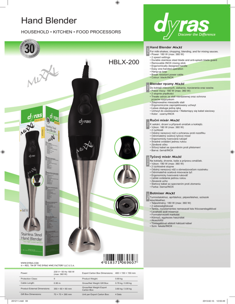 Hand Blender English HOUSEHOLD • KITCHEN • FOOD PROCESSORS Magyar Slovenský Český Polski HBLX-200 Hand Blender MixXL For milk-shakes, chopping, blending, and for mixing sauces. • Power: 180 W (max: 360 W) • 2 speed settings • Durable stainless steel blade and anti-splash blade guard • Removable INOX mixing stick • Ergonomically designed handle • Easy one-handed operation • Hang-up loop • Break resistant power cable • Colour: black/INOX Blender ręczny MixXL Do koktajli mlecznych, siekania, rozcierania oraz sosów. • Pobór mocy: 180 W (max: 360 W) • 2 stopnie prędkości • Trwałe ostrze ze stali nierdzewnej oraz ochrona przeciw rozpryskom • Zdejmowalne mieszadło stali • Ergonomicznie zaprojektowany uchwyt • Łatwa obsługa jedną ręką • Uchwyt do zawieszania • Niełamiący się kabel sieciowy • Kolor: czarny/INOX Ruční mixér MixXL K sekání, drcení a přípravě omáček a koktejlů. • Výkon: 180 W (max: 360 W) • 2 rychlosti • Odolný nerezový nůž s ochranou proti rozstřiku • Odnímatelný ocelový tyčový mixer • Ergonomicky tvarovaná rukojeť • Snadné ovládání jednou rukou • Závěsné očko • Síťový kabel se zpevněním proti přelomení • Barva: černá/INOX Tyčový mixér MixXL Na koktaily, drvenie, kaše a prípravu omáčiek. • Výkon: 180 W (max: 360 W) • 2 rýchlostné stupne • Odolný nerezový nôž s obmedzovačom rozstreku • Odnímateľná ocelová mixovacia tyč • Ergonomicky tvarovaná rukoväť • Ľahké ovládanie jednou rukou • Závesné ucho • Sieťový kábel so spevnením proti zlomeniu • Farba: čierna/INOX Botmixer MixXL Turmixitalokhoz, aprításhoz, pépesítéshez, szószok készítéséhez. • Teljesítmény: 180 W (max: 360 W) • 2 sebességfokozat • Tartós, rozsdamentes nemesacél kés fröccsenésgátlóval • Levehető acél mixerrúd • Formatervezett markolat • Könnyű, egykezes használat • Akasztófül • Törésgátlóval ellátott hálózati kábel • Szín: fekete/INOX WWW.DYRAS.COM ® = REG. TM OF THE DYRAS WWE.FACTORY LLC U.S.A. Power: 230 V~ 50 Hz 180 W (max: 360 W) Protection Class: II Product Weight: 0.69 kg Cable Length: 0.90 m Gross/Net Weight Gift Box: 0.78 kg / 0.69 kg Product External Dimensions: 350 × 60 × 60 mm Gross/Net Weight Export Carton Box: 3.60 kg / 3.00 kg Gift Box Dimensions: 70 × 70 × 390 mm Unit per Export Carton Box: 4 Sets 201211.indd 84 Export Carton Box Dimensions: 400 × 150 × 150 mm 2013.02.12. 12:55:49