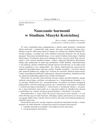 Biuletyn SPMK nr 2 ALFRED BĄCZKOWICZ Opole Nauczanie harmonii w Studium Muzyki Kościelnej Rzeczy trudne i skomplikowane należy przekazywać w formie prostej i zrozumiałej W czasie wieloletniej pracy pedagogicznej z zakresu nauki harmonii i kształcenia słuchu nurtowały i zastanawiały mnie sprawy dotyczące możliwości lepszego przybliżenia uczniom szkół muzycznych II stopnia oraz słuchaczom Studium Muzyki Kościelnej trudnego i zawiłego dla wielu problemu nauczania harmonii oraz jej lepszej percepcji. Nauczania niestandardowego, a tym samym bardziej skutecznego i bardziej efektywnego. Czynnikiem sprawczym nurtujących mnie wówczas myśli była obowiązująca w tych czasach oficjalnie książka – traktat o harmonii Kazimierza Sikorskiego, służąca jako podręcznik do nauki tego przedmiotu. Układ definicji, niekonsekwencja w ich realizacji, zbytnio rozbudowana metoda opisowa powodowały, że nie tylko uczeń czuł się zagubiony w tym „podręczniku”, ale i młody, niedoświadczony nauczyciel nie znajdował uporządkowanej, logicznej metody. Ponadto przykłady i ćwiczenia służące jako materiał dydaktyczny, mające być wzorcem do tworzenia własnych muzycznych, a także muzykalnych przebiegów funkcyjnych, własnych konstrukcji, charakteryzowały się „drętwotą strukturalną, papierowym, suchym brzmieniem”. Odczuwało się potrzebę wprowadzenia nowego, innego sposobu podejścia, innego myślenia muzycznego, myślenia wywodzącego się z bezpośredniego kontaktu z żywą muzyką. Studiowanie zaś i przeanalizowanie wszystkich ówcześnie dostępnych podręczników zarówno polskojęzycznych, jak i niemieckich, francuskich, rosyjskich i czeskich pod kątem przydatności i zastosowania w kształceniu słuchu, a szczególnie w nauce harmonii, przyczyniły się w znacznym stopniu do zakiełkowania decyzji o podzieleniu się z innymi własnymi przemyśleniami i wnioskami w tej materii. Przestudiowałem w sumie około 80 pozycji dotyczących teorii muzyki, a w tym około 60 dotyczących nauki harmonii, dokonując analizy porównawczej i krytycznej, wyciągając daleko idące wnioski. Praca ta była to dla mnie niezwykłą przygodą intelektualno-muzyczną. Przemyślenia powyższe zaczęły stopniowo przybierać materialne kształty w formie skryptów do nauki harmonii z propozycją różnych rozwiązań dotyczących: 1. rozkładu materiału (szczególnie w początkowej fazie nauczania), 2. rewizji przyjętych skal głosów, 67 Biuletyn SPMK nr 2 3. miejsca i czasu wprowadzania dźwięków obcych, 4. akordów pobocznych, 5. definicji połączeń ścisłych i swobodnych, 6. ilości i rodzajów układów, 7. symboliki oznaczeń funkcyjnych, 8. cyfr określających składniki i interwały i wiele innych problemów i zjawisk harmonicznych, których tu ze względu na ograniczoność miejsca nie sposób wymienić i omówić. Efektem tego jest powstanie nowego skryptu do nauki harmonii, którego części A i B obejmują trójdźwięki główne i poboczne wszystkich postaci oraz dźwięki obce, części C i D cztero- i pięciodźwięki, z kolei część E – rozszerzoną tonalność i modulacje. W skrypcie widoczne jest diametralnie inne spojrzenie na proces nauczania tego przedmiotu. ad. 1 MATERIAŁ NAUCZANIA Harmonia III – V rok nauki w Studium Muzyki Kościelnej Rok III, semestr I A. TRÓJDŹWIĘKI GŁÓWNE I POBOCZNE W POSTACI ZASADNICZEJ I. Ścisłe łączenie w relacji kwinty, sekundy i tercji Relacja kwinty 1. Ścisłe łączenie trójdźwięków głównych. 2. Ścisłe łączenie trójdźwięków pobocznych i głównych. Relacja sekundy 3. Ścisłe łączenie trójdźwięków głównych. 4. Ścisłe łączenie trójdźwięków pobocznych i głównych. Relacja tercji 5. Ścisłe łączenie trójdźwięków pobocznych i głównych. Rok III, semestr II II. Swobodne łączenie w relacji kwinty, sekundy i tercji Relacja kwinty 6. Pierwsze swobodne łączenie trójdźwięków głównych. 7. Pierwsze swobodne łączenie trójdźwięków pobocznych i głównych. 8. Drugie swobodne łączenie trójdźwięków głównych. 9. Drugie swobodne łączenie trójdźwięków pobocznych i głównych. Relacja sekundy 10. Pierwsze swobodne łączenie trójdźwięków głównych. 68 Biuletyn SPMK nr 2 11. Pierwsze swobodne łączenie trójdźwięków pobocznych i głównych. 12. Drugie swobodne łączenie trójdźwięków głównych. 13. Drugie swobodne łączenie trójdźwięków pobocznych i głównych. Relacja tercji 14. Pierwsze swobodne łączenie trójdźwięków pobocznych i głównych. 15. Drugie swobodne łączenie trójdźwięków pobocznych i głównych. Rok IV, semestr I B. TRÓJDŹWIĘKI GŁÓWNE I POBOCZNE W PRZEWROTACH III. Ścisłe i swobodne łączenie w relacji kwinty, sekundy i tercji akordów sekstowych Relacja kwinty 16. Ścisłe łączenie trójdźwięków głównych. 17. Ścisłe łączenie trójdźwięków pobocznych i głównych. 18. Swobodne łączenie trójdźwięków głównych. 19. Swobodne łączenie trójdźwięków pobocznych i głównych. Relacja sekundy 20. Ścisłe łączenie trójdźwięków głównych. 21. Ścisłe łączenie trójdźwięków pobocznych i głównych. 22. Swobodne łączenie trójdźwięków głównych. 23. Swobodne łączenie trójdźwięków pobocznych i głównych. Relacja tercji 24. Ścisłe łączenie trójdźwięków pobocznych i głównych. 25. Swobodne łączenie trójdźwięków pobocznych i głównych. IV. Łączenie akordów kwartsekstowych 26. Łączenie trójdźwięków głównych. 27. Łączenie trójdźwięków pobocznych i głównych. Rok IV, semestr II C. CZTERODŹWIĘKI Z DODANĄ SEKSTĄ I CZTERODŹWIĘKI SEPTYMOWE GŁÓWNE I POBOCZNE V. Ścisłe i swobodne rozwiązywanie dodanej seksty 28. Ścisłe rozwiązywanie dodanej seksty w akordach głównych. 29. Ścisłe rozwiązywanie dodanej seksty w akordach pobocznych. 30. Swobodne rozwiązywanie dodanej seksty w akordach głównych. 31. Swobodne rozwiązywanie dod