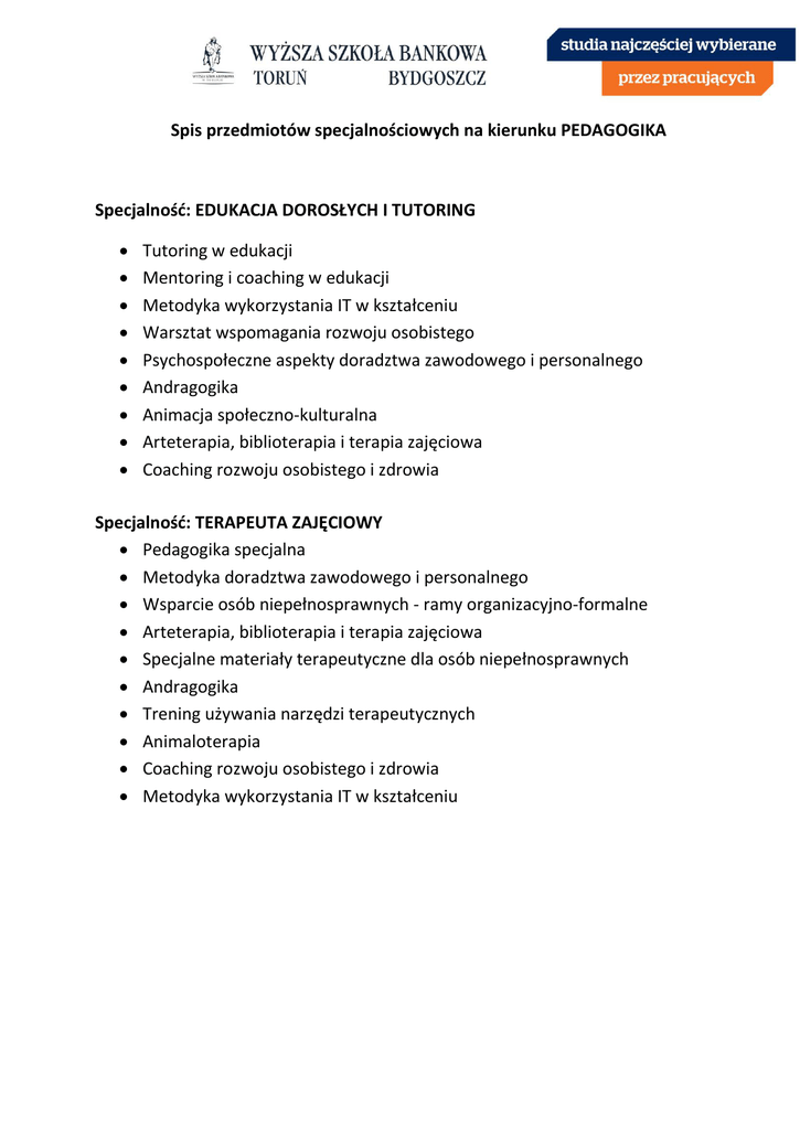 Spis przedmiotów specjalnościowych na kierunku PEDAGOGIKA Specjalność: EDUKACJA DOROSŁYCH I TUTORING Tutoring w edukacji Mentoring i coaching w edukacji Metodyka wykorzystania IT w kształceniu Warsztat wspomagania rozwoju osobistego Psychospołeczne aspekty doradztwa zawodowego i personalnego Andragogika Animacja społeczno-kulturalna Arteterapia, biblioterapia i terapia zajęciowa Coaching rozwoju osobistego i zdrowia Specjalność: TERAPEUTA ZAJĘCIOWY Pedagogika specjalna Metodyka doradztwa zawodowego i personalnego Wsparcie osób niepełnosprawnych - ramy organizacyjno-formalne Arteterapia, biblioterapia i terapia zajęciowa Specjalne materiały terapeutyczne dla osób niepełnosprawnych Andragogika Trening używania narzędzi terapeutycznych Animaloterapia Coaching rozwoju osobistego i zdrowia Metodyka wykorzystania IT w kształceniu Specjalność: PEDAGOGIKA RESOCJALIZACYJNA Z PROFILAKTYKĄ UZALEŻNIEŃ Pedagogika resocjalizacyjna Prawne podstawy resocjalizacji Podstawy kryminologii Diagnostyka w pracy resocjalizacyjnej i profilaktycznej Profilaktyka społeczna Metodyka pracy resocjalizacyjnej Penitencjarystyka Uzależnienia – profilaktyka, terapia, resocjalizacja Interwencja kryzysowa Praca profilaktyczno-resocjalizacyjna w środowisku otwartym i zamkniętym Specjalność: ANIMACJA SPOŁECZNO-KULTURALNA Animacja społeczno-kulturalna Profilaktyka społeczna Arteterapia, biblioterapia i terapia zajęciowa Gry w edukacji i animacji społeczno-kulturalnej Ekonomia społeczna Sztuka i kultura współczesna Warsztaty artystyczno-medialne Instytucje kultury i samorządu Wprowadzenie do teorii i praktyki pracy socjalnej Specjalność: PEDAGOGIKA OPIEKUŃCZO-WYCHOWAWCZA Teoretyczne i metodyczne podstawy pracy opiekuńczo-wychowawczej Wprowadzenie do teorii i praktyki pracy socjalnej Formy opieki, wychowania i wsparcia Podstawy prawa rodzinnego i opiekuńczego Pedagogika rodziny i poradnictwo rodzinne Ekonomia społeczna Arteterapia, biblioterapia i terapia zajęciowa Profilaktyka społeczna Interwencja kryzysowa Praca profilaktyczno-resocjalizacyjna w środowisku otwartym i zamkniętym Specjalność: PEDAGOGIKA WCZESNOSZKOLNA I WYCHOWANIE PRZEDSZKOLNE Pedagogika przedszkolna i wczesnoszkolna Metodyka edukacji językowej i polonistycznej Metodyka edukacji matematycznej Metodyka edukacji przyrodniczej i społecznej Metodyka edukacji artystycznej (muzyka, plastyka, rytmika) Metodyka wychowania fizycznego i edukacji zdrowotnej Pedagogika zabawy Edukacja integracyjna Diagnoza i terapia w pedagogice przedszkolnej i wczesnoszkolnej Edukacja ucznia ze specjalnymi potrzebami edukacyjnymi Pedagogiczne wspomaganie rozwoju małego dziecka Metodyka prowadzenia zajęć technicznych i komputerowych Specjalność: PEDAGOGIKA WCZESNOSZKOLNA I WYCHOWANIE PRZEDSZKOLNE Z ELEMENTAMI JĘZYKA ANGIELSKIEGO Pedagogika przedszkolna i wczesnoszkolna Metodyka edukacji językowej i polonistycznej Metodyka edukacji matematycznej Metodyka edukacji przyrodniczej i społecznej Metodyka edukacji artystycznej (muzyka, plastyka, rytmika) Metodyka wychowania fizycznego i edukacji zdrowotnej Pedagogika zabawy Edukacja integracyjna Diagnoza i terapia w pedagogice przedszkolnej i wczesnoszkolnej Edukacja ucznia ze specjalnymi potrzebami edukacyjnymi Pedagogiczne wspomaganie rozwoju małego dziecka Metodyka prowadzenia zajęć technicznych i komputerowych Metodyka nauczania j. angielskiego w edukacji przedszkolnej i wczesnoszkolnej Neurometodyka
