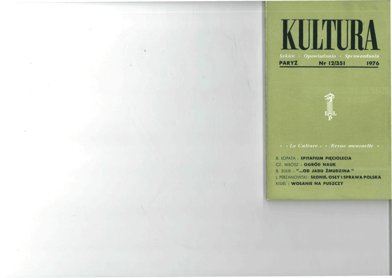 KULTURA PARYŻ La Culture Nr 12/351 » • Revue 1976 mensuelle • B. ŁOPATA : EPITAFIUM PIĘCIOLECIA CZ. MIŁOSZ : OGRÓD NAUK B. SULIK : "...OD JADU ŻMUDZINA " L. PERZANOWSKI : SŁONIE, OSŁY I SPRAWA POLSKA KISIEL : WOŁANIE NA PUSZCZY 1 SPIS RZECZY Bazyli Łopata: Czesław Miłosz: Bolesław Sulik: 3 47 35 Epitafium pięciolecia Ogród nauk „... Od jadu Żmudzina" ARCHIWUM POLITYCZNE Lucjan Perzanowski: Dominik Morawski: 66 70 Słonie, osły i Sprawa Polska Korespondencja z Rzymu K R A J Józef Kwaśny: Sally Boss: Kisiel: Divide et impera Jankeska na dworze króla Gierka . . Wołanie na puszczy: Proroctwa pogoda i polemiki 74 79 84 KUMJM • Sprawozdania Szkice • Opowiadania SĄSIEDZI Adam Kruczek: Ewa Norman: Włodzimierz Hrylcwski: W sowieckiej prasie Państwa Kowalskich podróż po krajach Kronika białoruska bratnich 88 95 99 PARYŻ Grudzień - Décembre 1976 SPRAWY I TROSKI Jerzy Jankowski: Uchodźcy — — Wiktor Sukiciiiiicki: Walne zebranie POSK'u Poltki Uniwersytet na Obczyźnie Rapperswilski Feniks M. Broński: Rozsądny z Francji Europy Wschodniej we .... 101 103 103 105 ^LRSITA^^X KSIĄŻKI — młody człowiek Nudvslune nowości wydawnicze 108 111 M ^/móTóGiAŚ^i^ • — Wydarzenia miesiąca 112 • Zofia Hertz: krajowy 118 do Redakcji 120 Humor • P.Bukraba, A.Dnrgns, W.IMużewski, M. Dolanowaki, gen. B. Duch: Listy • DOKUMENTY Biuletyn Nr 2 Komitetu Obrony Roholnikóio (KOR). — Komunikat Nr 2 KOR'u. — Komunikat Nr 3 KOR'u. — Oświadczenie KOR'u. — Pismo robotników „Ursusa" z komentarzem KOR'u. — /. Andrze jewski w niemieckiej telewizji. — Wyiviad z T. Mazowieckim. — Protesty icłoskie. — Wniosek KOR'u do Sejmu PRL. — List do Przewodniczącego Rady Państioa. — Kronika. — List do Andrieja Sacharowa. — Petycja Międzynar. Komitetu Robotn. — Komitet Solidarności francuskich intelektualistóio. — Apel Obywatelskiego Komitetu we Francji 125-160 INSTYTUT LITERACKI