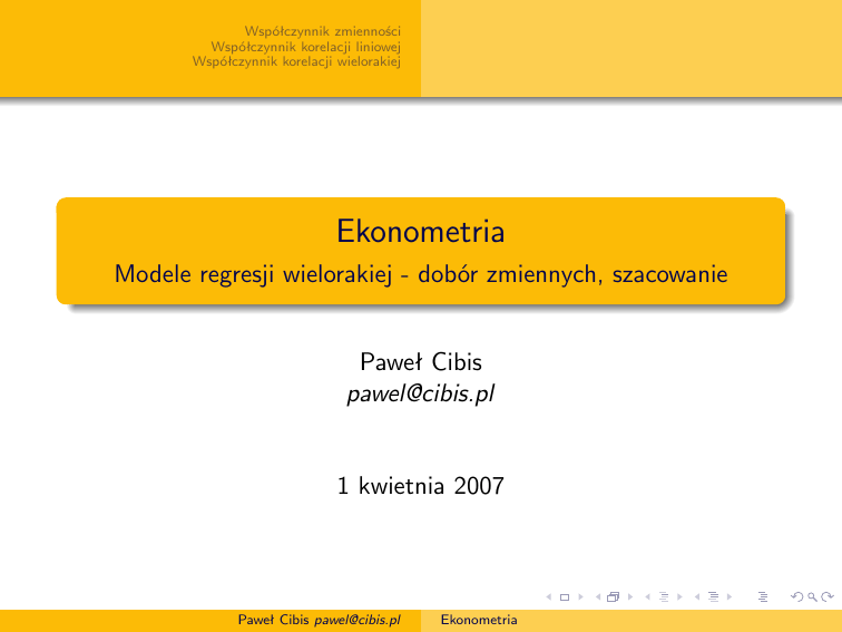 Współczynnik zmienności Współczynnik korelacji liniowej Współczynnik korelacji wielorakiej Ekonometria Modele regresji wielorakiej - dobór zmiennych, szacowanie Paweł Cibis [email protected] 1 kwietnia 2007 Paweł Cibis [email protected] Ekonometria Współczynnik zmienności Współczynnik korelacji liniowej Współczynnik korelacji wielorakiej 1 2 3 4 Współczynnik zmienności Współczynnik zmienności – wzory Współczynnik zmienności – funkcje Współczynnik korelacji liniowej Korelacja liniowa – wzory Korelacja liniowa – funkcje Excela Korelacja liniowa – funkcja Excela Korelacja liniowa – Analiza Danych Korelacja liniowa – Uzupełnianie przez transpozycję Współczynnik korelacji wielorakiej Współczynnik korelacji wielorakiej – wzór Współczynnik korelacji wielorakiej – funkcja Excela Współczynnik korelacji wielorakiej – funkcja Excela Estymacja – funkcja REGLINP Estymacja – Analiza danych Estymacja – Interpretacja parametrów struktury stochastycznej Literatura Paweł Cibis [email protected] Ekonometria Współczynnik zmienności Współczynnik korelacji liniowej Współczynnik korelacji wielorakiej 1 2 3 4 Współczynnik zmienności – wzory Współczynnik zmienności – funkcje Współczynnik zmienności Współczynnik zmienności – wzory Współczynnik zmienności – funkcje Współczynnik korelacji liniowej Korelacja liniowa – wzory Korelacja liniowa – funkcje Excela Korelacja liniowa – funkcja Excela Korelacja liniowa – Analiza Danych Korelacja liniowa – Uzupełnianie przez transpozycję Współczynnik korelacji wielorakiej Współczynnik korelacji wielorakiej – wzór Współczynnik korelacji wielorakiej – funkcja Excela Współczynnik korelacji wielorakiej – funkcja Excela Estymacja – funkcja REGLINP Estymacja – Analiza danych Estymacja – Interpretacja parametrów struktury stochastycznej Literatura Paweł Cibis [email protected] Ekonometria Współczynnik zmienności Współczynnik korelacji liniowej Współczynnik korelacji wielorakiej Współczynnik zmienności – wzory Współczynnik zmienności – funkcje Współczynniki zmienności Vj = Wj = 2 ∗ sj x¯j max xj − min xj max xj + min xj Vj < V ∗ Paweł Cibis [email protected] Ekonometria Współczynnik zmienności Współczynnik korelacji liniowej Współczynnik korelacji wielorakiej Współczynnik zmienności – wzory Współczynnik zmienności – funkcje Współczynniki zmienności – funkcje Excela sj = ODCH.STANDARD.POPUL(zakres) x¯j = ŚREDNIA(zakres) max xj = MAX(zakres) min xj = MIN(zakres) Paweł Cibis [email protected] Ekonometria Współczynnik zmienności Współczynnik korelacji liniowej Współczynnik korelacji wielorakiej Współczynnik zmienności – wzory Współczynnik zmienności – funkcje Współczynniki zmienności – funkcje Excela Paweł Cibis [email protected] Ekonometria Współczynnik zmienności Współczynnik korelacji liniowej Współczynnik korelacji wielorakiej 1 2 3 4 Korelacja liniowa – wzory Korelacja liniowa – funkcje Excela Macierz korelacji – funkcja Excela Macierz korelacji – Analiza Danych Macierz korelacji – Uzupełnianie przez transpozycję Współczynnik zmienności Współczynnik zmienności – wzory Współczynnik zmienności – funkcje Współczynnik korelacji liniowej Korelacja liniowa – wzory Korelacja liniowa – funkcje Excela Korelacja liniowa – funkcja Excela Korelacja liniowa – Analiza Danych Korelacja liniowa – Uzupełnianie przez transpozycję Współczynnik korelacji wielorakiej Współczynnik korelacji wielorakiej – wzór Współczynnik korelacji wielorakiej – funkcja Excela Współczynnik korelacji wielorakiej – funkcja Excela Estymacja – funkcja REGLINP Estymacja – Analiza danych Estymacja – Interpretacja parametrów struktury stochastycznej Literatura Paweł Cibis [email protected] Ekonometria Współczynnik zmienności Współczynnik korelacji liniowej Współczynnik korelacji wielorakiej Korelacja liniowa – wzory Korelacja liniowa – funkcje Excela Macierz korelacji – funkcja Excela Macierz korelacji – Analiza Danych Macierz korelacji – Uzupełnianie przez transpozycję Współczynnik korelacji liniowej Pearsona Pn rxy = qP i=1 (xi n i=1 (xi − x̄) (yi − ȳ ) 2 Pn − x̄) i=1 (yi − ȳ )2 = Cov (X , Y ) sx s y H0 :rxy = 0 H1 :rxy 6= 0 lub H1 :rxy < 0 lub H1 :rxy > 0 t=q √ |rxy | 2 1 − rxy Paweł Cibis [email protected] n−2 Ekonometria Współczynnik zmienności Współczynnik korelacji liniowej Współczynnik korelacji wielorakiej Korelacja liniowa – wzory Korelacja liniowa – funkcje Excela Macierz korelacji – funkcja Excela Macierz korelacji – Analiza Danych Macierz korelacji – Uzupełnianie przez transpozycję Współczynnik korelacji liniowej – funkcje Excela rxy = WSP.KORELACJI(zakres 1;zakres 2) |x| = MODUŁ.LICZBY(zmienna) √ x = PIERWIASTEK(zmienna) tα = ROZKŁAD.T.ODW(alfa;n − 2) tα = ROZKŁAD.T.ODW(2*alfa;n − 2) Paweł Cibis [email protected] Ekonometria H1 obustronna H1 jednostronna Współczynnik zmienności Współczynnik korelacji liniowej Współczynnik korelacji wielorakiej Korelacja liniowa – wzory Korelacja liniowa – funkcje Excela Macierz korelacji – funkcja Excela Macierz korelacji – Analiza Danych Macierz korelacji – Uzupełnianie przez transpozycję Macierz współczynników korelacji – funkcja Excela 1 2 3 4 5 6 Zapisz wartości obserwacji zmiennych w sąsiednich kolumnach (w pierwszej zmienną objaśnianą, o ile istnieje taka potrzeba) Znajdź pusty fragment arkusza o wymiarach N na N, gdzie N to liczba wszystkich zmiennych W lewej górnej komórce arkusza wpisz funkcję =WSP.KORELACJI() – pierwszy argument to zakres obserwacji pierwszej zmiennej, drugi to zakres obserwacji zmiennej o numerze odpowiadającym numerowi wiersza budowanej macierzy (w tym przypadku jest to również pierwsza zmienna) Najedź kursorem na drugi argument w formule i naciśnij F4 (blokowanie z