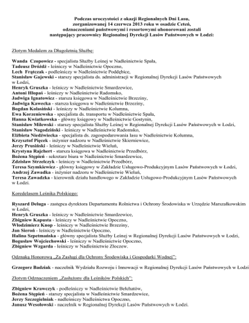 Podczas uroczystości z okazji Regionalnych Dni Lasu, zorganizowanej 14 czerwca 2013 roku w osadzie Ceteń, odznaczeniami państwowymi i resortowymi uhonorowani zostali następujący pracownicy Regionalnej Dyrekcji Lasów Państwowych w Łodzi: Złotym Medalem za Długoletnią Służbę: Wanda Czopowicz - specjalista Służby Leśnej w Nadleśnictwie Spała, Tadeusz Dróżdż - leśniczy w Nadleśnictwie Opoczno, Lech Frątczak - podleśniczy w Nadleśnictwie Poddębice, Stanisław Gajewski - starszy specjalista ds. administracji w Regionalnej Dyrekcji Lasów Państwowych w Łodzi, Henryk Gruszka - leśniczy w Nadleśnictwie Smardzewice, Antoni Hłopaś - leśniczy w Nadleśnictwie Radomsko, Jadwiga Ignatowicz - starsza księgowa w Nadleśnictwie Brzeziny, Jadwiga Kawecka - starsza księgowa w Nadleśnictwie Brzeziny, Bogdan Kolasiński - leśniczy w Nadleśnictwie Kolumna, Ewa Korzeniewska - specjalista ds. transportu w Nadleśnictwie Spała, Hanna Kwiatkowska - główny księgowy w Nadleśnictwie Gostynin, Stanisław Milewski - starszy specjalista Służby Leśnej w Regionalnej Dyrekcji Lasów Państwowych w Łodzi, Stanisław Nagodziński - leśniczy w Nadleśnictwie Radomsko, Elżbieta Niedźwiecka - specjalista ds. zagospodarowania lasu w Nadleśnictwie Kolumna, Krzysztof Pięcek - inżynier nadzoru w Nadleśnictwie Skierniewice, Jerzy Prusiński - leśniczy w Nadleśnictwie Wieluń, Krystyna Rajchert - starsza księgowa w Nadleśnictwie Przedbórz, Bożena Stępień - sekretarz biura w Nadleśnictwie Smardzewice, Zdzisław Strzelczyk - leśniczy w Nadleśnictwie Przedbórz, Teresa Szymkiewicz - główny księgowy w Zakładzie Usługowo-Produkcyjnym Lasów Państwowych w Łodzi, Andrzej Zawadka - inżynier nadzoru w Nadleśnictwie Wieluń, Teresa Zawadzka - kierownik działu handlowego w Zakładzie Usługowo-Produkcyjnym Lasów Państwowych w Łodzi. Koredelasem Leśnika Polskiego: Ryszard Deluga - zastępca dyrektora Departamentu Rolnictwa i Ochrony Środowiska w Urzędzie Marszałkowskim w Łodzi, Henryk Gruszka - leśniczy w Nadleśnictwie Smardzewice, Zbigniew Kapusta - leśniczy w Nadleśnictwie Opoczno, Włodzimierz Knop - leśniczy w Nadleśnictwie Brzeziny, Jan Sieroń - leśniczy w Nadleśnictwie Opoczno, Halina Szpetmańska - główny specjalista Służby Leśnej w Regionalnej Dyrekcji Lasów Państwowych w Łodzi, Bogusław Wojciechowski - leśniczy w Nadleśnictwie Opoczno, Zbigniew Wzgarda - leśniczy w Nadleśnictwie Złoczew. Odznaką Honorową „Za Zasługi dla Ochrony Środowiska i Gospodarki Wodnej”: Grzegorz Badziak - naczelnik Wydziału Rozwoju i Innowacji w Regionalnej Dyrekcji Lasów Państwowych w Łodzi Złotym Odznaczeniem „Zasłużony dla Leśników Polskich”: Zbigniew Krawczyk - podleśniczy w Nadleśnictwie Bełchatów, Bożena Stępień - starszy specjalista w Nadleśnictwie Smardzewice, Jerzy Szczegielniak - nadleśniczy Nadleśnictwa Opoczno, Janusz Wesołowski - naczelnik w Regionalnej Dyrekcji Lasów Państwowych w Łodzi. Srebrnym Odznaczeniem „Zasłużony dla Leśników Polskich”: Barbara Bernat - starszy specjalista w Nadleśnictwie Brzeziny, Bożena Bielecka - starszy księgowy w Nadleśnictwie Opoczno, Barbara Faszczewska - Zakład Usługowo-Produkcyjny Lasów Państwowych w Łodzi, Emil Janicki - starszy specjalista Służby Leśnej w Regionalnej Dyrekcji Lasów Państwowych w Łodzi, Witold Kowalski - leśniczy w Nadleśnictwie Skierniewice, Paweł Lipiński - podleśniczy Nadleśnictwa Poddębice. Brązowym Odznaczeniem „Zasłużony dla Leśników Polskich”: Jan Bielecki - podleśniczy w Nadleśnictwie Opoczno, Zdzisław Matuszczak - podleśniczy w Nadleśnictwie Opoczno, Mariusz Milewski - specjalista w Nadleśnictwie Kolumna, Sylwester Racz - podleśniczy w Nadleśnictwie Brzeziny, Przemysław Wysocki - specjalista Służby Leśnej w Nadleśnictwie Wieluń, Anna Szczęsna - księgowa w Nadleśnictwie Skierniewice. Złotą Odznaką Honorową Stowarzyszenia Inżynierów i Techników Leśnictwa i Drzewnictwa: Krzysztof Kortus z Nadleśnictwa Łąck Witold Jajor z Nadleśnictwa Łąck Srebrną Odznaką Honorową Stowarzyszenia Inżynierów i Techników Leśnictwa i Drzewnictwa: Paweł Stańczak z Nadleśnictwa Łąck