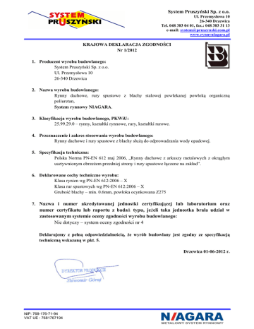 System Pruszyński Sp. z o.o. Ul. Przemysłowa 10 26-340 Drzewica Tel. 048 383 04 01, fax.: 048 383 31 13 e-mail: [email protected] www.rynnyniagara.pl KRAJOWA DEKLARACJA ZGODNOŚCI Nr 1/2012 1. Producent wyrobu budowlanego: System Pruszyński Sp. z o.o. Ul. Przemysłowa 10 26-340 Drzewica 2. Nazwa wyrobu budowlanego: Rynny dachowe, rury spustowe z blachy stalowej powlekanej powłoką organiczną poliuretan, System rynnowy NIAGARA. 3. Klasyfikacja wyrobu budowlanego, PKWiU: 25.99.29.0 – rynny, kształtki rynnowe, rury, kształtki rurowe. 4. Przeznaczenie i zakres stosowania wyrobu budowlanego: Rynny dachowe i rury spustowe z blachy służą do odprowadzania wody opadowej. 5. Specyfikacja techniczna: Polska Norma PN-EN 612 maj 2006, „Rynny dachowe z arkuszy metalowych z okrągłym usztywnionym obrzeżem przedniej strony i rury spustowe łączone na zakład”. 6. Deklarowane cechy techniczne wyrobu: Klasa rynien wg PN-EN 612:2006 – X Klasa rur spustowych wg PN-EN 612:2006 – X Grubość blachy – min. 0.6mm, powłoka ocynkowana Z275 7. Nazwa i numer akredytowanej jednostki certyfikującej lub laboratorium oraz numer certyfikatu lub raportu z badań typu, jeżeli taka jednostka brała udział w zastosowanym systemie oceny zgodności wyrobu budowlanego: Nie dotyczy – system oceny zgodności nr 4 Deklarujemy z pełną odpowiedzialnością, że wyrób budowlany jest zgodny ze specyfikacją techniczną wskazaną w pkt. 5. Drzewica 01-06-2012 r. NIP: 768-176-71-94 VAT UE : 7681767194