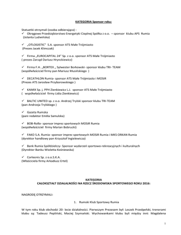 KATEGORIA Sponsor roku: Statuetki otrzymali (osoba odbierająca) : Okręgowe Przedsiębiorstwo Energetyki Cieplnej Spółka z o.o. – sponsor klubu APS Rumia (Jolanta Ludwińska) „OTLOGISTIC” S.A. sponsor ATS Małe Trójmiasto (Prezes Jacek Klimczak) Firma „EUROCAPITAL 24” Sp. z o.o. sponsor ATS Małe Trójmiasto ( prezes Zarząd Dariusz Hrynckiewicz) Firma F.H. „BORTEX „ Sylwester Borkowski- sponsor klubu TRI- TEAM (współwłaściciel firmy pan Mariusz Musińskiego ) DECATHLON Rumia- sponsor ATS Małe Trójmiasto i MOSiR (Prezes ATS Jarosław Przyborowskiego ) KAMIX Sp. j. PPH Zienkiewicz L.J. sponsor ATS Małe Trójmiasto ( współwłaściciel firmy Lidia Zienkiewicz) BALTIC UNITED sp. z o.o. Andrzej Trylski sponsor klubu TRI-TEAM (pan Andrzeja Trylskiego ) Gazeta Rumska (pani redaktor Emilia Samulska) BOB-Rollo- sponsor imprez sportowych MOSiR Rumia (współwłaściciel firmy Marian Bobrucki) FAKO S.A. Rumia- sponsor imprez sportowych MOSiR Rumia i MKS ORKAN Rumia (dyrektor handlowy pan Krzysztof Ingielewicza) Bank Rumia Spółdzielczy- Sponsor wydarzeń sportowo-rekreacyjnych i kulturalnych (Dyrektor Banku Wioletta Kośniewska) Corleonis Sp. z o.o.S.K.A. (Właściciela firmy Arkadiusz Ertel) KATEGORIA CAŁOKSZTAŁT DZIAŁALNOŚCI NA RZECZ ŚRODOWISKA SPORTOWEGO ROKU 2016: NAGRODĘ OTRZYMALI: 1. Rumski Klub Sportowy Rumia W tym roku klub obchodzi 20- lecie działalności. Pierwszym Prezesem był: Leszek Przedpełski, trenerami klubu są: Tadeusz Pepliński, Maciej Szymański. Wychowankami klubu byli między inni: Magdalena 1 Zdrojewska, Jakub Ciskowski, Marta Jeschke, Adam Falkowski, Katerina Thomaidu, Aleksandra Dżugan, Joanna Walas, Joanna Dżugan, Alicja Doczekalska, Nina Piesik. Trenerem był również Piotr Taube. 2. UKS „SIÓDEMKA” Rumia W tym roku klub obchodzi 20- lecie działalności. Trenerzy i instruktorzy oraz działacze UKS „Siódemka” Rumia zajmują się szkoleniem dzieci i młodzieży w biegu na orientację. W roku 2016 roku trenowało 84 zawodniczek i zawodników. Efektem wieloletniej działalności klubu było przyznanie organizacji Mistrzostw Świata Juniorów w Biegu na Orientację. KATEGORIA SPORTOWO-ARTYSTYCZNA PROMOCJA MIASTA NA ARENIE MIĘDZYNARODOWEJ W 2016: NAGRODĘ OTRZYMAŁ: UKS MASTA DANCE Grupa CZAROWNICE reprezentująca Uczniowski Klub Sportowy „Masta Dance” zdobyły Mistrzostwo Europy, Wicemistrzostwo i 2 II Wicemistrzostwa w kategorii contemporary showcases juveniles, jazz dance showcases juveniles. KATEGORIA SPORTOWA PROMOCJA MIASTA RUMI W 2016: NAGRODĘ OTRZYMAŁO: GIMNAZJUM NR1 Za zajęcie II miejsca we Współzawodnictwie Szkół Gimnazjalnych Województwa Pomorskiego KATEGORIA SPORTOWE WYDARZENIE ROKU 2016 OTRZYMALI: 1. Fundacja FOR DREAM w Rumi za organizację: II Pucharu Świata Zawodowców w Armwrestlingu oraz II Pucharu Świata w Siłowaniu na Ręce Osób Niepełnosprawnych. 2. Rugby Klub Arka Rumia za pokazowy mecz Rugby na wózkach „z nami nie ma ograniczeń”. 3. MKS Orkan Rumia za organizację Festynu Sportowo – rekreacyjnego z okazji obchodów 40-lecia działalności klubu. 4. Akademia Tenisa stołowego Małe Trójmiasto za organizację II Memoriału Jerzego Zienkiewicza w tenisie stołowym. 5. Taneczny Klub Sportowy CREATIVE DANCE RUMIA za organizację GRAND PRIX POLSKI i IV OGÓLNOPOLSKI TURNIEJ O PUCHAR BURMISTRZA MIASTA RUMI. 2 KATEGORIA „NAJLEPIEJ ZAPOWIADAJĄCY SIĘ SPORTOWIEC MŁODEGO POKOLENIA” NAGRODY OTRZYMALI: 1. ZUZANNA SADOWSKA Zawodniczka Rugby Klub Arka Rumia, powołana do Kadry Narodowej Kobiet U16. Zdobyła II i III Miejsce Młodzieżowym Turnieju Beach Rugby Gdynia. Prosimy o podejście Zuzannę Sadowską 2. WERONIKA KONEFKA Siatkarka, czołowa zawodniczka młodziczek APS RUMIA. Prosimy o podejście Weronikę Konefkę 3. NATALIA MŁODAK Zawodniczka RKS RUMIA, lekkoatletka uprawiająca bieg 200 metrów przez płotki. Prosimy o podejście Natalię Młodak 4. DAWID ZAWIDOWSKI Zawodnik kickboxingu Klubu Champion Gdańsk, srebrny medalista Pucharu Europy w kickboxingu. Prosimy o podejście Dawida Zawidowskiego 5. DOMINIK BIELAWA zawodnik TRI TEAM – uprawia pływanie na dystansach 100 i 200 metrów stylem klasycznym. Członek Kadry narodowej Polski juniorów młodszych. Zdobył srebrny i brązowy medal Mistrzostwach Polski Juniorów Młodszych stylem klasycznym. Prosimy o podejście Dominika Bielawę 6. GRZEGORZ ŻUREK Zawodnik UKS SIÓDEMKA, Mistrz Polski w biegu sztafetowym juniorów młodszych i w biegu dystansowym M16. Członek Kadry Polski Juniorów. Prosimy o podejście Grzegorza Żurek. KATEGORIA „ DRUŻYNA ROKU” NAGRODĘ OTRZYMAŁ: Zespół młodziczek Akademii Piłki Siatkowej Rumia. Zdobywczynie Mistrzostwa Polski Młodziczek w Piłce Siatkowej. KATEGORIA SPORTOWA OSOBOWOŚĆ ROKU 2016: NAGRODY OTRZYMALI: Jolanta Król – za całokształt działalności na rzecz sportu i rekreacji , menager sportu z 30-letnim stażem pracy w MOSiR, działacz SL SALOS Rumia od 21 lat. Jan Nowicki pełniący funkcję Dyrektora MOSiR Rumia od 29lat, Prezes TKKF „ORZEŁ” aktywnie działający na rzecz rozwoju tenisa ziemnego w Rumi 3 KATEGORIA Dla Niepełnosprawnego Sportowca Roku 2016: NAGRODĘ OTRZYMAŁ: KONRAD KRAWCZUK Zawodnik Gdyńskiego Klubu „Złoty Tur”, który zajął piąte miejsce w siłowaniu na lewą i prawą rękę w Pucharze Świata w siłowaniu na ręce Osób Niepełnosprawnych. WYRÓŻNIENIE SPECJALNE ZA AWANS DRUŻYNY PIŁKI NOŻNEJ DO IV LIGI W SEZONIE 2015/2016 NAGRODĘ OTRZYMAŁ: Miejski Klub Sportowy ORKAN RUMIA. W KATEGORII „ NAJLEPSZA SZKOŁA WE WSPÓŁZAWODNICTWIE SPORTOWYM SZKÓŁ PODSTAWOWYCH WOJEWÓDZTWA POMORSKIEGO W ROKU SZKOLNYM 2015/2016” NAGRODĘ OTRZYMAŁA SZKOŁA PODSTWOWA NR 9 zajęła w punktacji Wojewódzkiej Szkół Podstawowych 73 miejsce zdobywając 79 punktów na 395 sklasyfikowane szkół W KATEGORII „ NAJLEPSZA SZKOŁA WE WSPÓŁZAWODNICTWIE SPORTOWYM SZKÓŁ GIMNAZJALNYCH WOJEWÓDZTWA POMORSKIEGO W ROKU SZKOLNYM 2015/2016” NAGRODĘ OTRZ