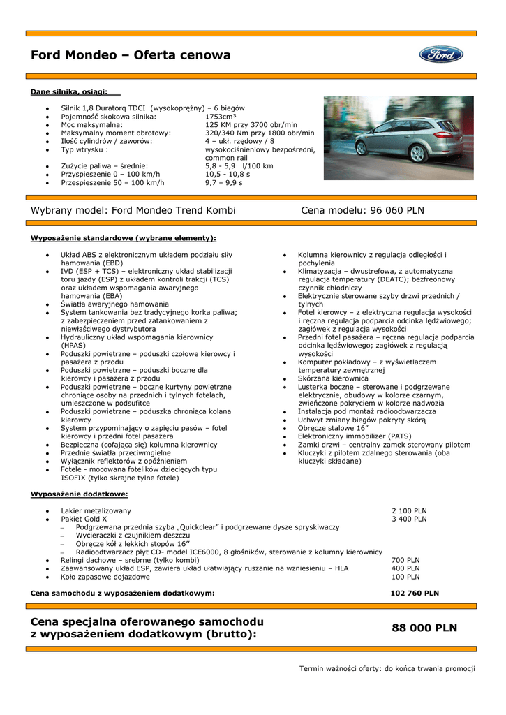 Ford Mondeo – Oferta cenowa Dane silnika, osiągi: Silnik 1,8 Duratorq TDCI (wysokoprężny) – 6 biegów Pojemność skokowa silnika: 1753cm³ Moc maksymalna: 125 KM przy 3700 obr/min Maksymalny moment obrotowy: 320/340 Nm przy 1800 obr/min Ilość cylindrów / zaworów: 4 – ukł. rzędowy / 8 Typ wtrysku : wysokociśnieniowy bezpośredni, common rail Zużycie paliwa – średnie: 5,8 - 5,9 l/100 km Przyspieszenie 0 – 100 km/h 10,5 - 10,8 s Przespieszenie 50 – 100 km/h 9,7 – 9,9 s Wybrany model: Ford Mondeo Trend Kombi Cena modelu: 96 060 PLN Wyposażenie standardowe (wybrane elementy): Układ ABS z elektronicznym układem podziału siły hamowania (EBD) IVD (ESP + TCS) – elektroniczny układ stabilizacji toru jazdy (ESP) z układem kontroli trakcji (TCS) oraz układem wspomagania awaryjnego hamowania (EBA) Światła awaryjnego hamowania System tankowania bez tradycyjnego korka paliwa; z zabezpieczeniem przed zatankowaniem z niewłaściwego dystrybutora Hydrauliczny układ wspomagania kierownicy (HPAS) Poduszki powietrzne – poduszki czołowe kierowcy i pasażera z przodu Poduszki powietrzne – poduszki boczne dla kierowcy i pasażera z przodu Poduszki powietrzne – boczne kurtyny powietrzne chroniące osoby na przednich i tylnych fotelach, umieszczone w podsufitce Poduszki powietrzne – poduszka chroniąca kolana kierowcy System przypominający o zapięciu pasów – fotel kierowcy i przedni fotel pasażera Bezpieczna (cofająca się) kolumna kierownicy Przednie światła przeciwmgielne Wyłącznik reflektorów z opóźnieniem Fotele - mocowana fotelików dziecięcych typu ISOFIX (tylko skrajne tylne fotele) Kolumna kierownicy z regulacja odległości i pochylenia Klimatyzacja – dwustrefowa, z automatyczna regulacja temperatury (DEATC); bezfreonowy czynnik chłodniczy Elektrycznie sterowane szyby drzwi przednich / tylnych Fotel kierowcy – z elektryczna regulacja wysokości i ręczna regulacja podparcia odcinka lędźwiowego; zagłówek z regulacja wysokości Przedni fotel pasażera – ręczna regulacja podparcia odcinka lędźwiowego; zagłówek z regulacją wysokości Komputer pokładowy – z wyświetlaczem temperatury zewnętrznej Skórzana kierownica Lusterka boczne – sterowane i podgrzewane elektrycznie, obudowy w kolorze czarnym, zwieńczone pokryciem w kolorze nadwozia Instalacja pod montaż radioodtwarzacza Uchwyt zmiany biegów pokryty skórą Obręcze stalowe 16” Elektroniczny immobilizer (PATS) Zamki drzwi – centralny zamek sterowany pilotem Kluczyki z pilotem zdalnego sterowania (oba kluczyki składane) Wyposażenie dodatkowe: Lakier metalizowany Pakiet Gold X Podgrzewana przednia szyba „Quickclear” i podgrzewane dysze spryskiwaczy Wycieraczki z czujnikiem deszczu Obręcze kół z lekkich stopów 16’’ Radioodtwarzacz płyt CD- model ICE6000, 8 głośników, sterowanie z kolumny kierownicy Relingi dachowe – srebrne (tylko kombi) Zaawansowany układ ESP, zawiera układ ułatwiający ruszanie na wzniesieniu – HLA Koło zapasowe dojazdowe 2 100 PLN 3 400 PLN 700 PLN 400 PLN 100 PLN Cena samochodu z wyposażeniem dodatkowym: 102 760 PLN Cena specjalna oferowanego samochodu z wyposażeniem dodatkowym (brutto): 88 000 PLN Termin ważności oferty: do końca trwania promocji